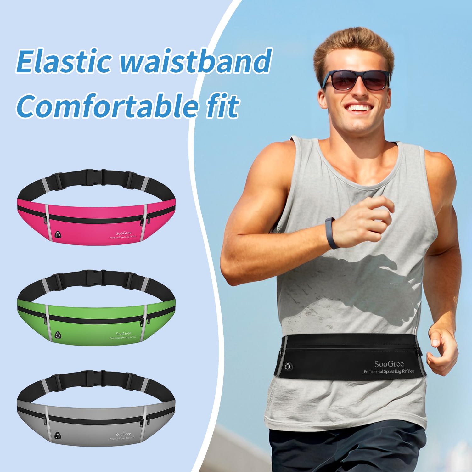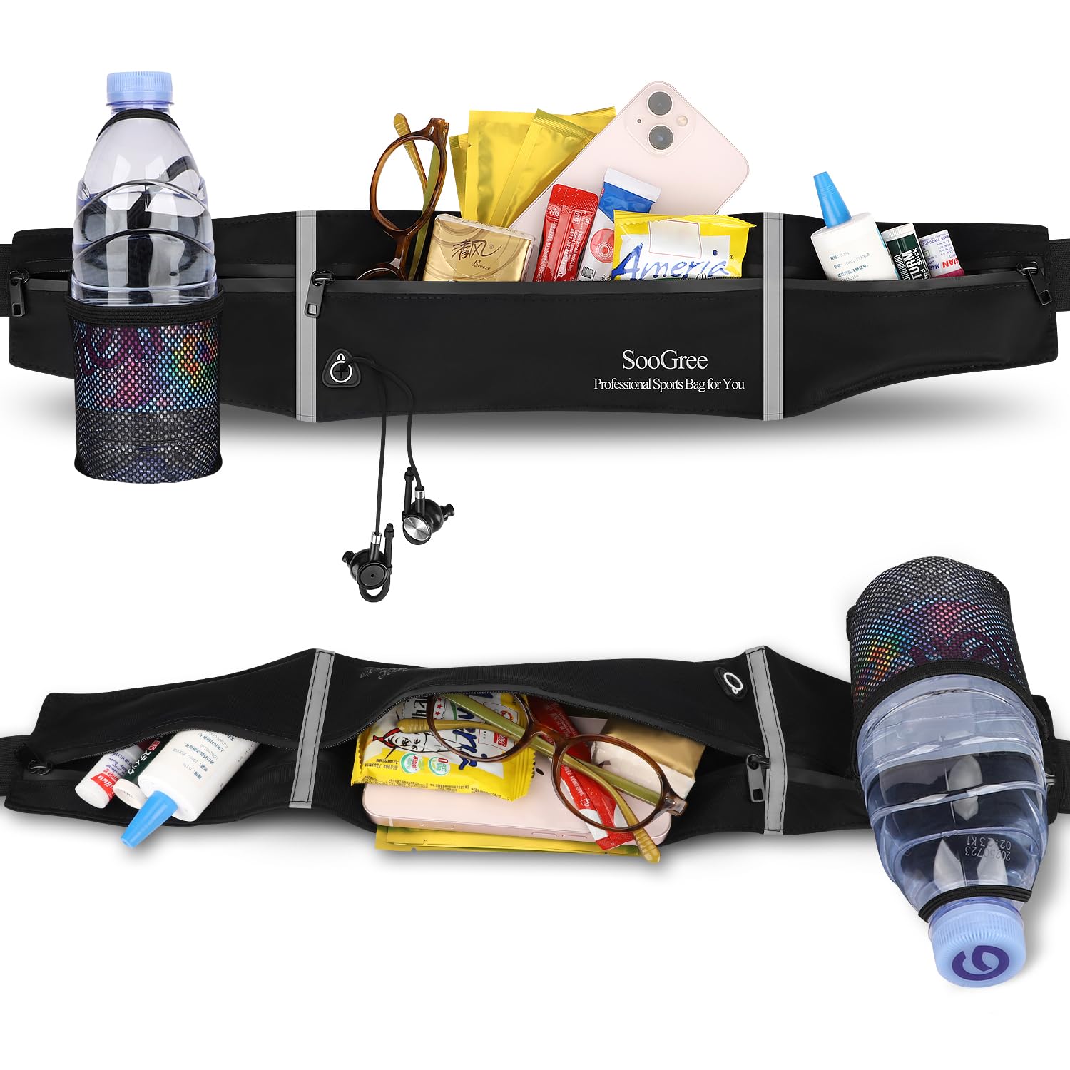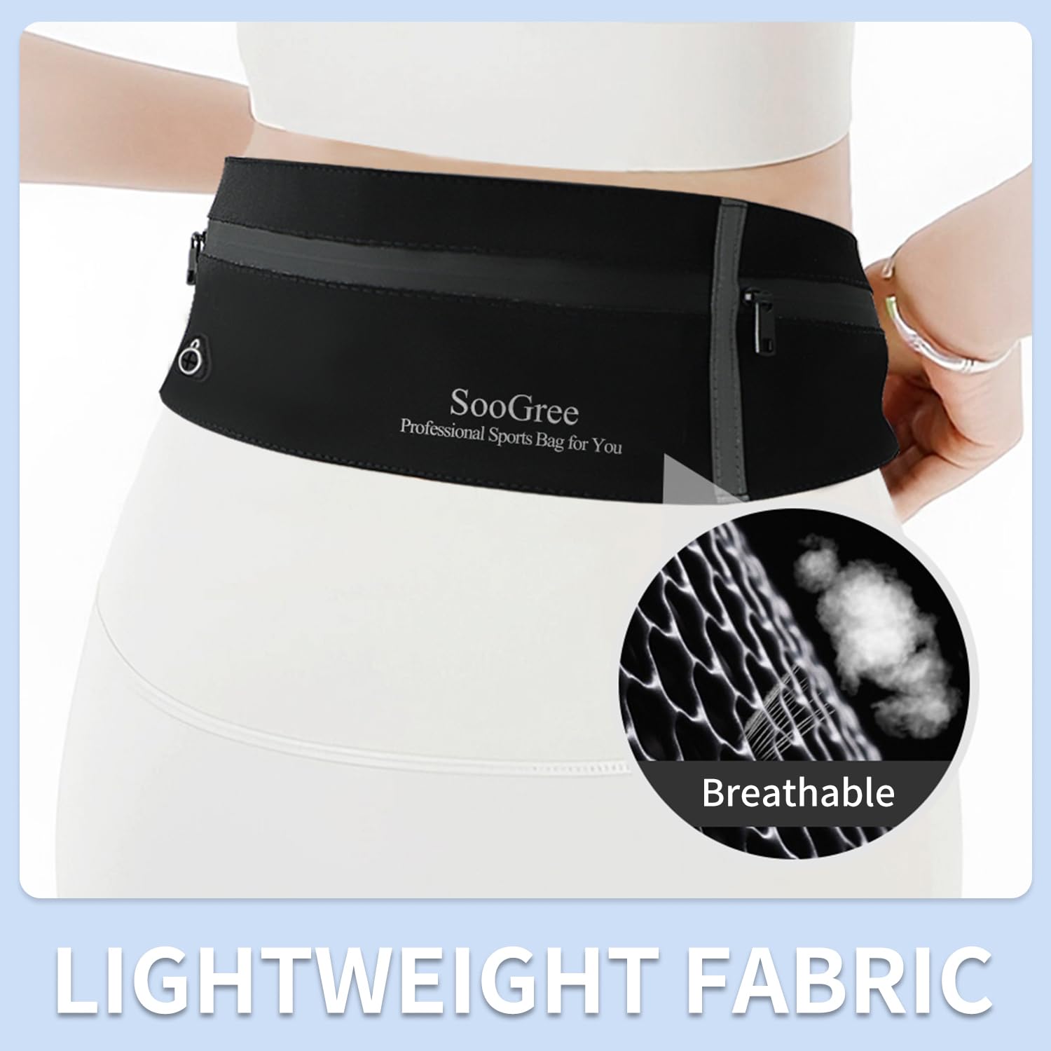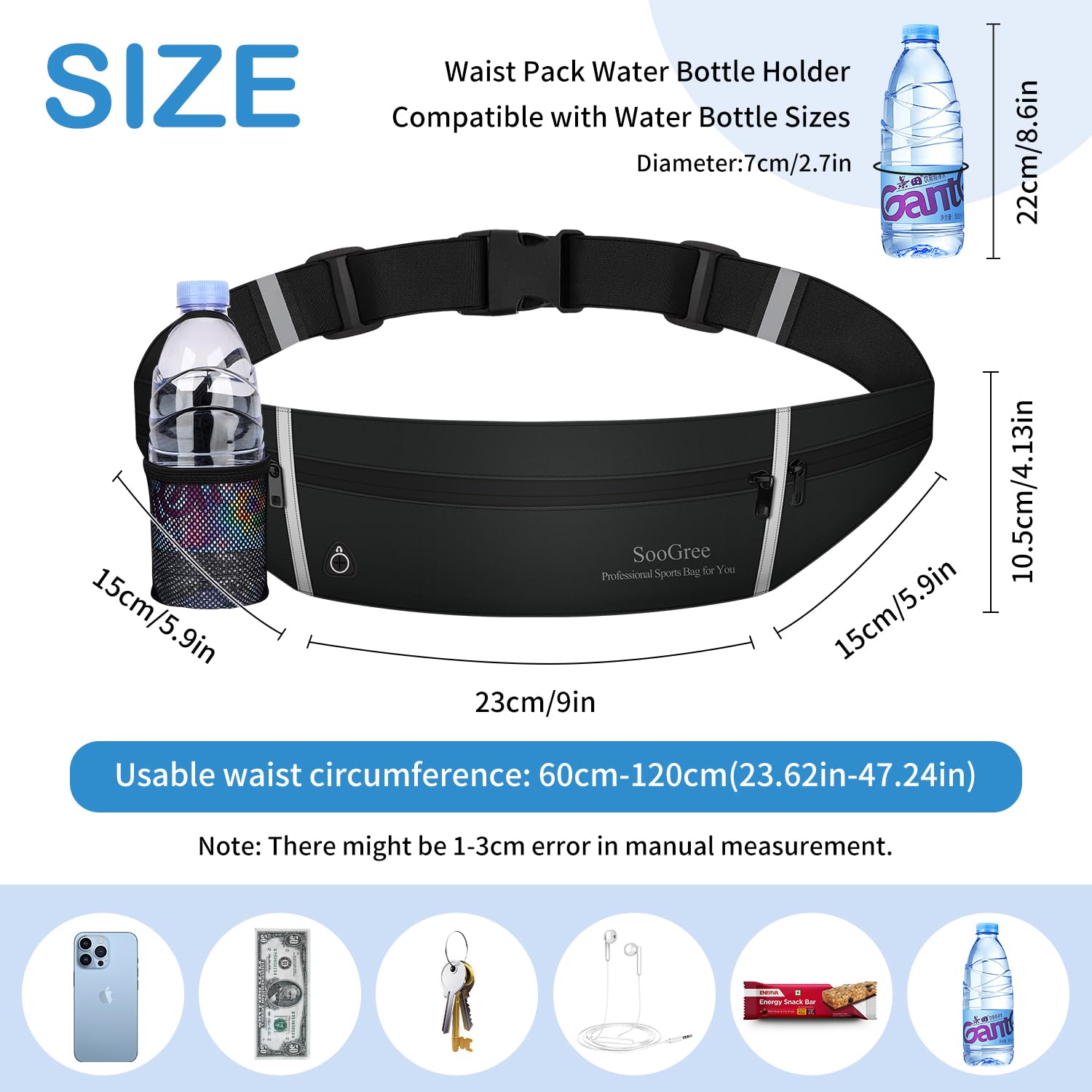 【Innovative Adjustable Design】Featuring a high-quality elastic waistband complemented by Two controllable buckles allow easy access to adjust the belt's length to fit your waist. SooGree waist pack ensures a perfect fit for waist sizes between 25 to 45 inches (68cm-120cm). Suitable for both men and women, ideal for family members. The running fanny pack has a special HEADPHONE HOLE design, you can enjoy music all the time.
