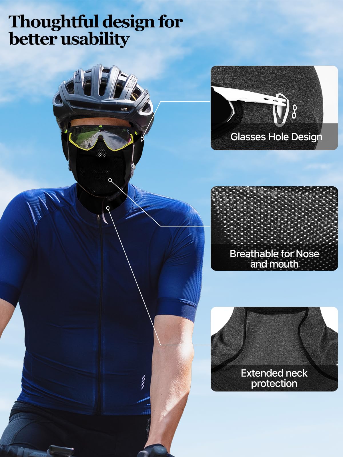 Breathable & Glasses holes:The extended cycling balaclava equipped with glasses holes,widen eye area which making your view clearer and riding safer. The breathable holes around the mouth and nose enhance ventilation. Four-needle, six-thread ensures durability and comfort, reducing friction when daily cycling or long-distance journeys
