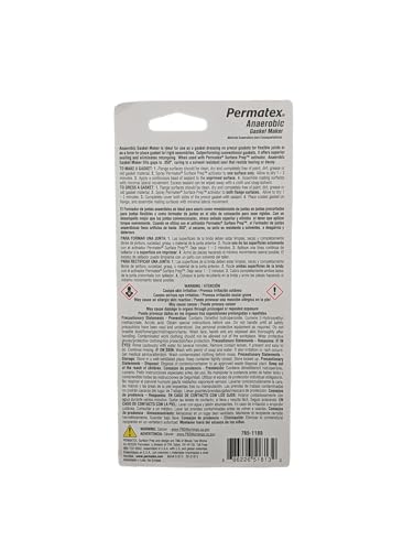 Permatex Anaerobic Gasket Maker is designed primarily for use on aluminum, iron, and steel flanged mating surfaces. This non-corrosive gasketing material is ideal for on-the-spot and emergency repairs, or when a conventional gasket is unavailable. Fills gaps up to .015 inches and cures to a solvent-resistant seal that will not tear or decay during service. Parts disassemble easily even after extended service and old gasket material can be removed in minutes with a simple putty knife. Suggested applications include water pumps, thermostat housings, transmission pans, transmission case covers, transaxle casings, and o-ring replacement.