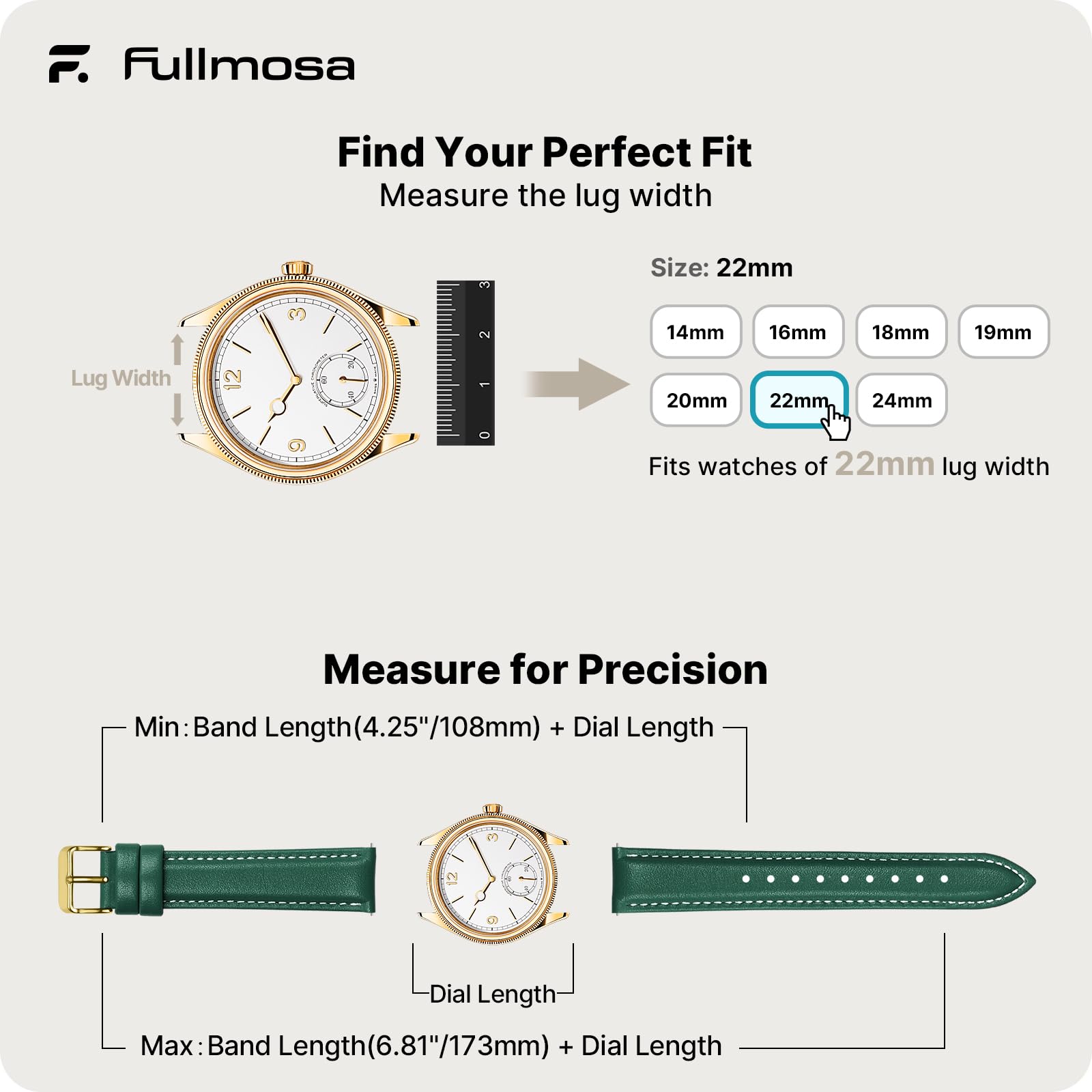 [Adjustable and Perfect Fit] Designed to fit almost any wrist.These 22mm watch bands fit wrist (4.25"+dial length)--(6.81"+dial length).11 (22mm) precision cut eyelets allow for individualized adjustment to achieve the perfect fit.Before you order, measure the breadth of your watch lugs.