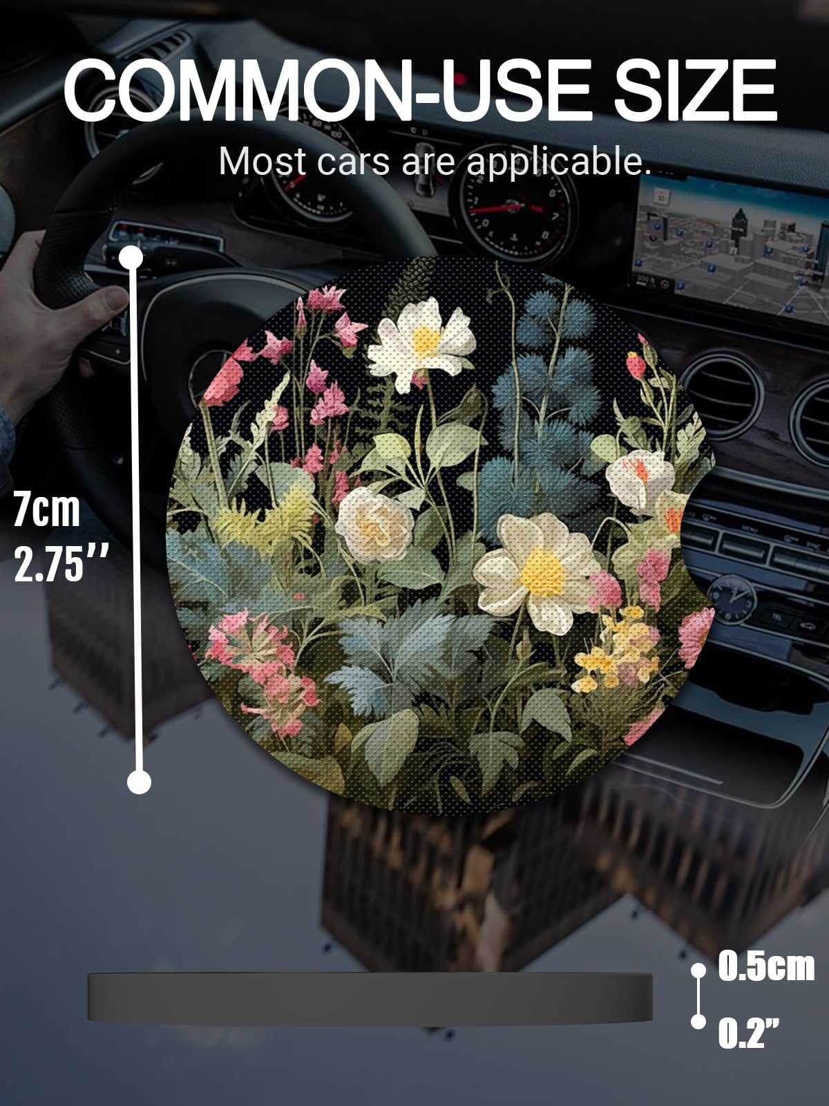 Diameter 2.75 inch, thick 0.2inch.These car cup holder coasters are general dimensions. We suggest that you measure your size to make sure it matches