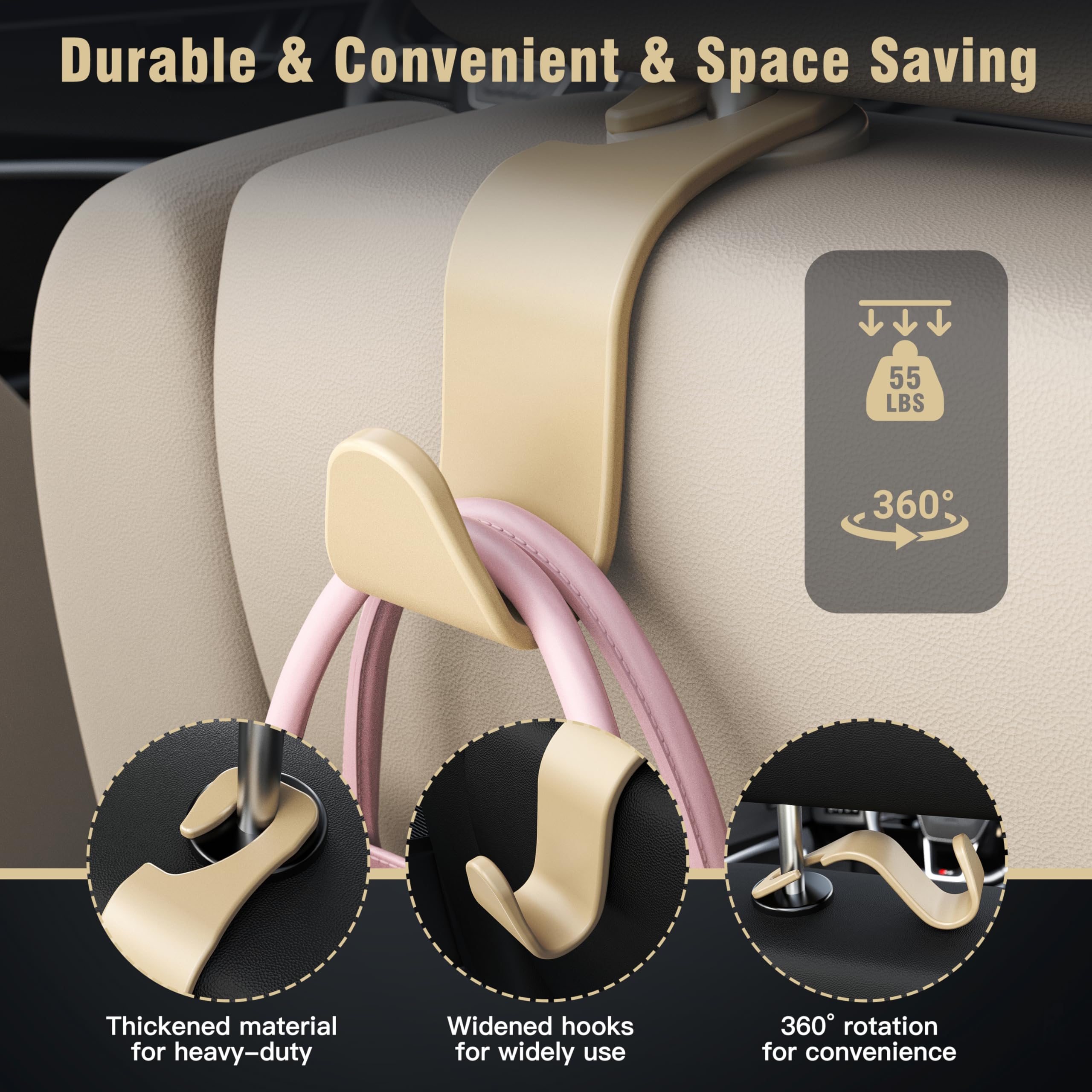 Easy to install: easy remove, easy installation. The car headrest hook with simple design, do not need to take off the headrest, no tools required. Each item can hold up to 55 lb (25kg)