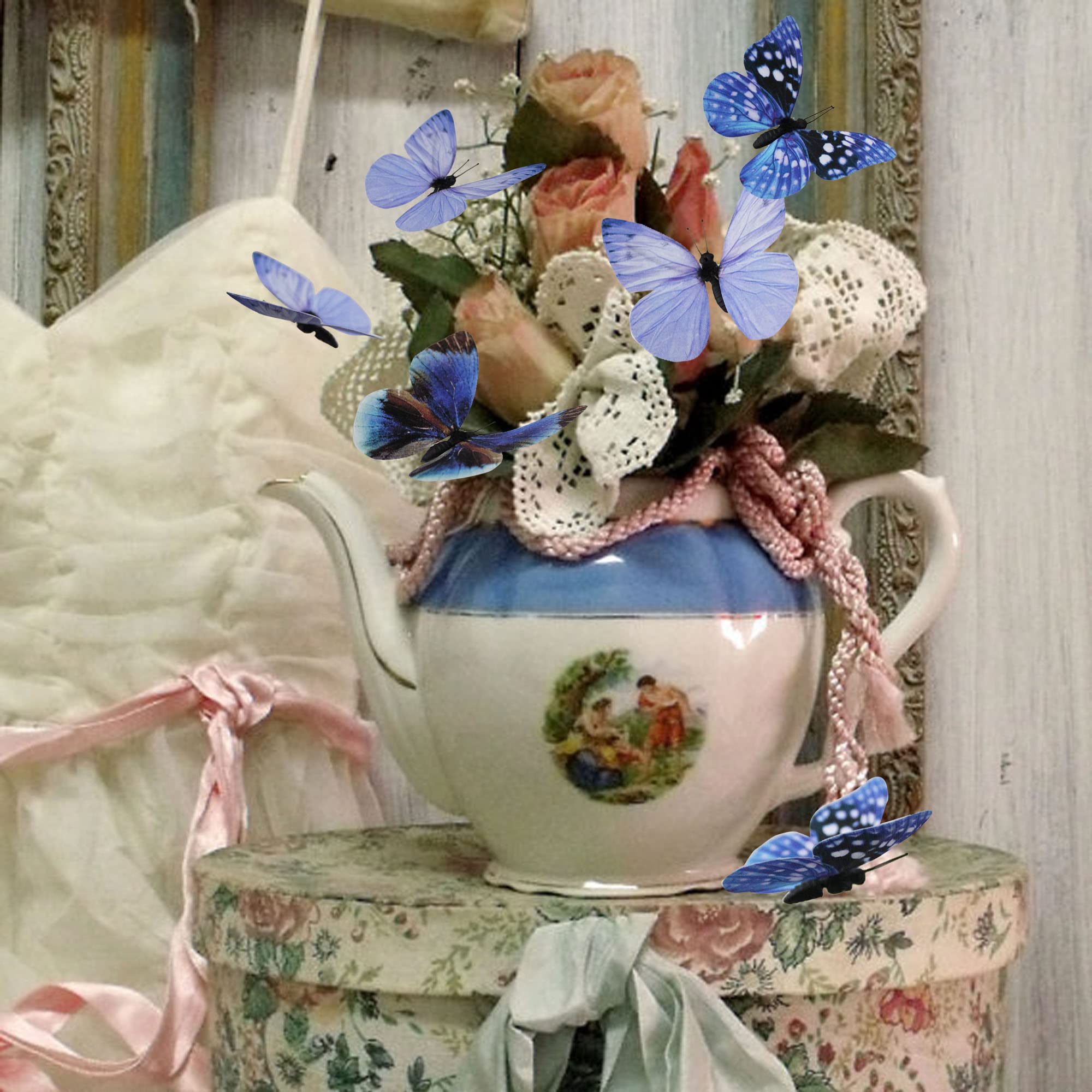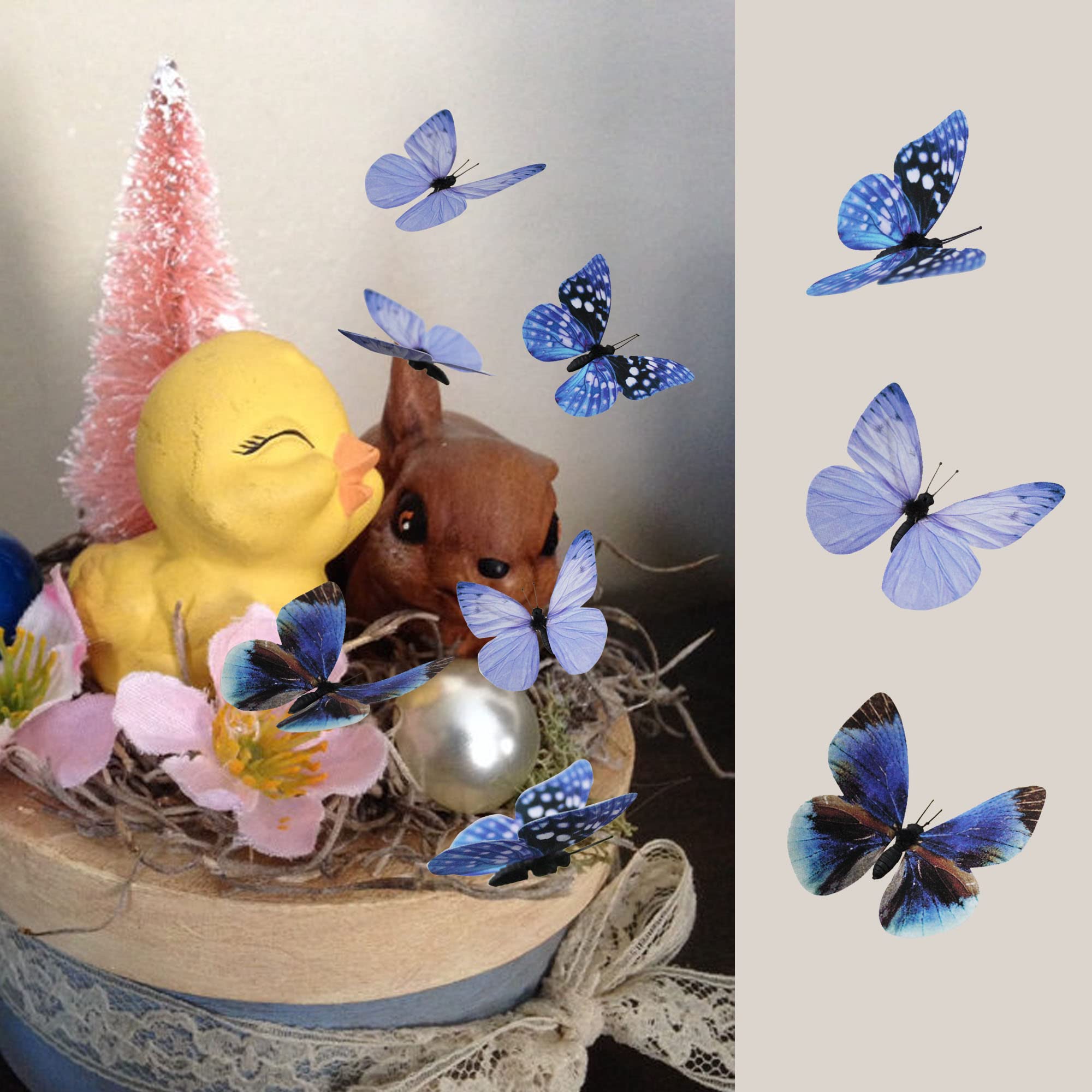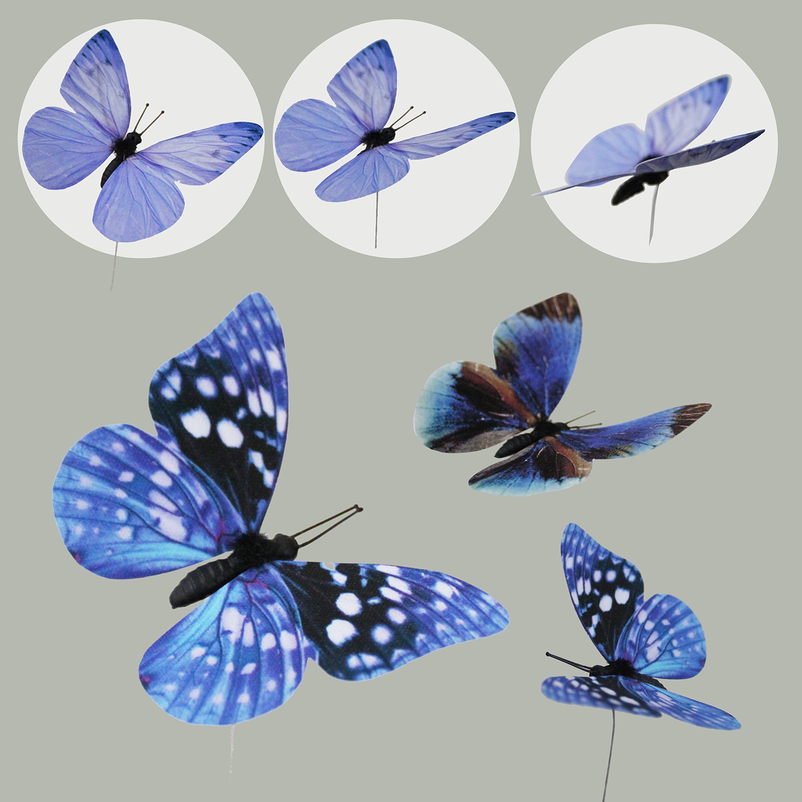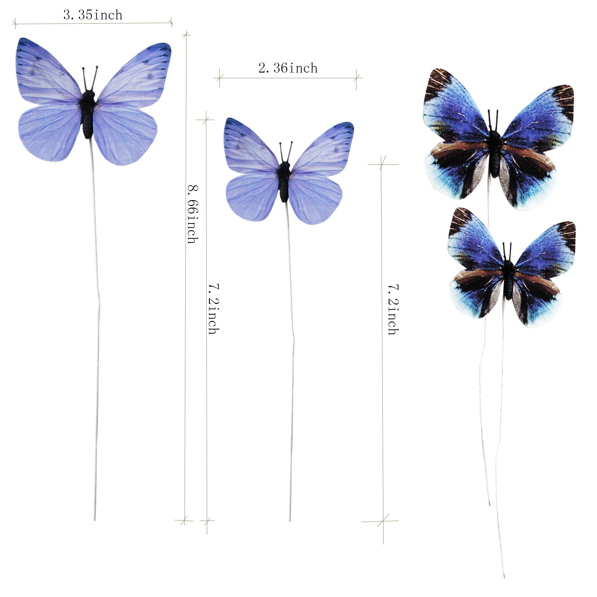 12 butterfly decors in 3 styles. Each style has 2 sizes in 3.35 inches of large, 2.36 inches of medium. Each butterfly is attached to 1 adjustable wire.