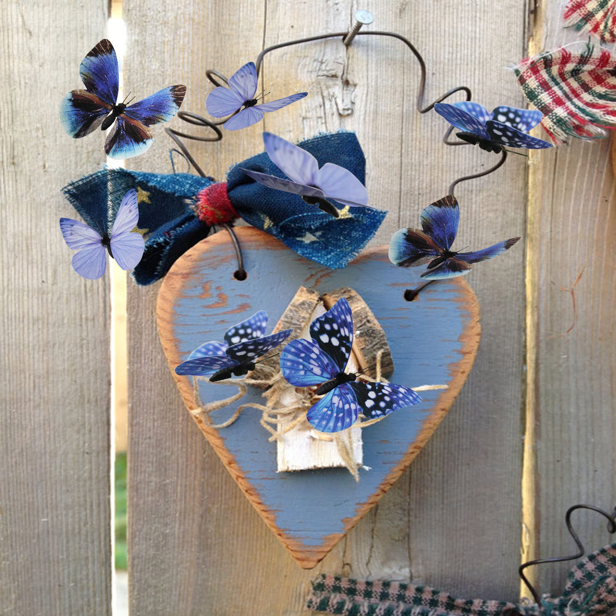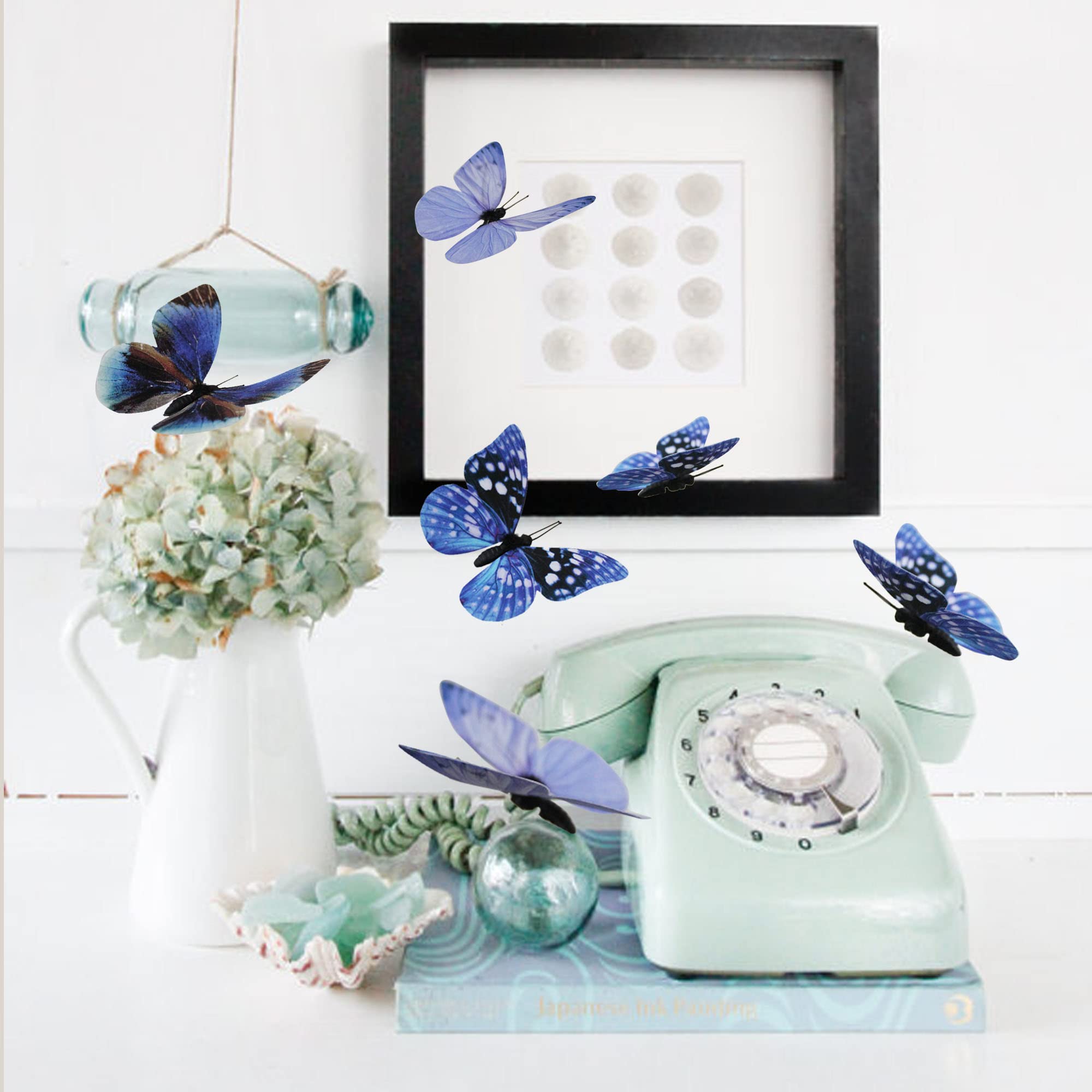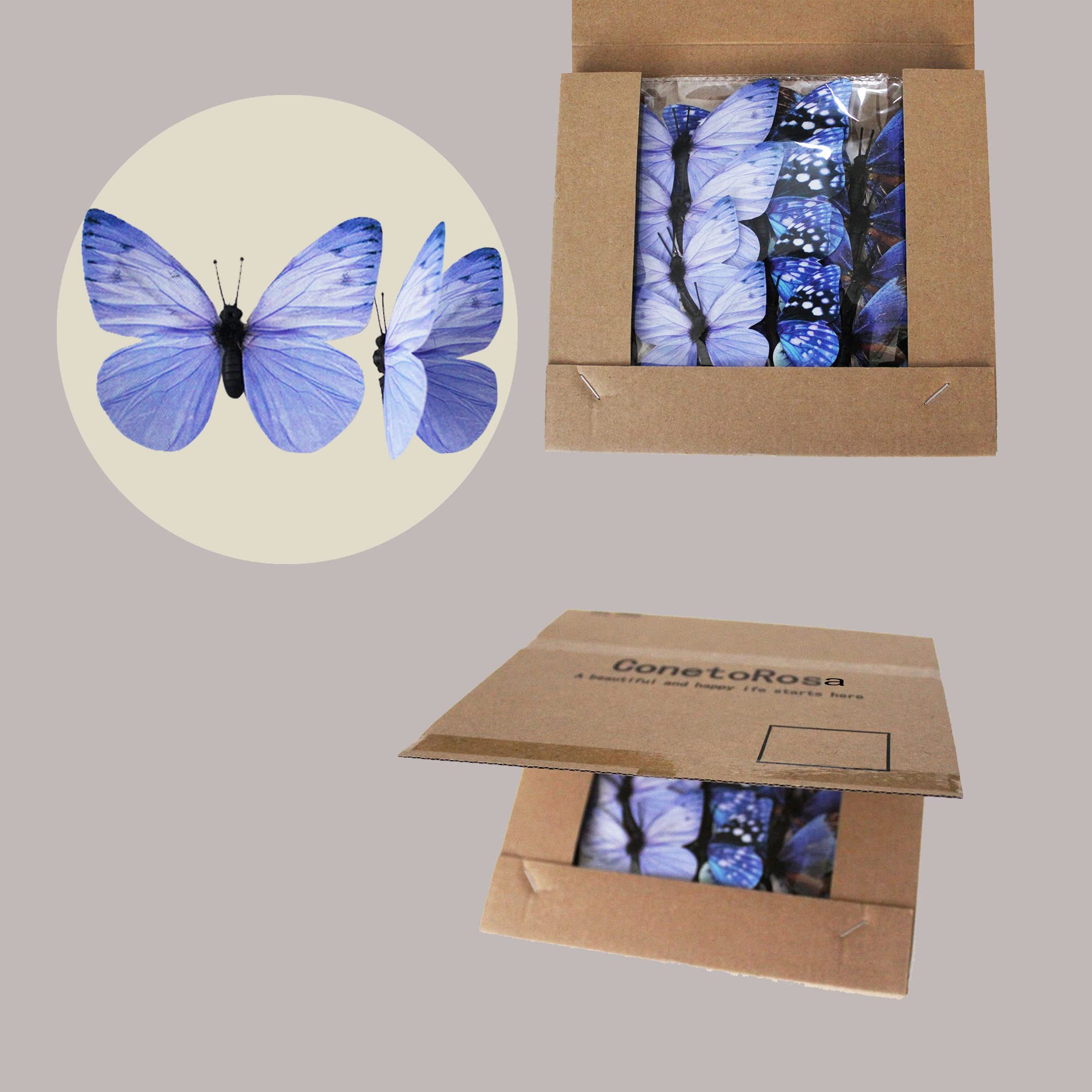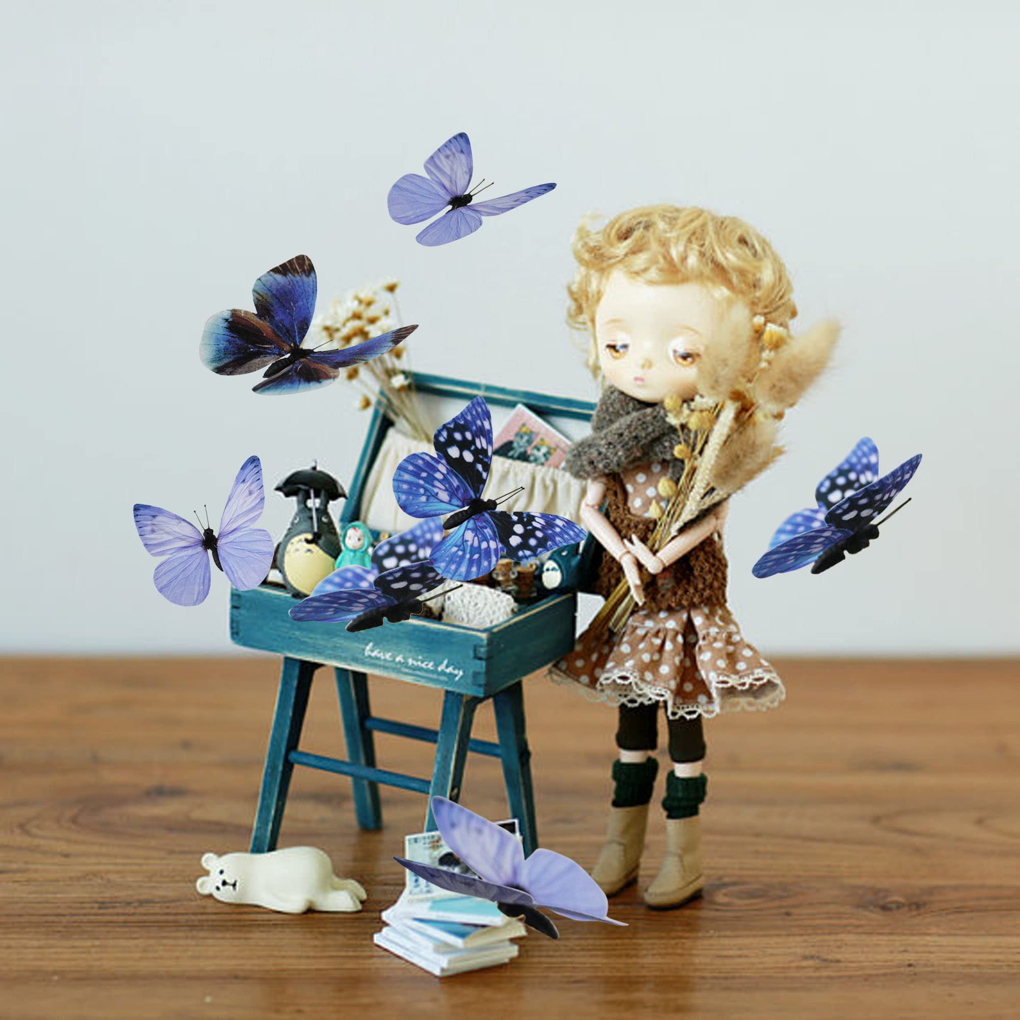 12 butterfly decors in 3 styles. Each style has 2 sizes in 3.35 inches of large, 2.36 inches of medium. Each butterfly is attached to 1 adjustable wire.