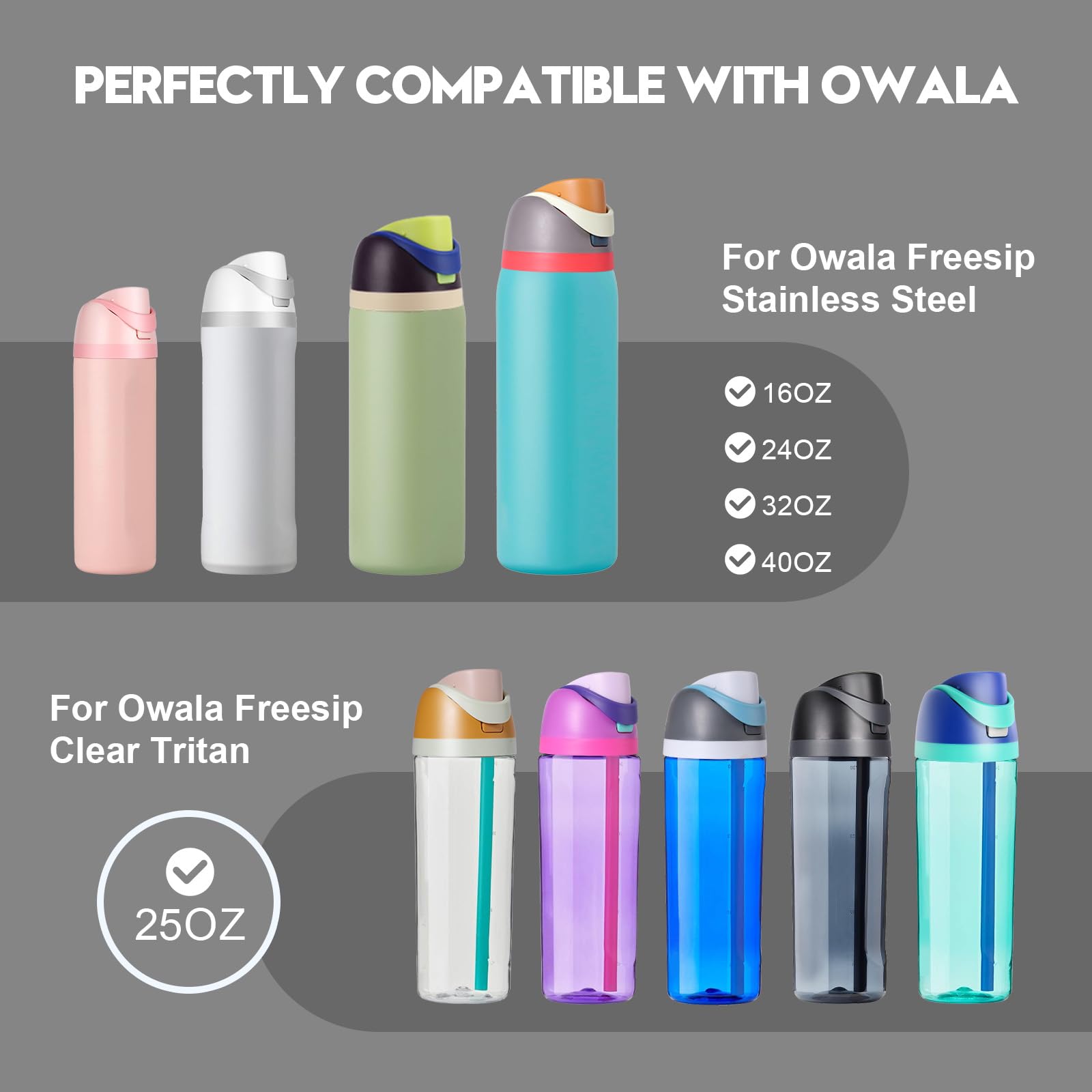 【Precise Compatibility】Specifically designed to fit Owala FreeSip Stainless Steel bottles (16oz/24oz/32oz/40oz) and 25oz Clear Tritan Plastic bottles. Always confirm your bottle model prior to purchase to ensure perfect fitment and performance.
