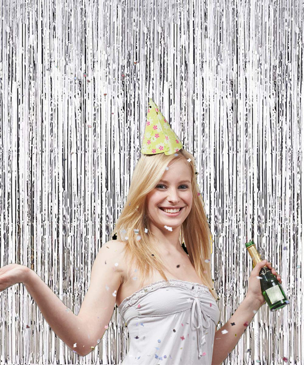i-CHONY- Silver Photo Booth Backdrop Curtains Size: 3.2 feet wide * 8.2 feet long Package Includes: 2 pack Silver foil fringe curtain Shiny Silver Backdrop decorations applicable to any party occasion,use your creativity to leave fabulous party photos for you. Paste or hang fringe curtains on a smooth surface,which can be stored for a long time and hang on the wall more safely.There is double sided tape already fixed to the back of them. Just peel plastic strip off and hang it up.