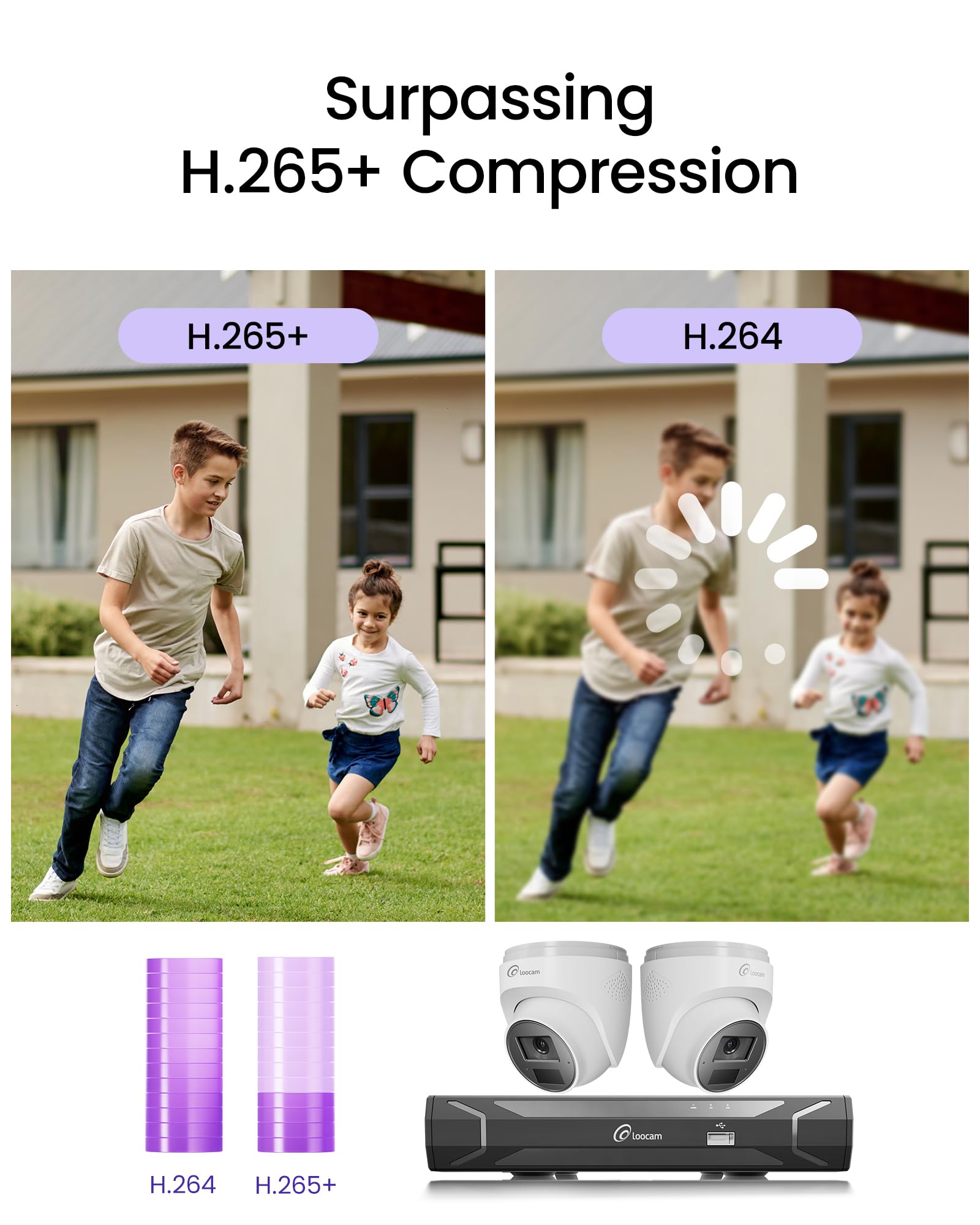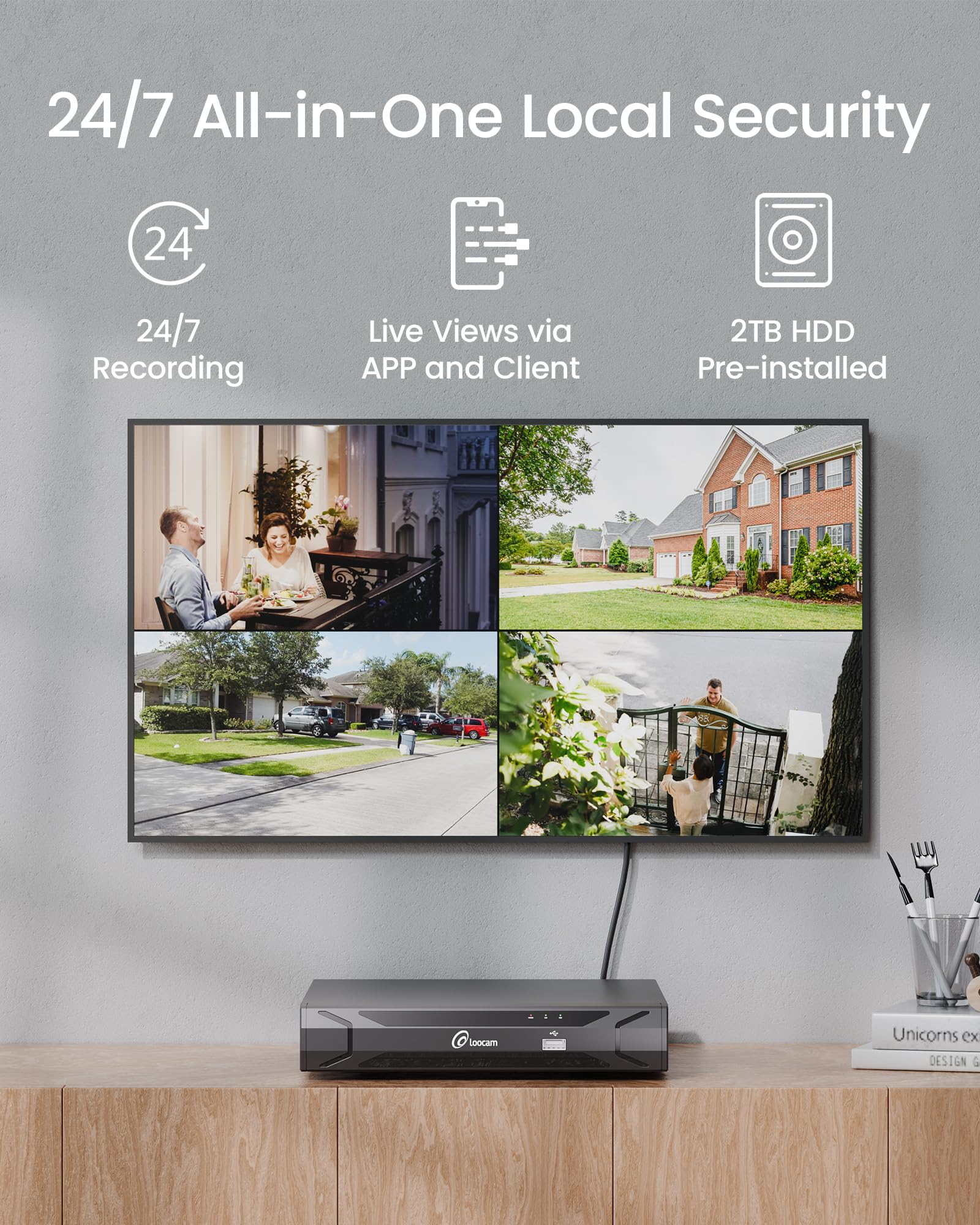 Loocam 4k camera system comes pre-installed with a 2TB hard drive (expandable up to 8TB) for continuous recording. It utilizes plug-and-play PoE setup (single-cable power/data transmission) and enables seamless remote monitoring via the Loocam APP/AVSS—view live feeds, playback recordings, and receive instant alerts with audible alarms.