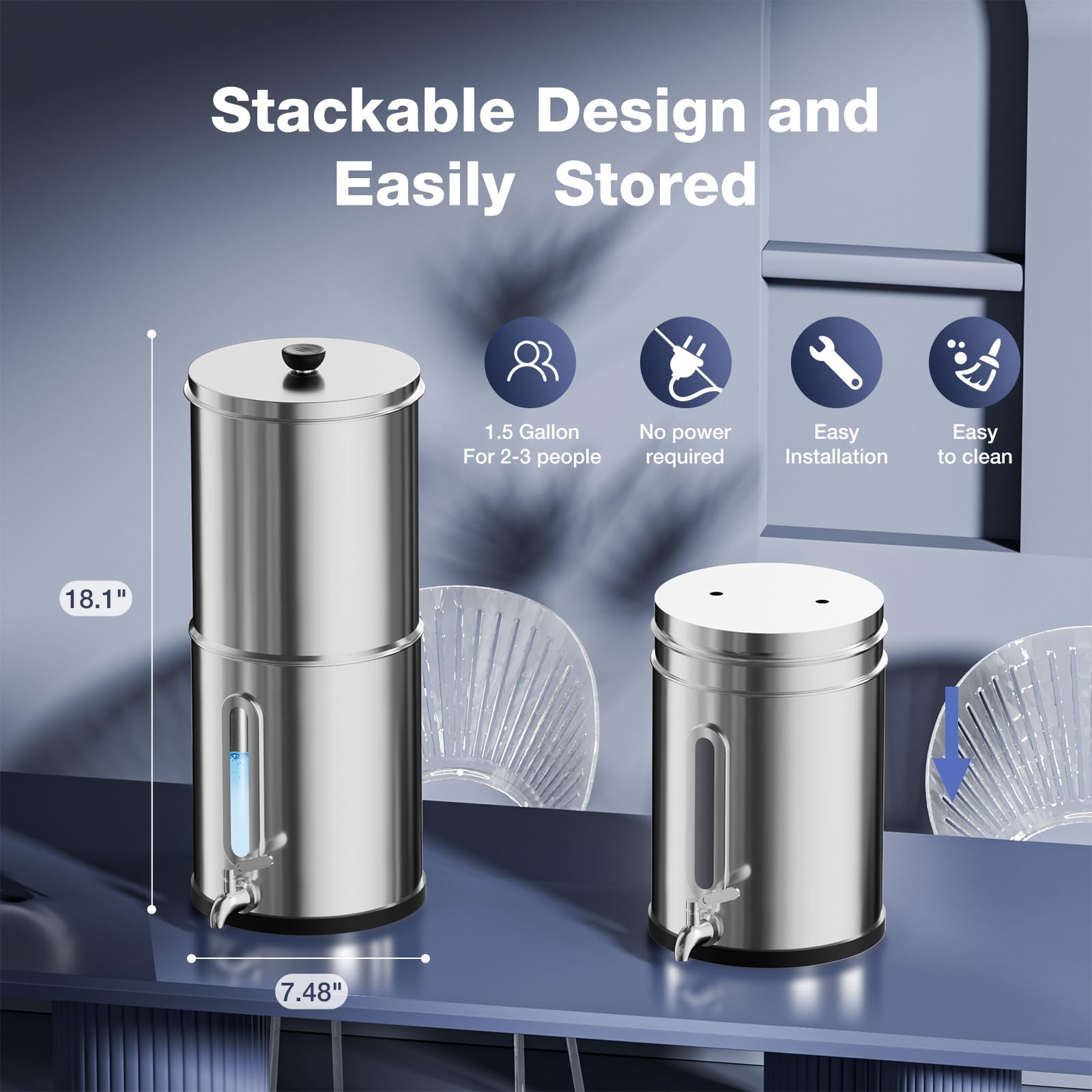 [STURDY, ENERGY-SAVING] Our 18/8 stainless steel countertop water filter has a density of 0.289 ib/in³, so it is more sturdy and durable, not easy to deform, in natural disasters and emergencies, you can completely get rid of the use of electricity, and only rely on gravity filtration, you can get a healthy and safe, mineral-rich drinking water, and it can be applied to domestic water, RV travel, camping, dormitories, apartments,etc.