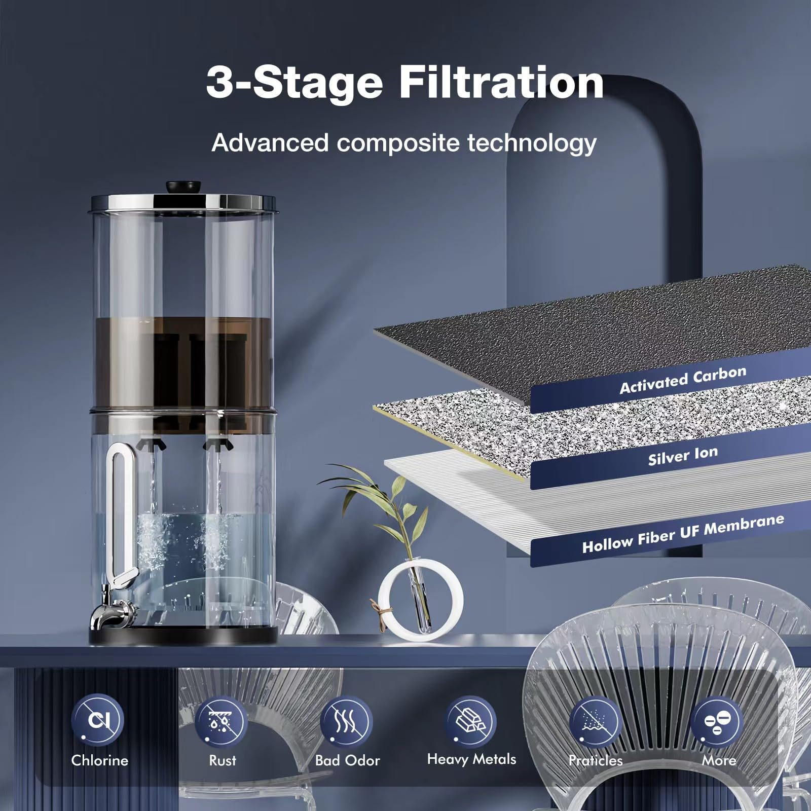 [FILTRATION PERFORMANCE] 3-stage filtration gravity water filtration system, through the authoritative NSF/ANSI 42 & 372 certification, black purification element can filter out any physical and chemical impurities of 0.01 μm, reduce residual chlorine, heavy metals, rust, sediment and organic matter, etc., mainly consists of natural coconut shell activated carbon, silver ion membrane and medical-grade hollow fiber ultrafiltration membranes, which can better improve the quality of your water.