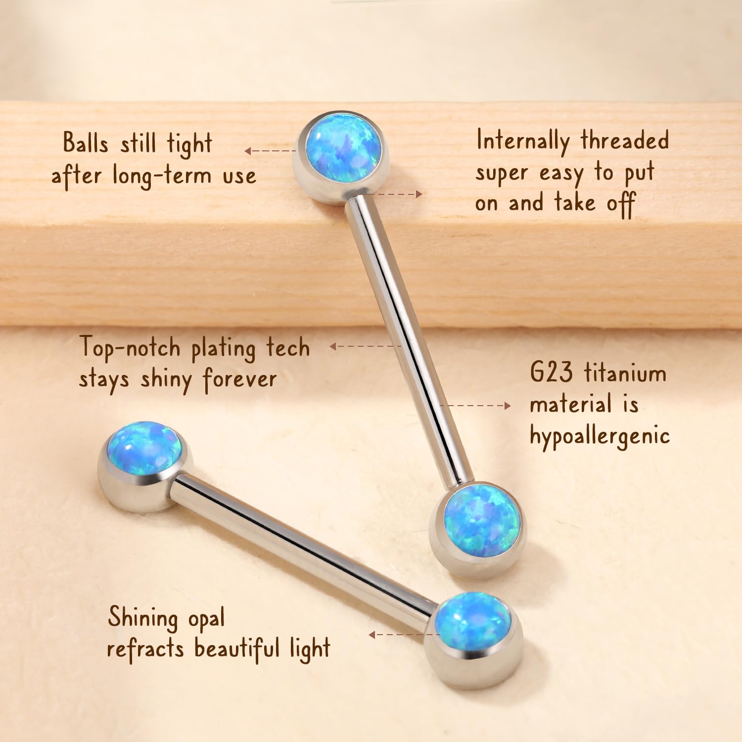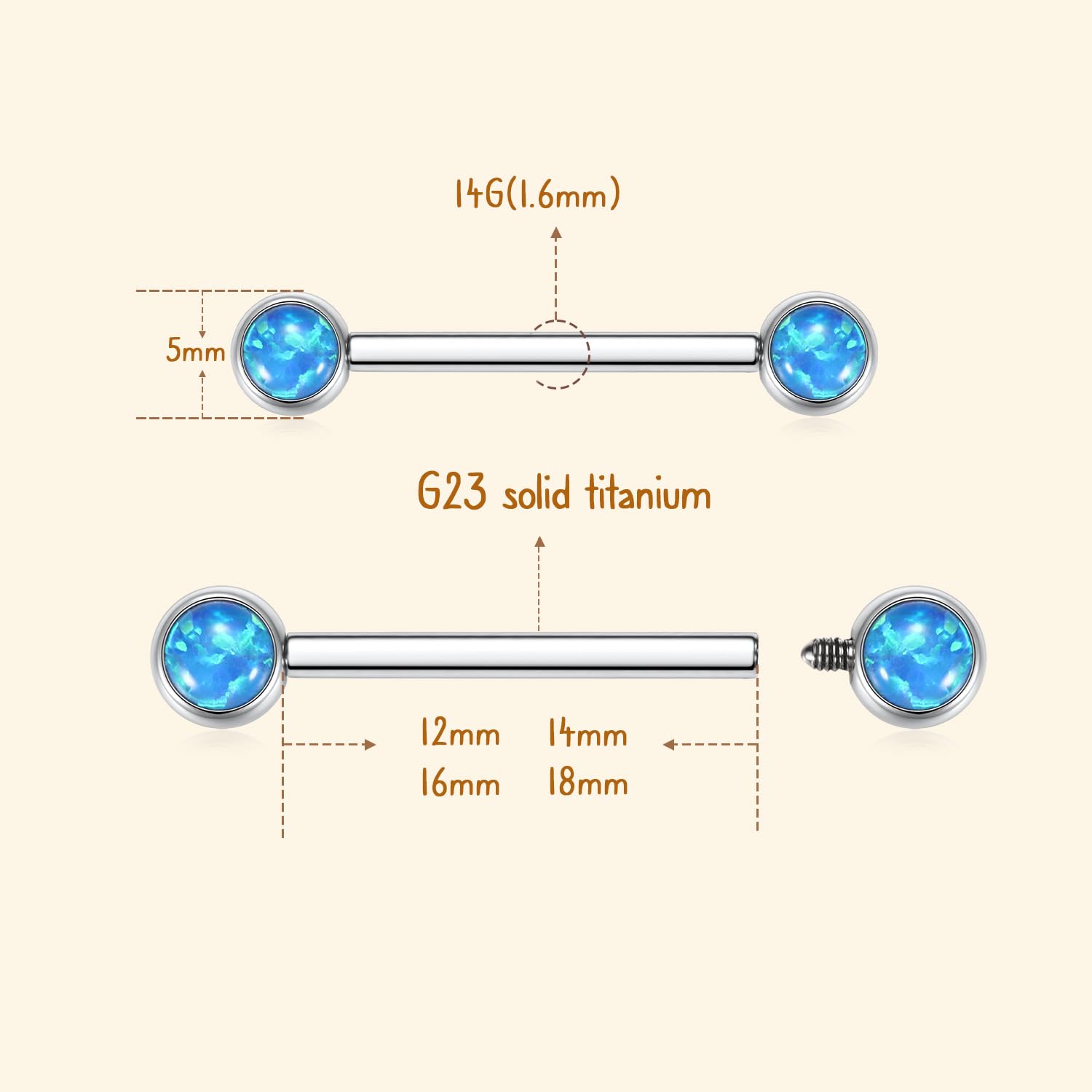 Size and Color:Gauge:14g nipple rings,Nipple Barbell Length:1/2"(12mm) Opal Size:5mm.Color: Silver+Blue Opal