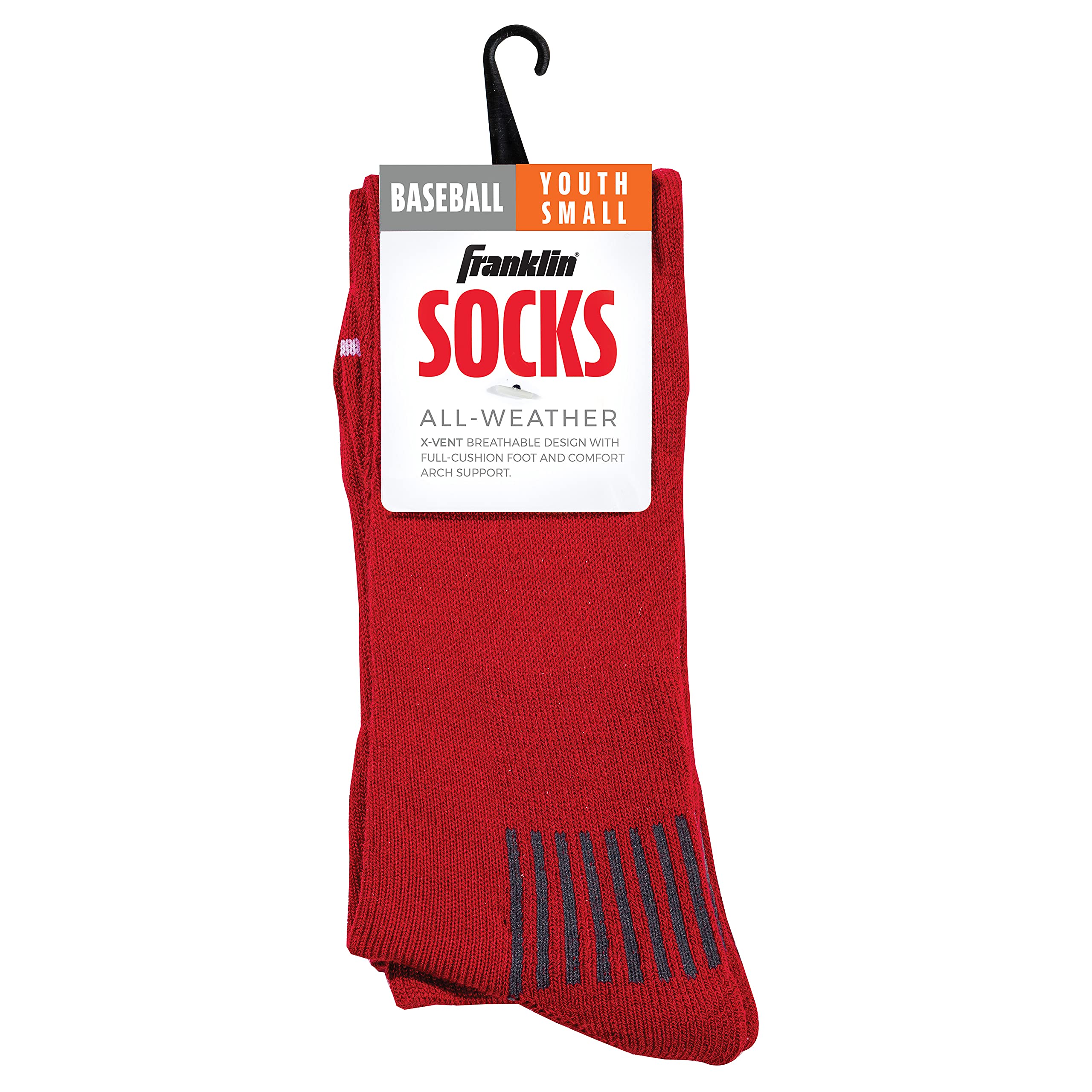 Description Franklin Sports' Youth Baseball Socks are a must have accessory for any young baseball or softball player. Made from durable, lightweight fabric these socks also feature extra cushioned feet so you can stay comfortable and cool all game long!
