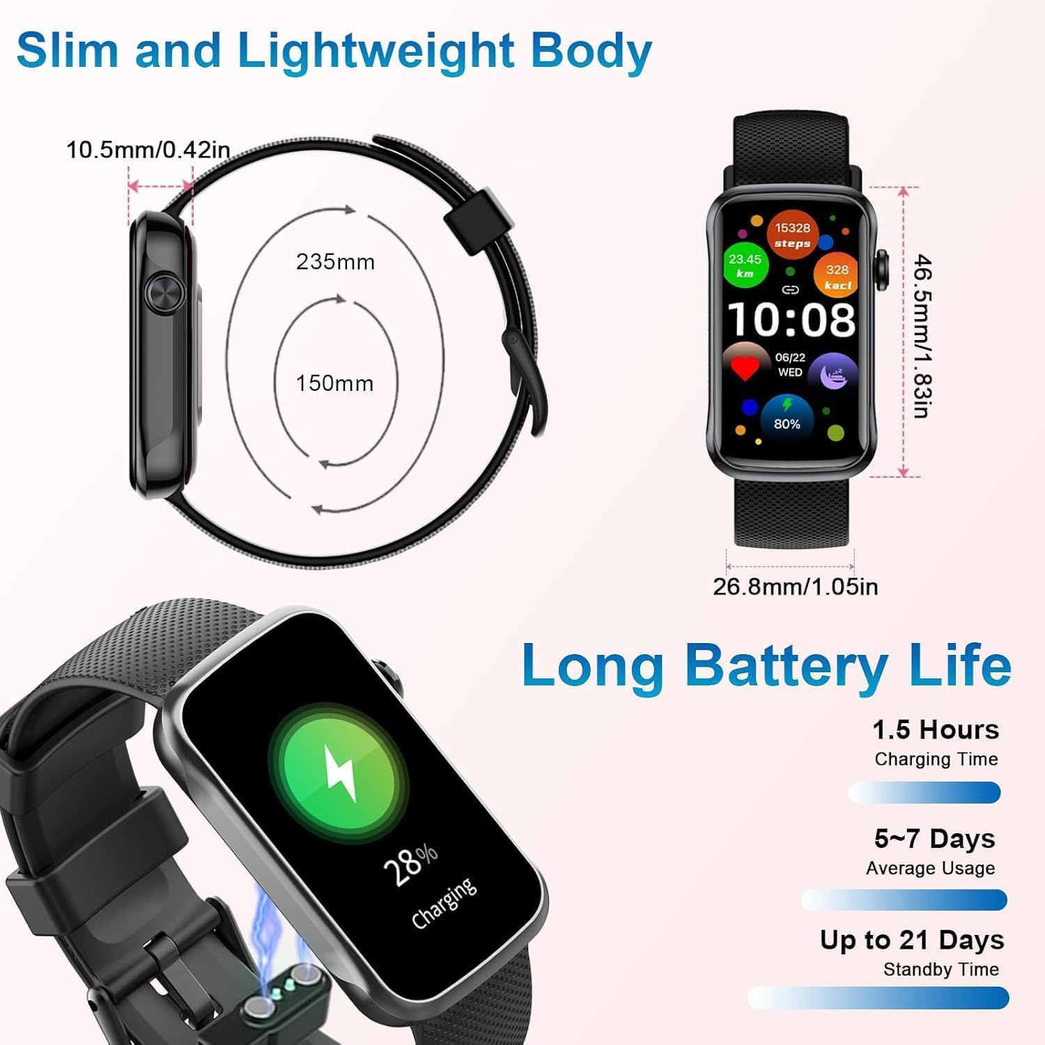 24+ Sports Modes and IP68 Waterproof: Fitness watch supports multiple sports modes, including running, cycling, walking, basketball, yoga, football and so on. During your exercise, activity tracker will record your data like, steps, calories burned, etc. Sport watch is ip68 waterproof rating, ensuring worry-free use even while washing hands, face, or engaging in sweaty activities. However, it is not recommended for use in hot water or seawater.