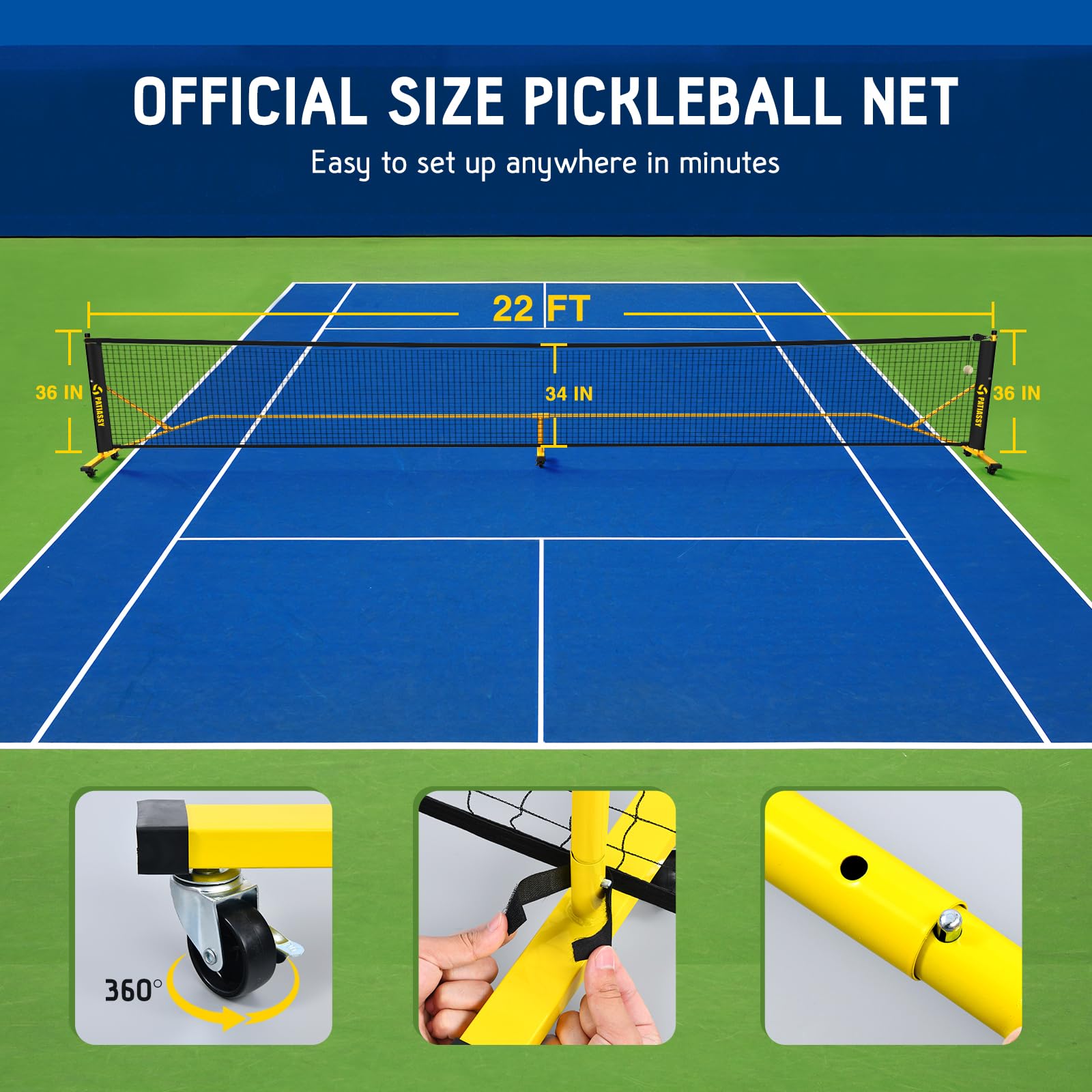 Regular-sized Net: The pickleball net is 22" wide, 36" high on both sides and 34" high in the middle. The net is made of strong PE net which is strong and tear-resistant, and the sleeve is made of 600D PVC for good durability and water resistance