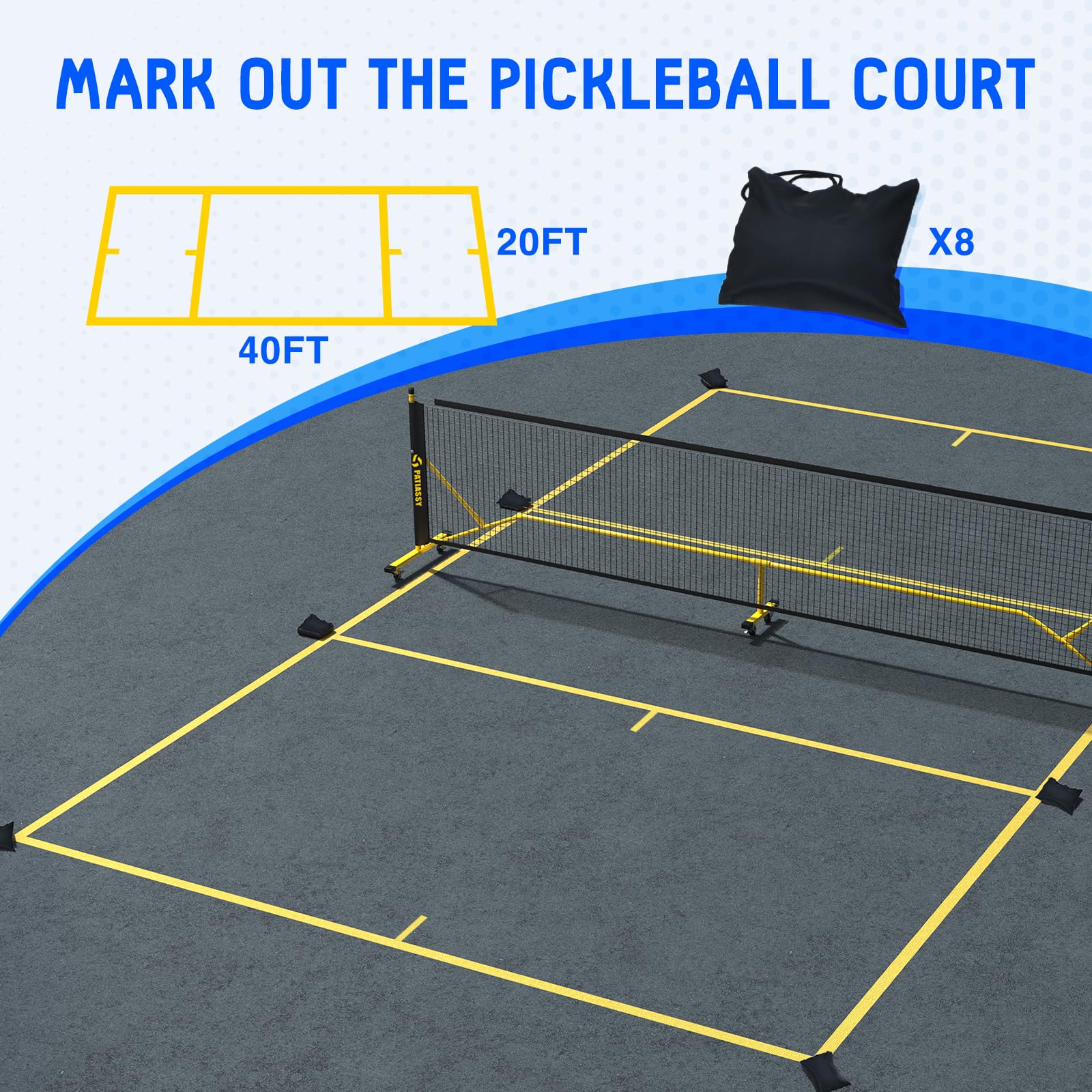 Easy Assembly: The set with a full-size pickleball court marking kit, used with sandbags, marks a court for a better-using experience. Each tube is numbered and marked with instructions and can be installed in a few minutes