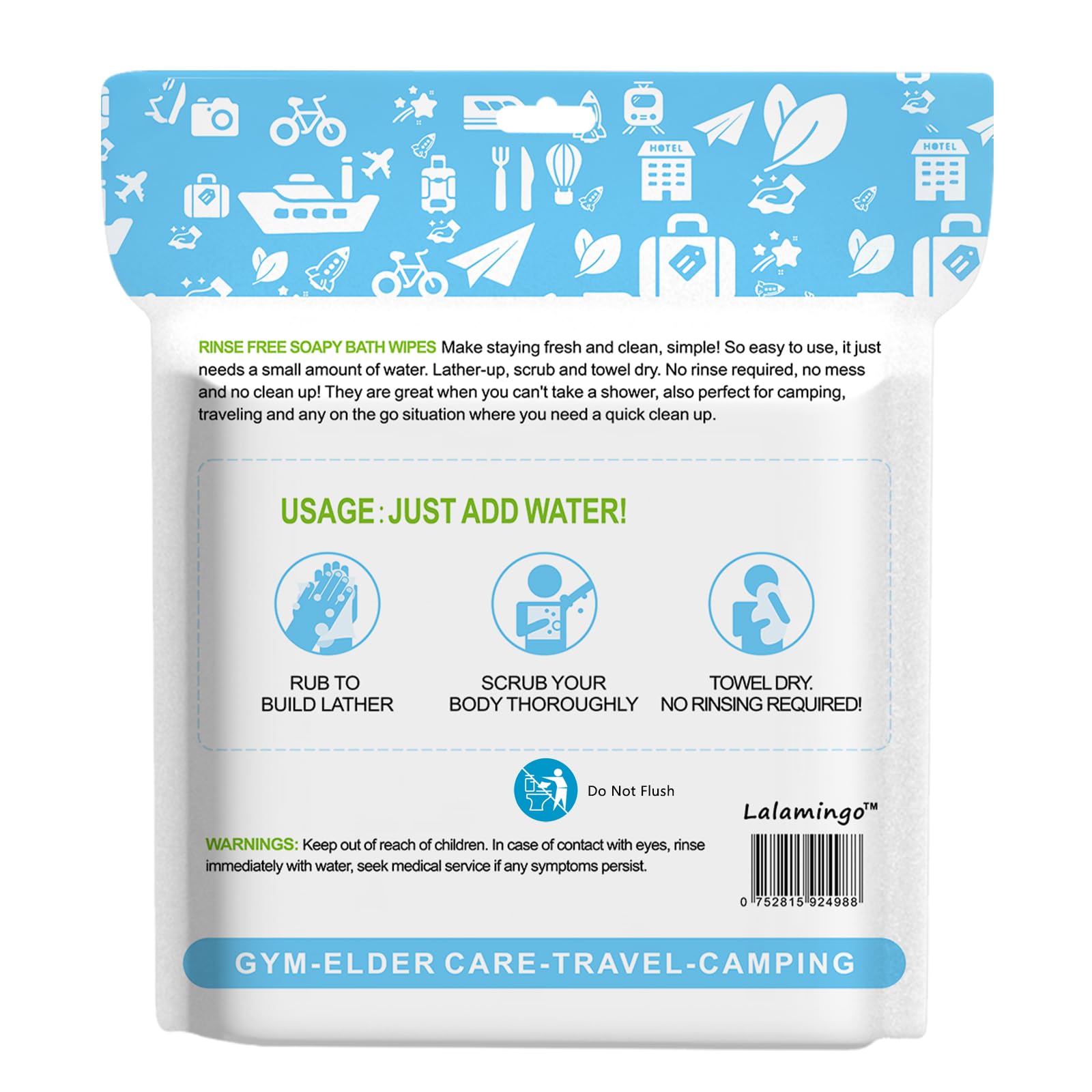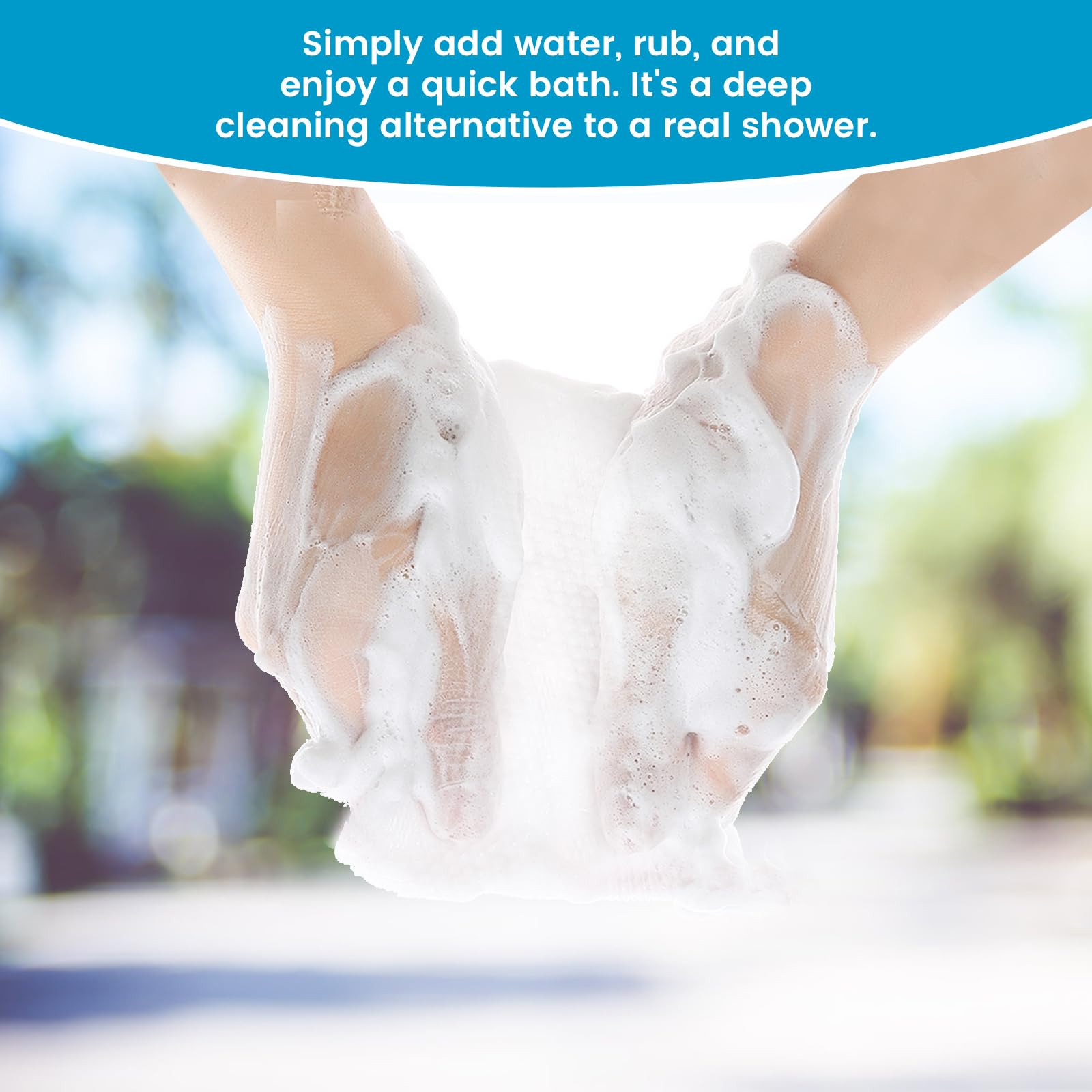 Bathe Without Soap: Our dry wipes are infused with cleansing foam. Use towels or cloths to wipe off the lather. They are excellent as emergency supplies, hurricane recovery aids, or items for assisting the homeless.