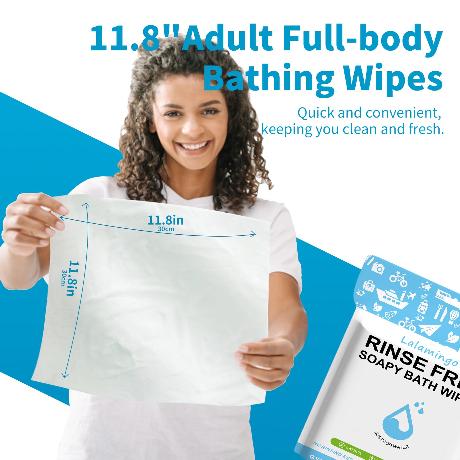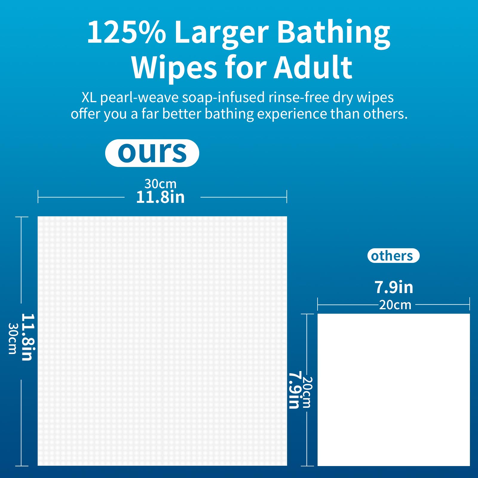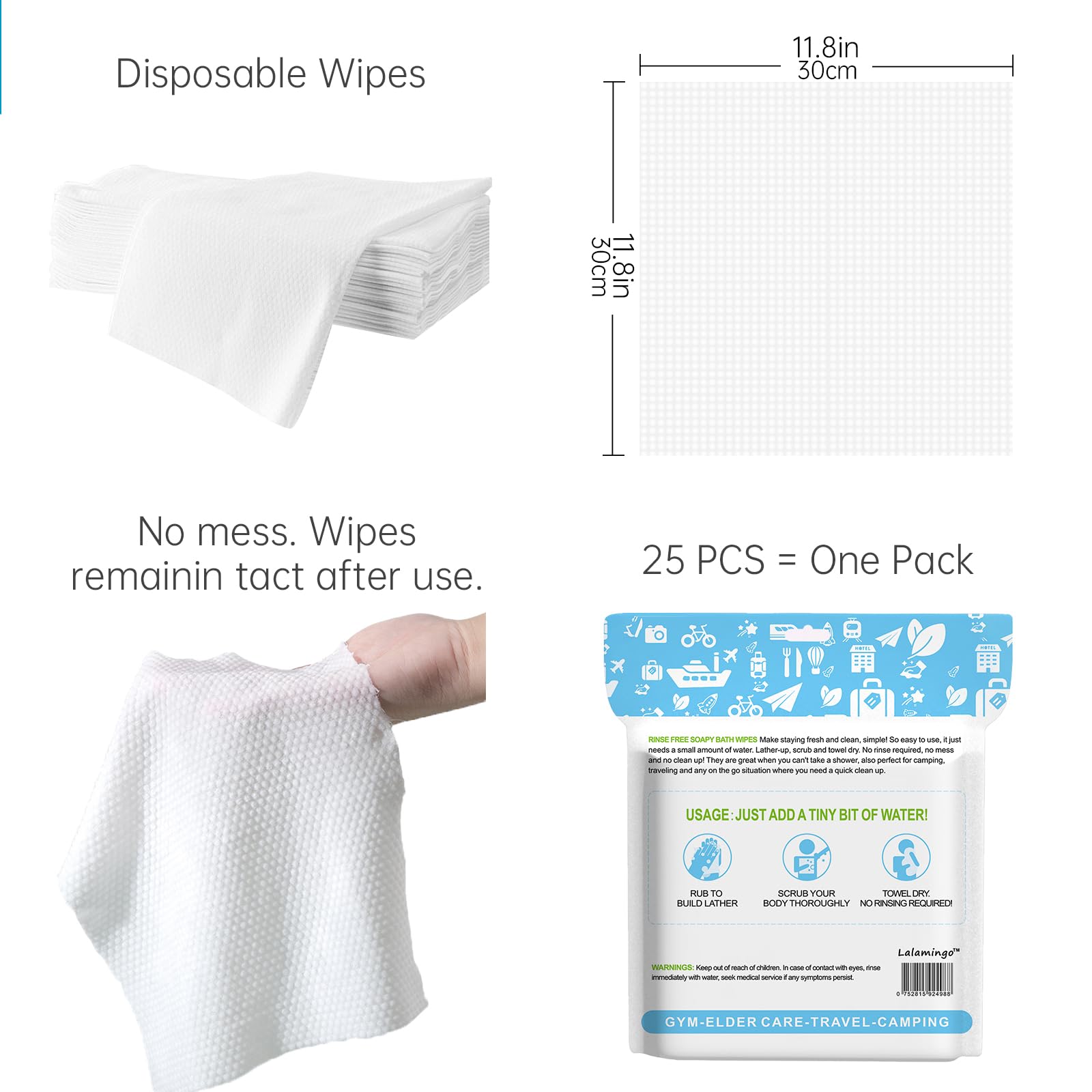 Wipes Size and Quantity: The dimensions of no rinse wipes are an ample 11.8 inches by 11.8 inches. Each resealable pack holds 25 pre-soaped bathing wipes.