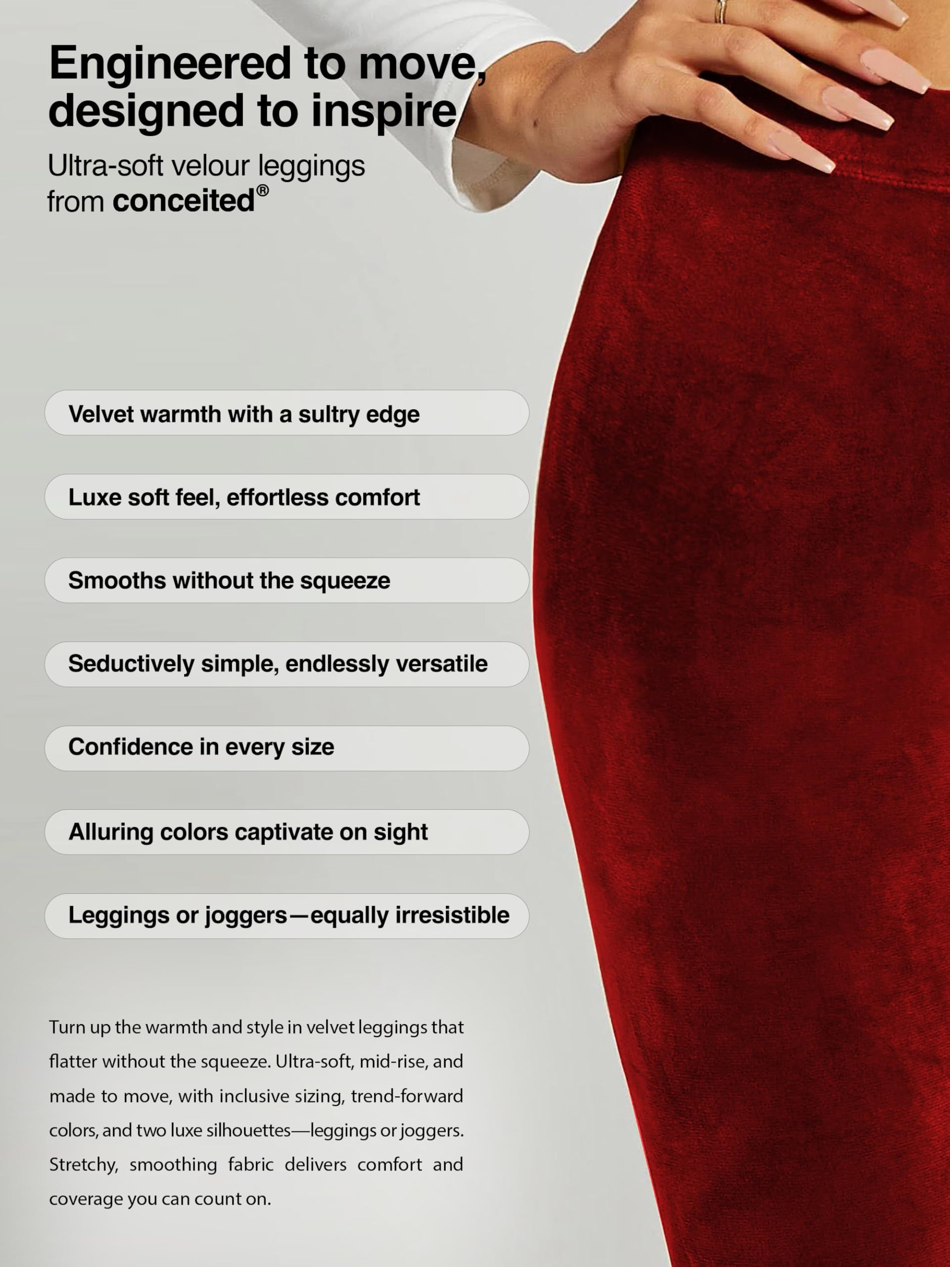 Description Effortless polish meets everyday comfort in our signature collection of velour and vegan leather essentials. From sultry leggings to laid-back joggers and sleek wide-leg pants, each piece is crafted with breathable stretch fabrics that smooth without the squeeze, lined in soft comfort, and designed to flatter every curve. Whether it’s velvet glow or matte leather edge, these timeless silhouettes deliver versatile style that moves with you—from lounging to late-night plans. Inclusive sizing, modern fits, and trend-forward colors make this collection endlessly wearable, endlessly irresistible.