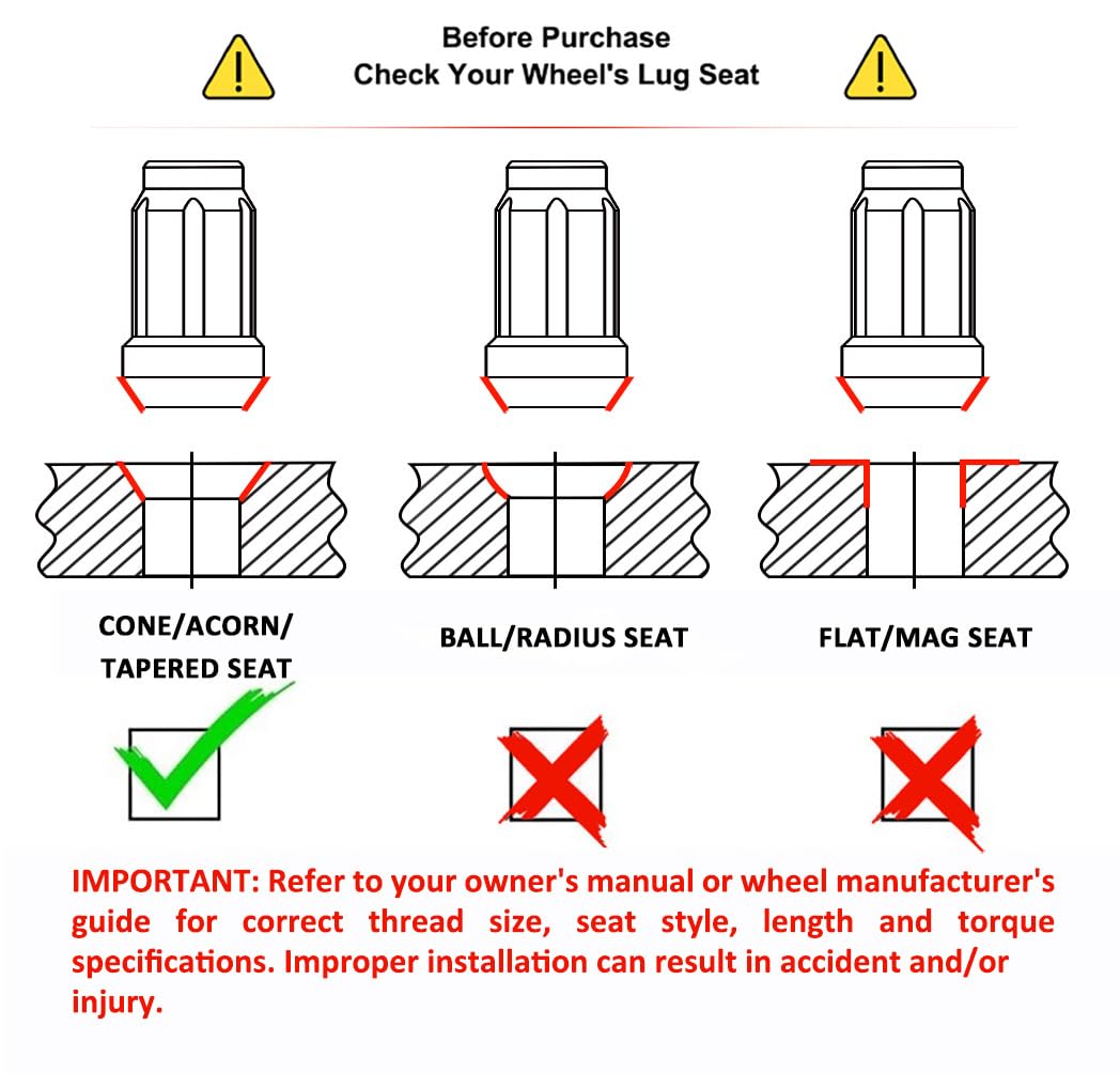 ATTENTION: Refer to the owner’s manual or the wheel manufacturer’s guide for the correct thread size, seat style, length, hex and torque specifications. You assume all liability of improper installation which can result in accident and/or injury.