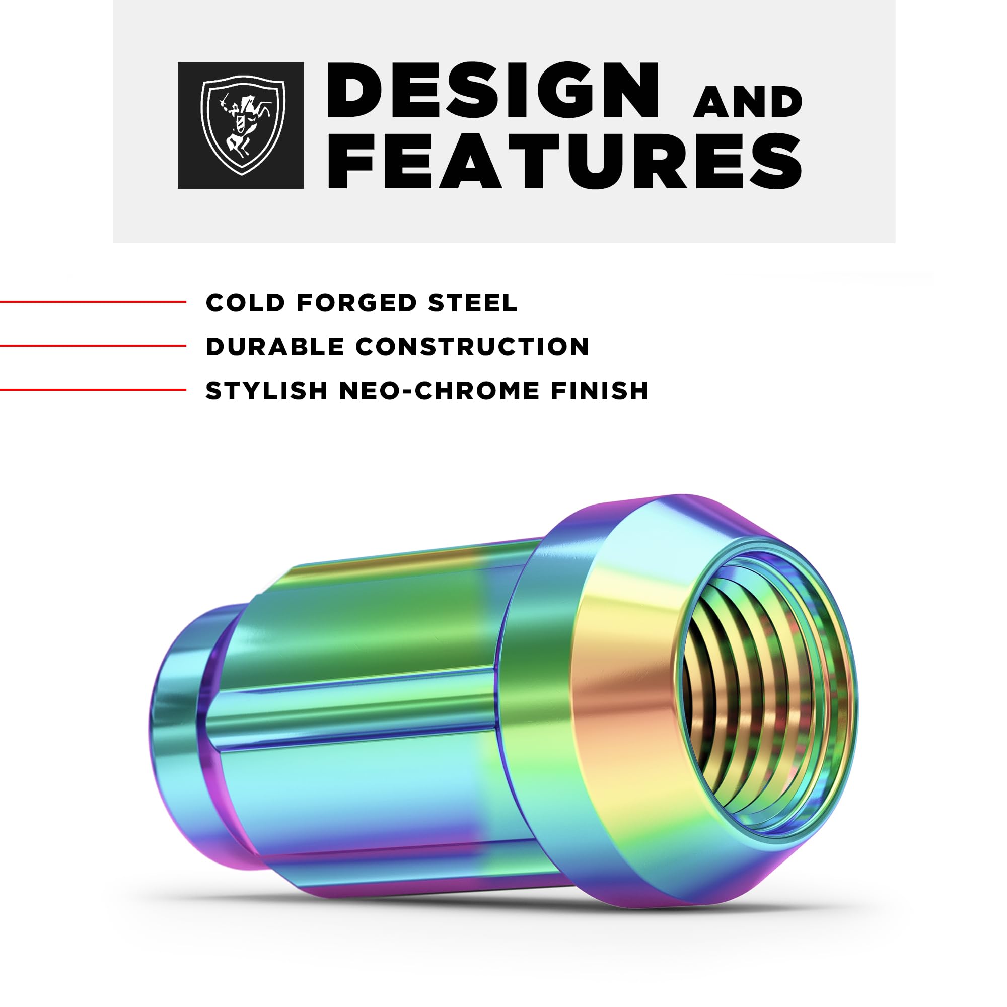 Features: Cold forged carbon steel and tested to industry standards. Durable construction with stylish neo chrome finish. Utilizes 6 spline key adaptor for fast and secure installation