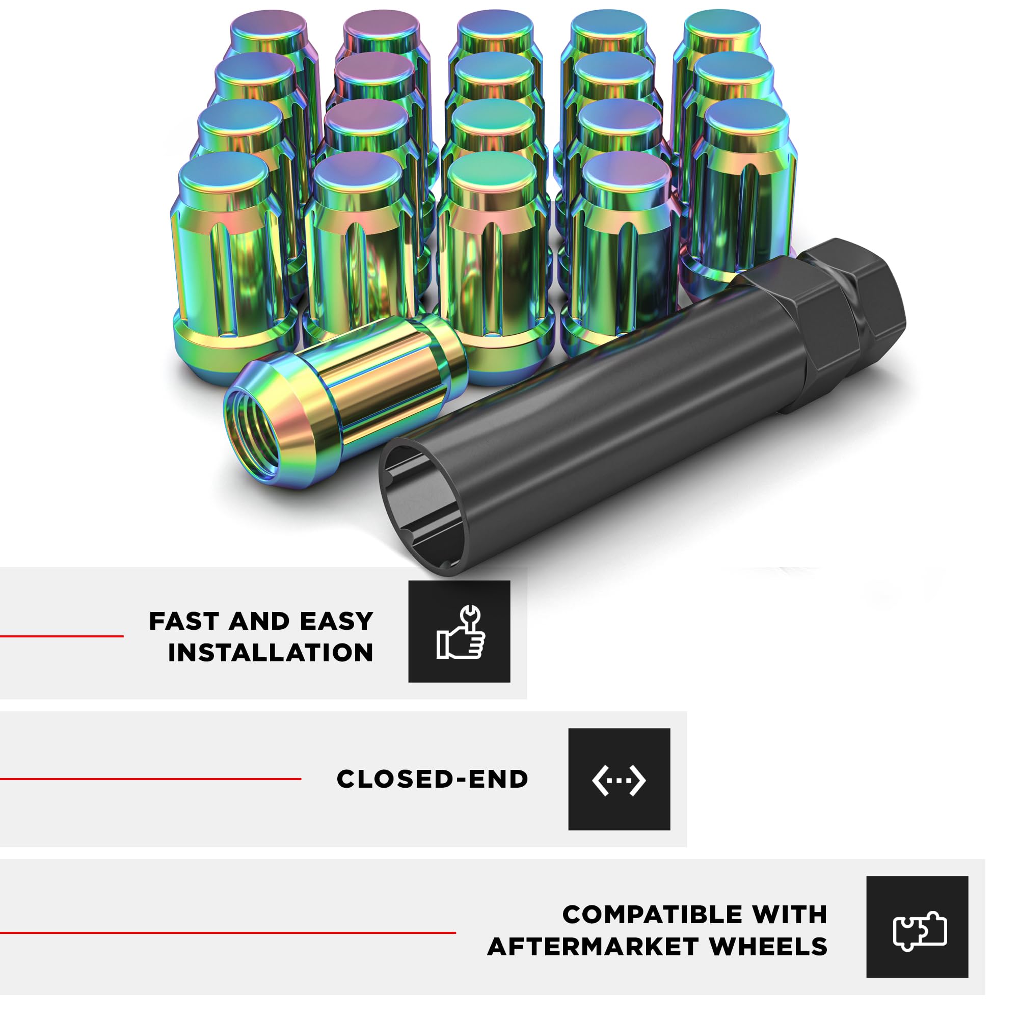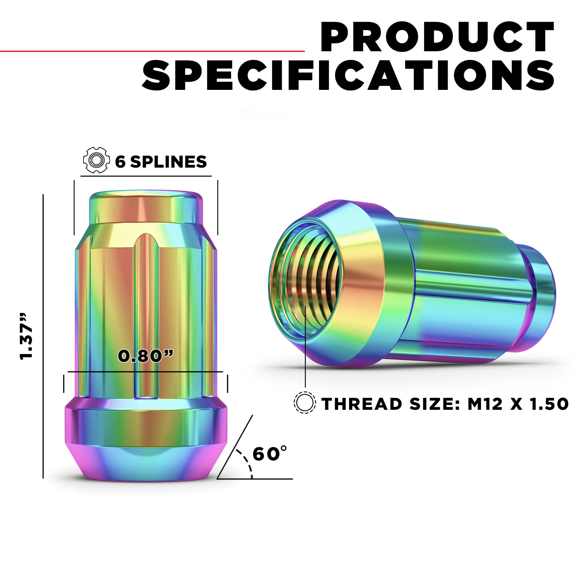 Specifications: M12x1.50 Thread Pitch, 1.37” Overall Height, 0.80" Diameter, 6 Spline Drive, 60° Conical Seating, Spline Acorn.