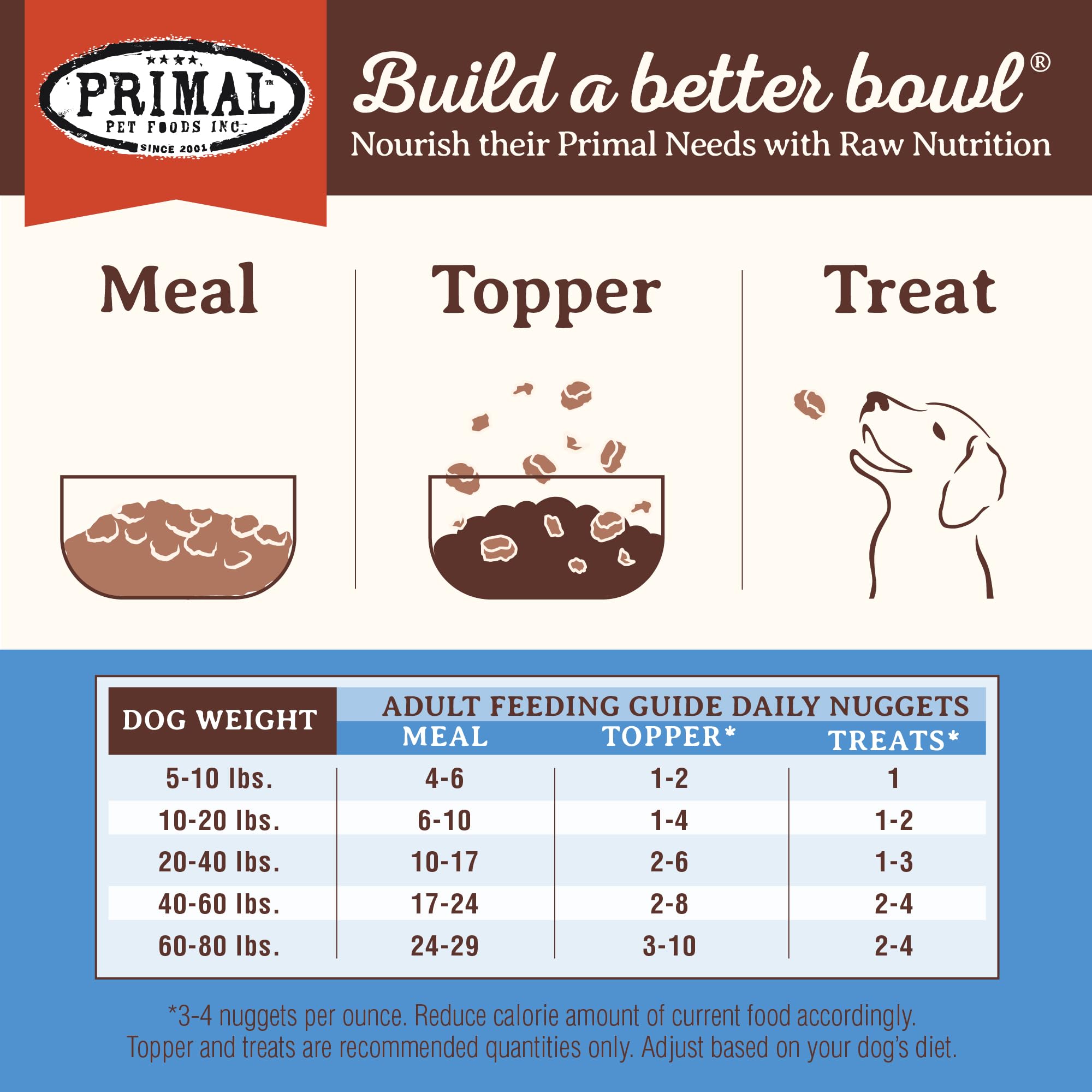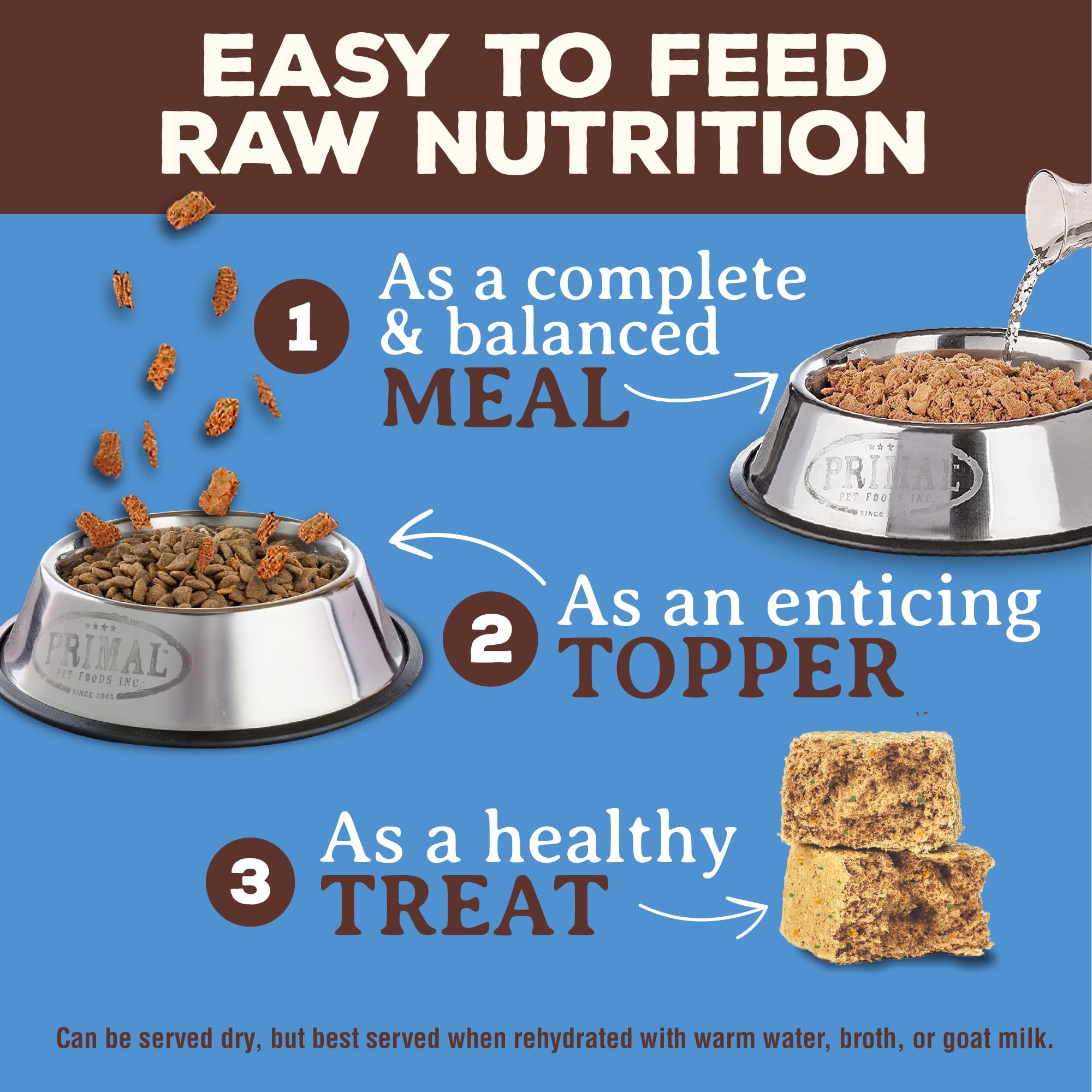 Serve as a complete & balanced meal, a freeze dried dog food topper or treat. Adding Primal Pet Food just a few times a week will help you start to see the results raw food for dogs can provide