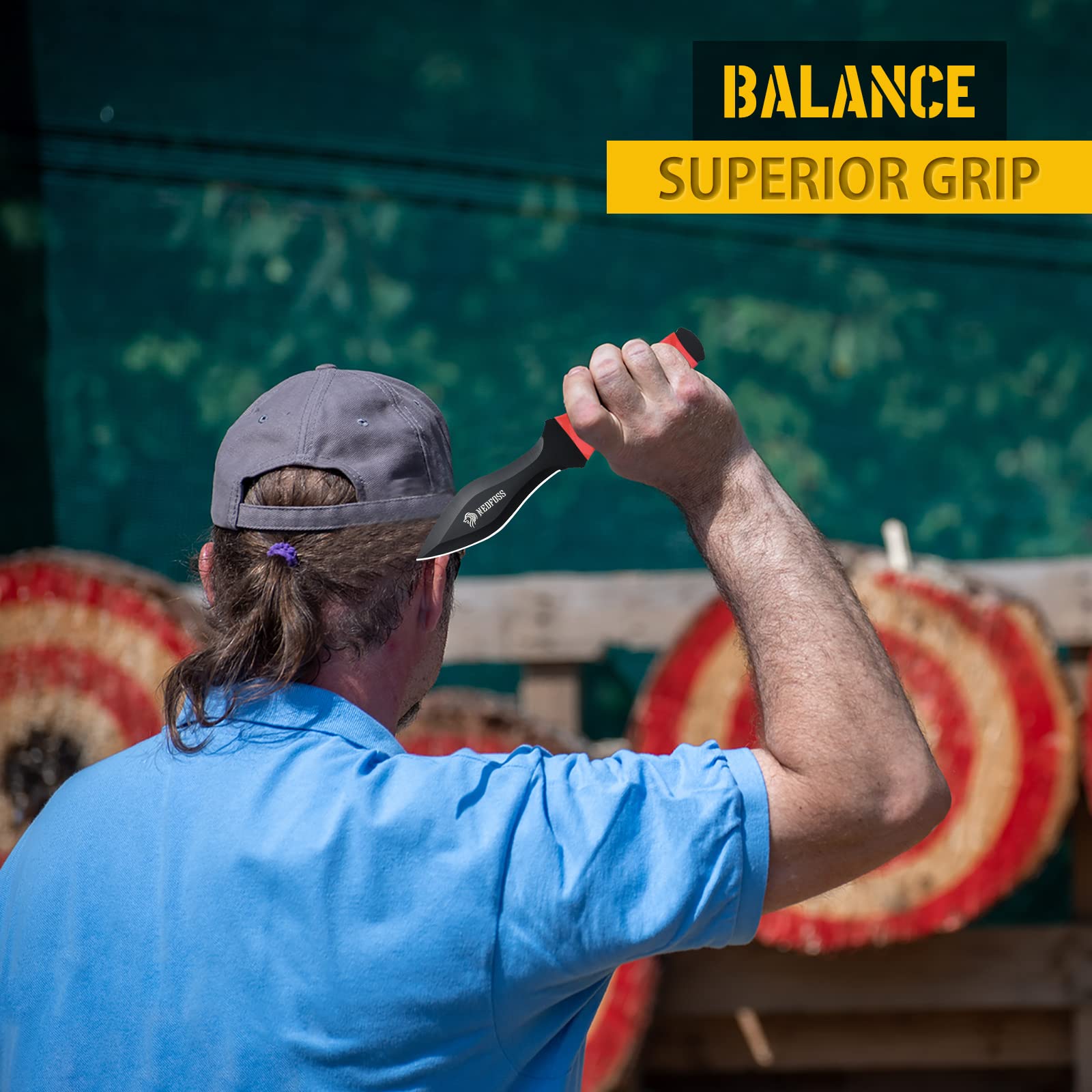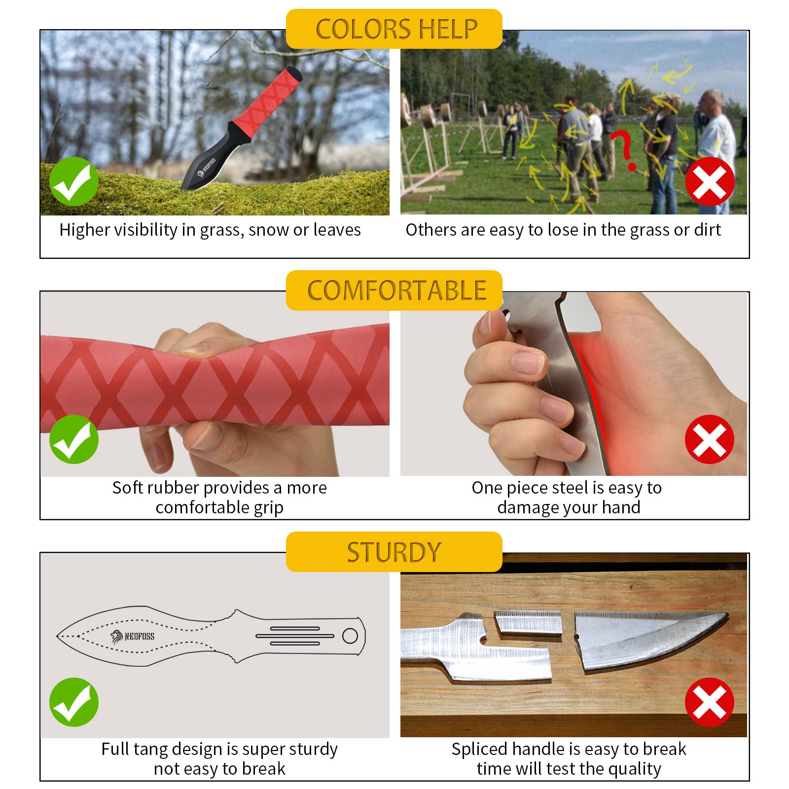 COMFORTABLE RUBBER HANDLE: Additional rubber provides a more comfortable and non-slip grip. Moreover, the conspicuous red handle improves the visibility of throwing knife in your backyard or snow, leaves, or grass, making you no longer worry about not finding the throwing hawks.