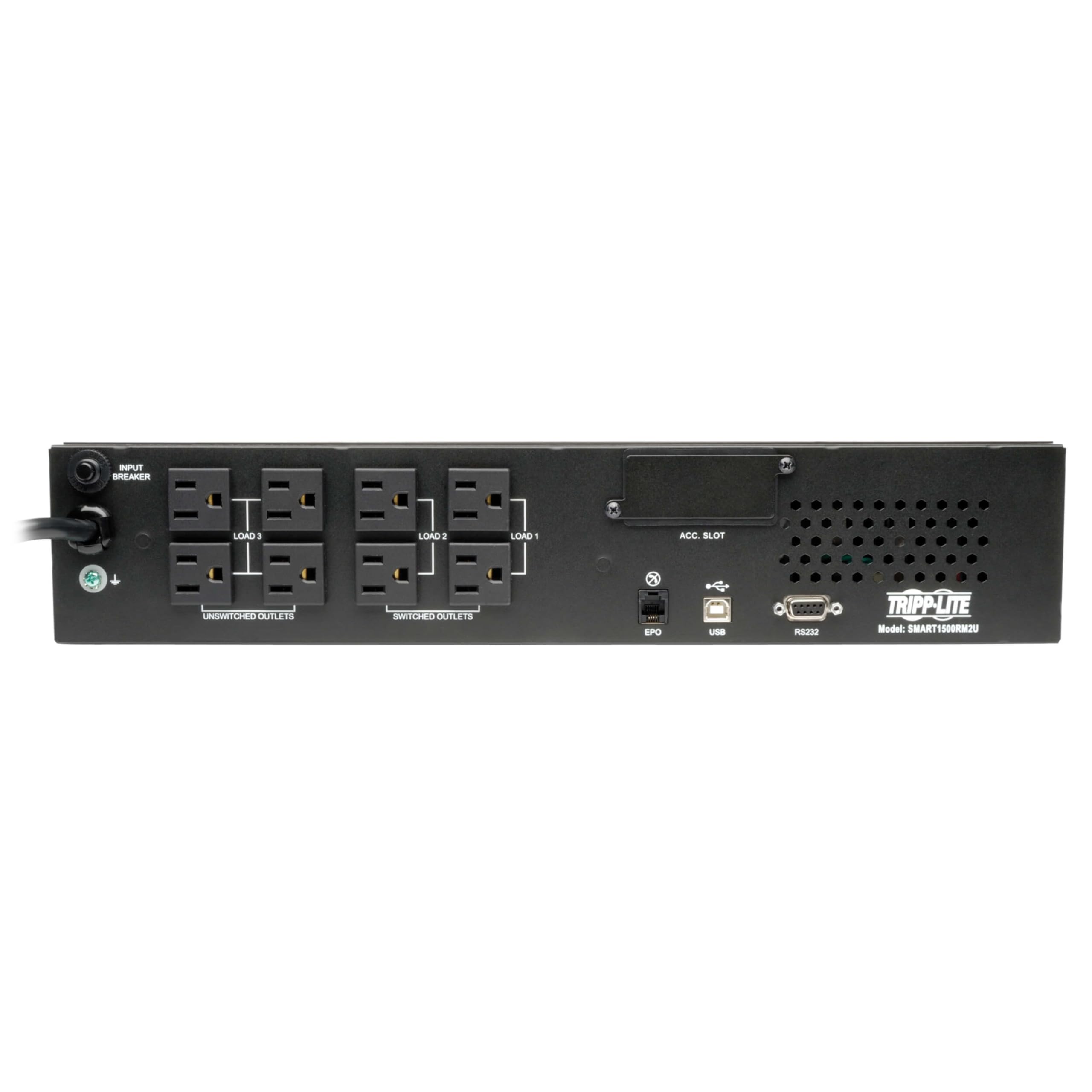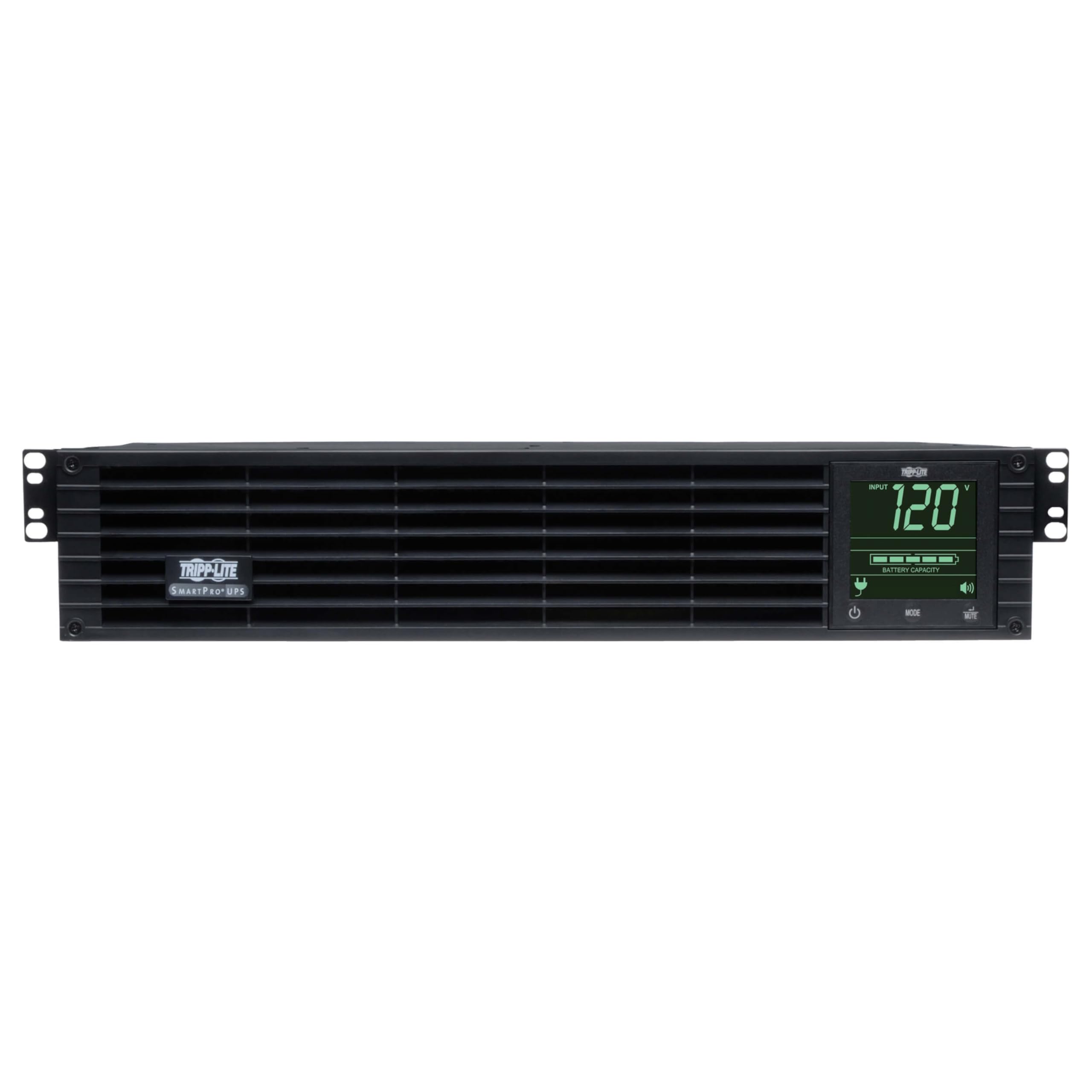 The SMART1500RM2U SmartPro 120V 1. 5kVA 1. 35kW Line-Interactive Sine Wave UPS provides battery backup and AC power protection against blackouts, brownouts, power surges and line noise that can damage electronics or destroy data. Ideal for backing up servers and network storage devices, the SMART1500RM2U switches to battery mode in milliseconds to keep your connected equipment running long enough to save files and shut down safely with no data loss. Featuring eight NEMA 5-15R outlets (four switchable) and a 10-foot power cord with 120V NEMA 5-15P input, the SMART1500RM2U has an internal battery that provides 13 minutes of support at half load and 4. 5 minutes at full load. A front-panel LCD screen lets you monitor important data, such as load level, voltage, battery charge and estimated runtimes. Automatic voltage regulation (AVR) maintains 120V nominal output over an input range of 83V to 147V without using battery power. EMI/RFI noise filtering improves your equipment’s performance and prevents damage. A 570-joule surge suppression rating protects your equipment from harmful power surges. With Tripp Lite’s Power Alert software (available via free download), the SMART1500RM2U enables safe unattended system shutdown and file saves in case of a prolonged power failure.