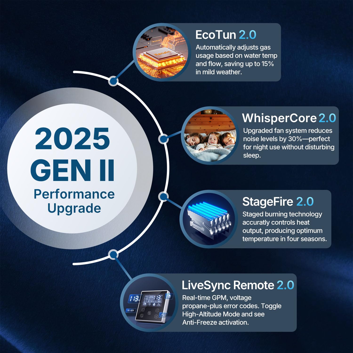 Enhanced for Your Convenience - Building on the original design, we’ve upgraded the multi-function remote control to display real-time gas usage, voltage, water flow rate (GPM), anti-freeze activation status, and support operation at high altitudes up to 9,800 feet.