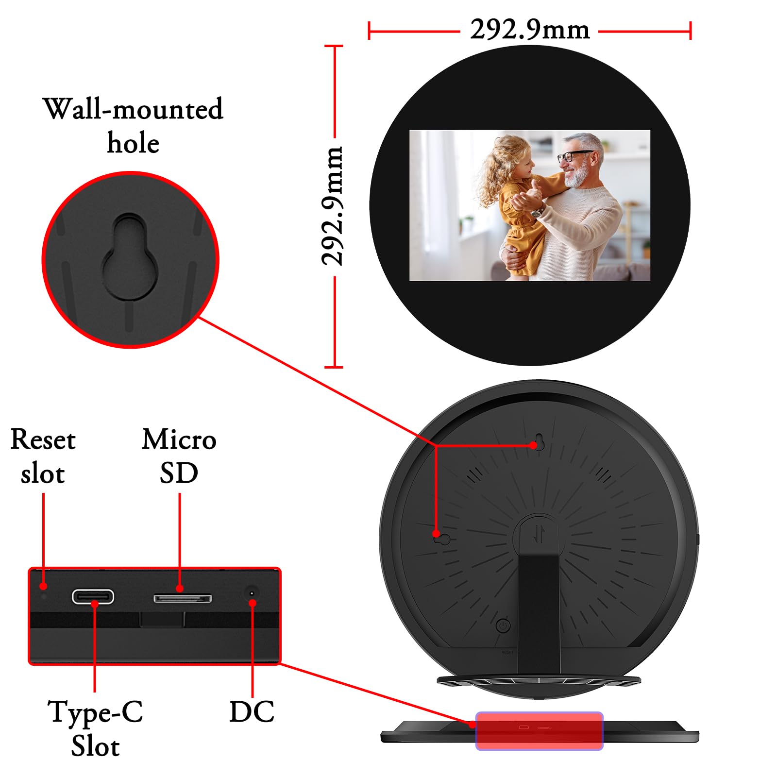 【Multiply Ways to Upload Pictures】: Built-in 32GB storage with SD card and USB drive slot can store 88,000+photos(300KB/pc) with ZERO subscription fees. You can upload 100 photos each time via phone App or transfer photos from PC to the digital frame. You can also directly play /import/export/backup photos with TF card. Supports picture format by JPG/JPEG/BMP/PNG and video format by MP4.