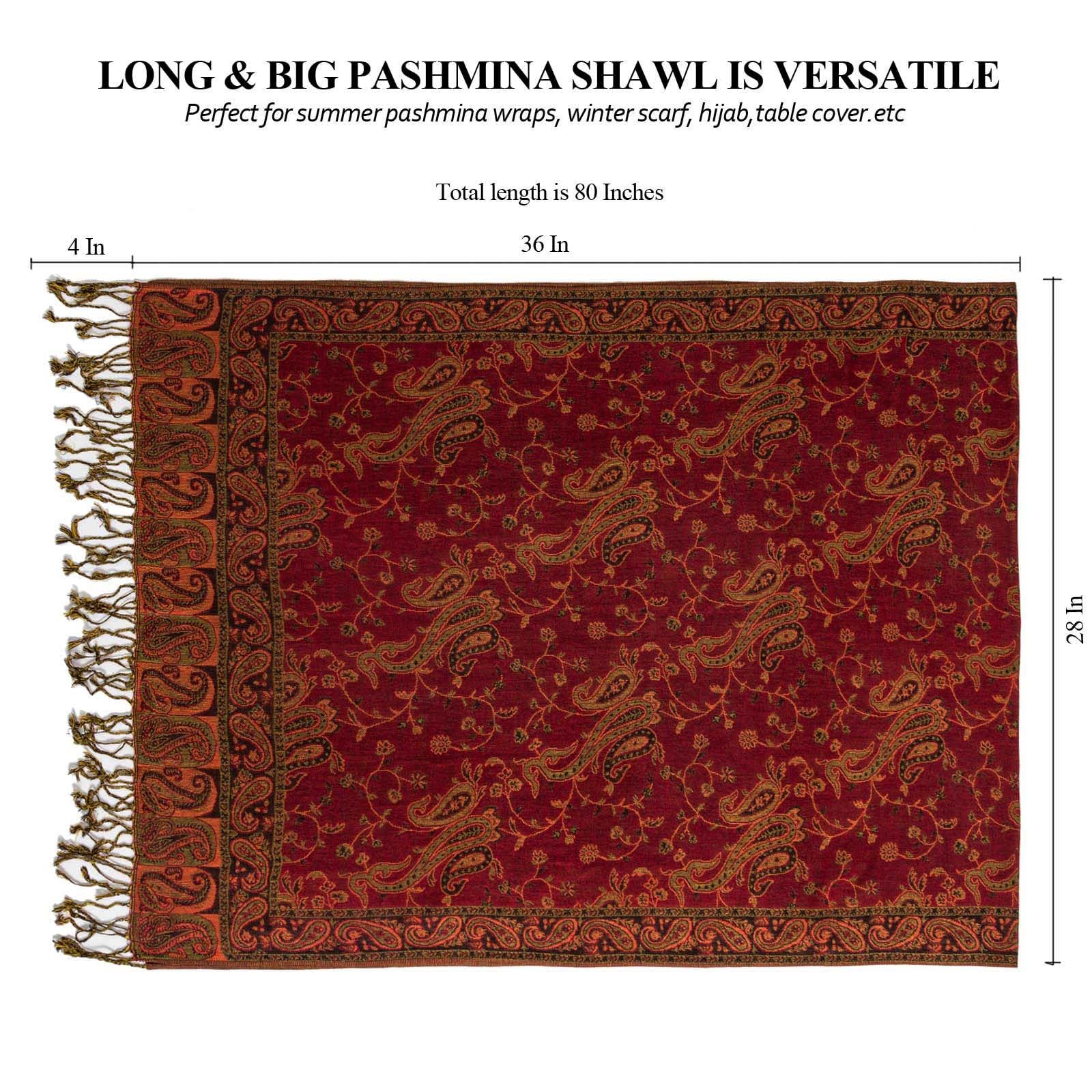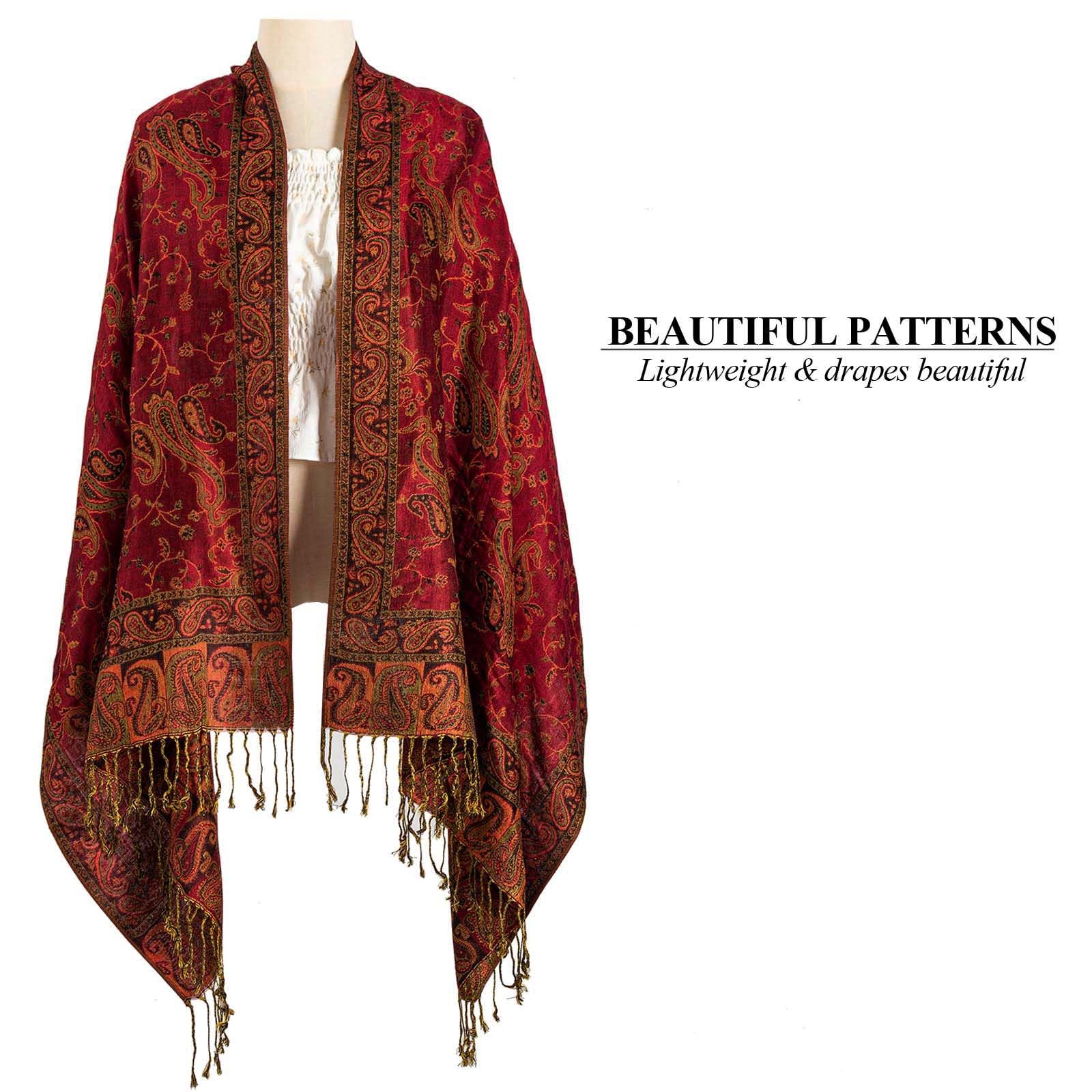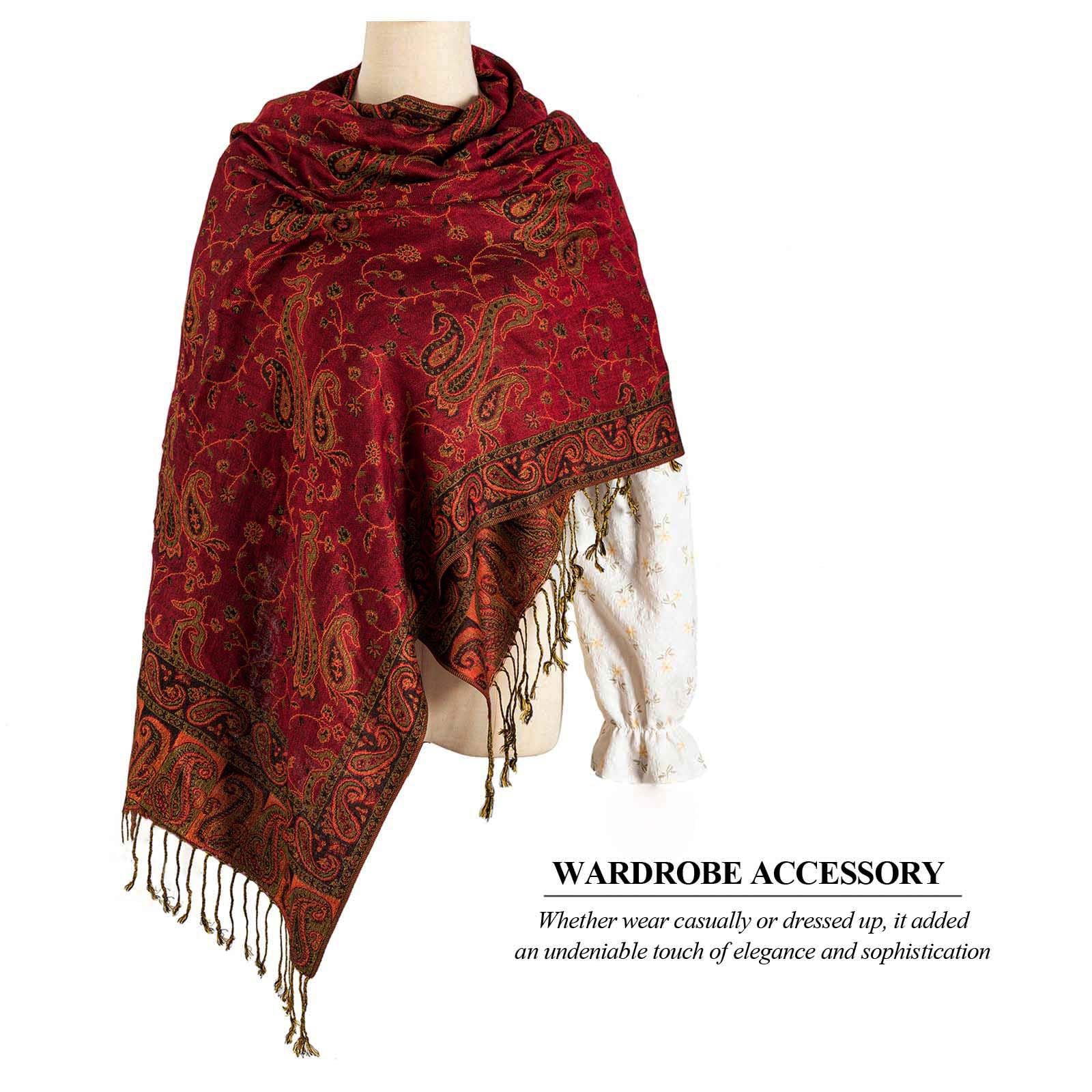 SUPER SOFT MATERIAL WITH SILKY SHEEN: AUSEKALY pashmina feel wraps for women are made of high-quality material, lluxurious soft feeling, smooth and skin-friendly, you will love the feel of it around your neck, not scratchy, no fade; Exquisite women shawls are rich in color and sheen, nicely woven pashmina feel design, elegent and stylish; Scarf for women is long and wide ( (length is 72" + 8" fringes and width is 28"), nice and big to wrap around you.