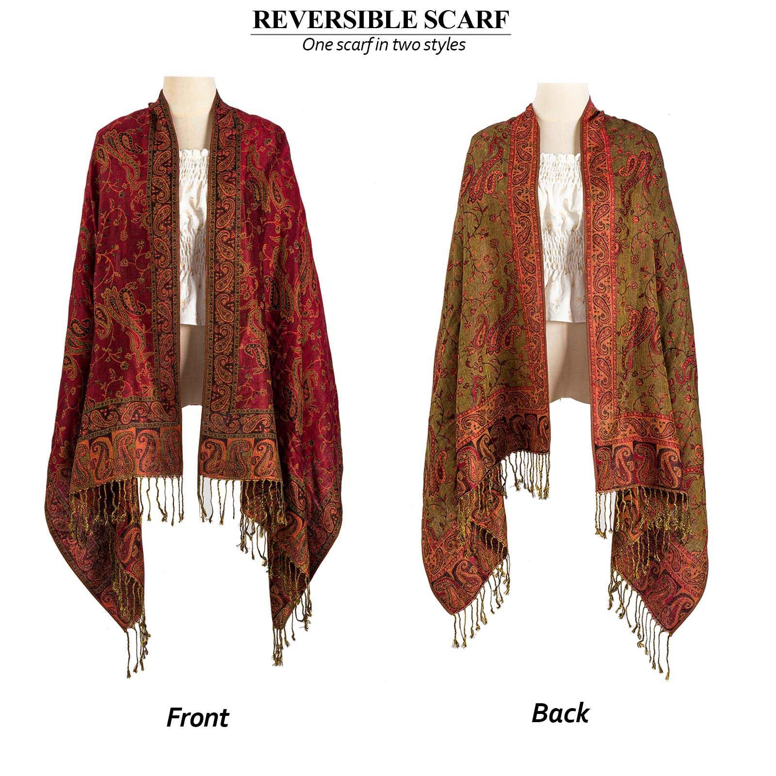 VERSATILE SCRAF FIT ANY OCCASION AND SEASON TO BRIGHTEN YOU OVERALL LOOK: Long & wide pretty pashmina feel scarf is very practical, you can use it as a warm winter scarf, formal shawl wraps for evening or wedding dresses, hijab, skirt, even as curtain, table cover, etc. brighten your outfit or room. It keep you cool under the sun and keep you warm at summer night, air conditioned rooms and cold winter. Reversible scraf is one scarf for two style, versatile, lightweigt, portable for travel.