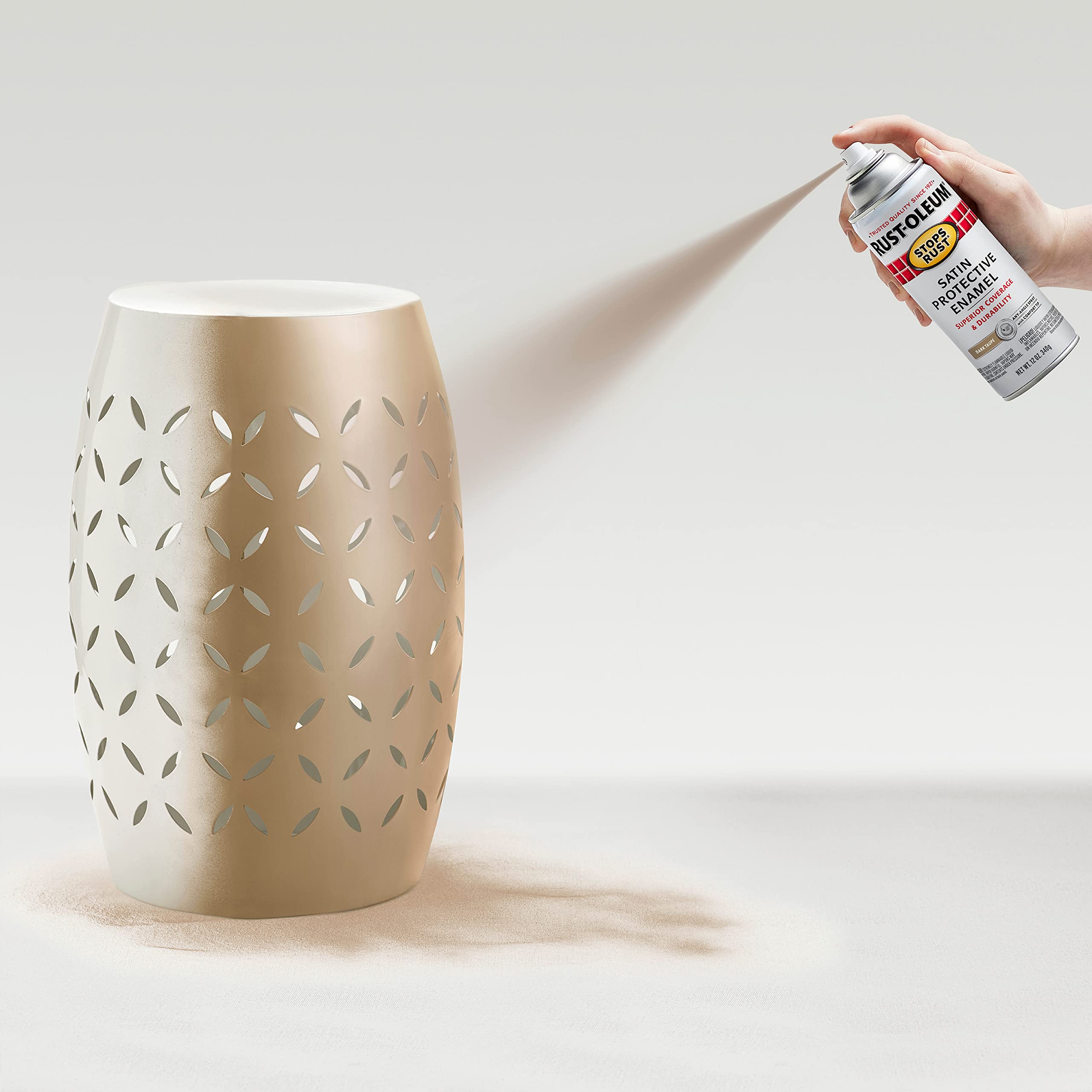 Product Description Rust-Oleum Stops Rust Protective Enamel Paint is the No. 1 rust-preventive paint available, provides lasting protection and beauty in a wide variety of colors and finishes. It features any-angle technology that allows to spray hard-to reach areas, even upside down and a comfort tip with a wider finger pad to reduce fatigue caused by continuous spraying. From the Manufacturer Rust-Oleum Stops Rust Protective Satin Enamel is the No. 1 rust-preventive paint available. Can be applied to lightly rusted surfaces with out primer. Can also be applied to wood, concrete or masonry.