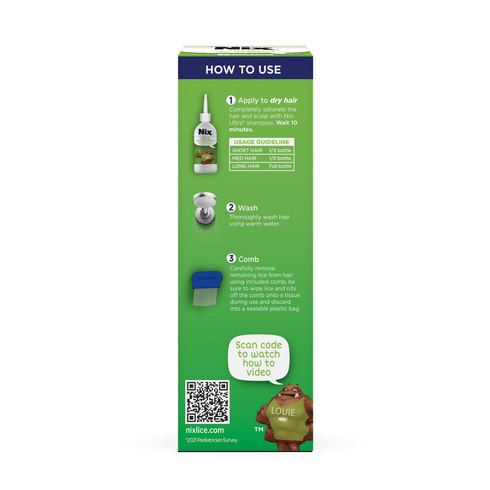 From the number one pediatrician-recommended lice removal brand.* Nix Ultra Lice Treatment All-in-One Shampoo is specifically designed to kill superlice. Superlice are the dominant species of head lice and are resistant to traditional pesticide lice treatments. Nix Ultra treatments are pesticide-free and non-toxic. They work by killing lice and superlice through suffocation rather than using harsh chemicals. First, apply Nix Ultra All-in-One Shampoo to hair. Then, remove lice and eggs (nits) from head hair with the Nix Ultra Lice Removal Comb. Nix Ultra All-in-One Shampoo is for use on head hair and safe for use on children 1 year and older. No additional shampoo is needed-, Nix Ultra lice shampoo cleans hair while killing superlice and eggs (nits). Nix lice treatment is trusted by parents and feared by lice. Nix offers a variety of lice combs, shampoos, treatment kits, hair prevention spray and lice spray for furniture and bedding to nix out lice in your home. *Based on Pediatrician Survey December 6, 2022.