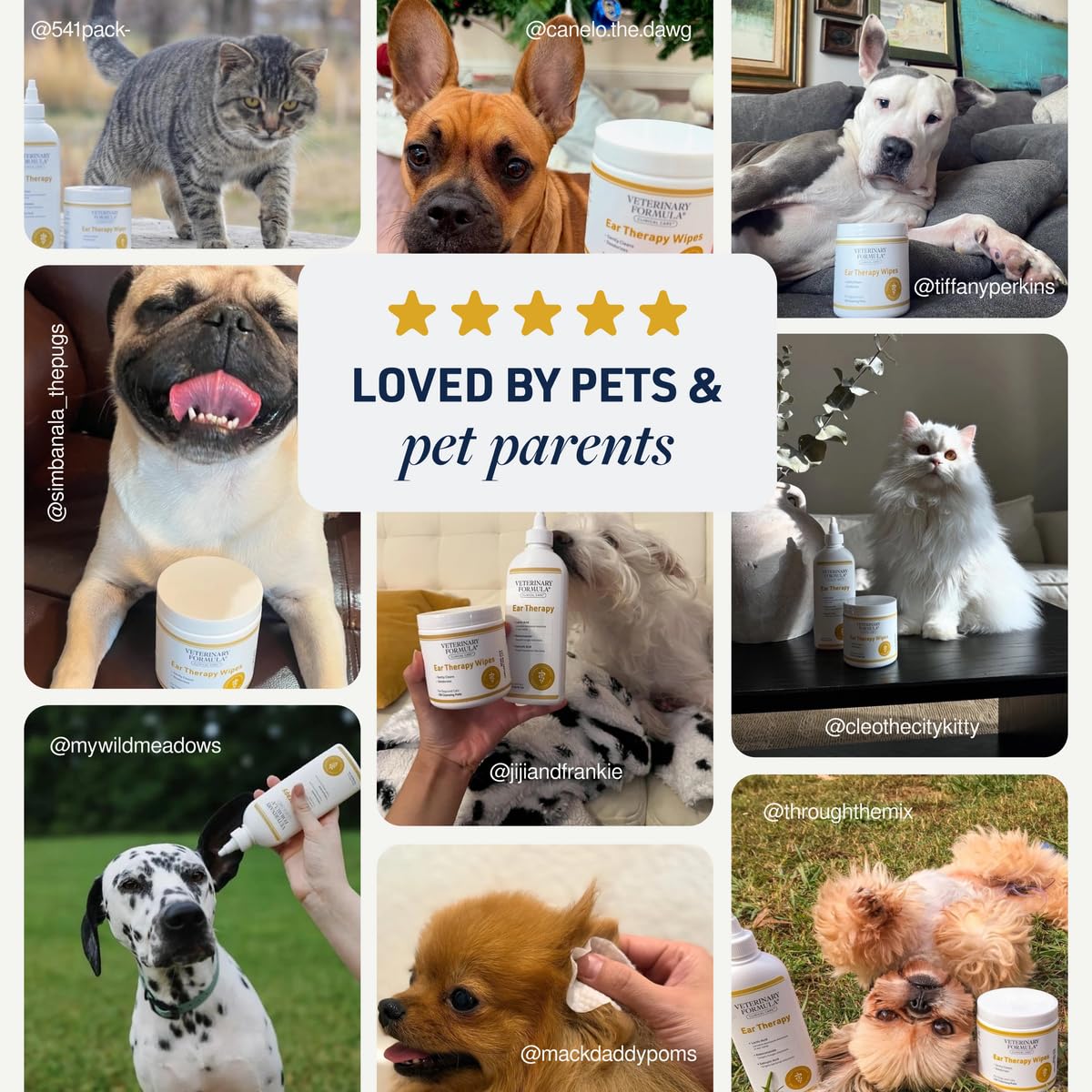 As pet owners, we know how important it is to take care of our furry companions, and their ear health is no exception. Introducing the Veterinary Formula Clinical Care Ear Therapy Wipes, the perfect solution to support healthy ears and help stop potential infections in both dogs and cats. These 100-count ear wipes are designed to be gentle and effective, providing a quick and simple routine to maintain your pet's ear hygiene. Taking care of your pet's ears is vital to their overall well-being. Ear Therapy Wipes are your go-to solution, must-have dog necessities. Gently wiping the outer ear helps remove dirt, debris, and wax buildup that can lead to infections and discomfort. By using these wipes regularly, you can help with potential ear issues and ensure your pet stays happy and healthy. Does your dog suffer from swimmers ear? Moreover, these wipes effectively deodorize foul odors. Their advanced formula helps keep moisture out of your pet's ears, reducing the chances of smelly ears, which can often be a result of trapped moisture. Combining thorough cleansing and moisture control makes this ear cleaner for dogs and cats an indispensable part of your pet care routine. Understanding that pets can have sensitive ears, our wipes are thoughtfully designed to be gentle and soothing. Unlike many other products, these wipes are alcohol-free and non-irritating, making them perfect for pets with sensitive ears. This means you can use them frequently without worrying about causing discomfort or irritation to your furry companion. With these wipes, you can effortlessly clean your pet's outer ear and the surrounding area without any hassle or mess. Your pet's routine won't be disturbed, allowing for a stress-free ear-cleaning experience. It's the perfect solution for pet owners who seek an efficient and effective way to keep their pets' ears clean and healthy.
