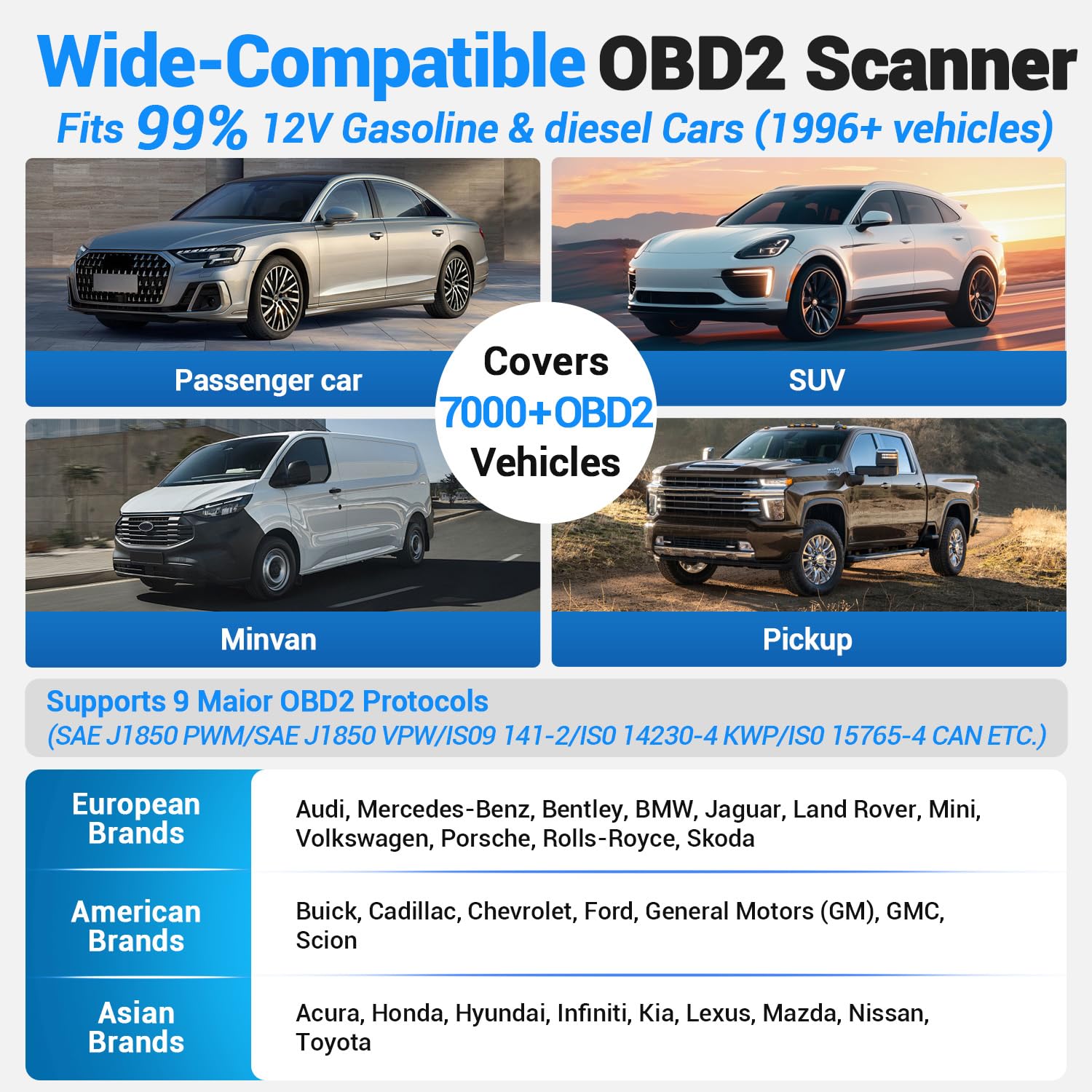 Works with Almost All 1996+ Cars & Small Trucks: Worried about compatibility? This full-function obd2 scanner supports every OBDII protocol (KWP2000/ISO9141/CAN/J1850), fitting 98% of 1996+ gasoline vehicles and 2006+ diesel small trucks in the US. Auto VIN even identifies your vehicle automatically—beginners can use it right out of the box, no setup hassle.