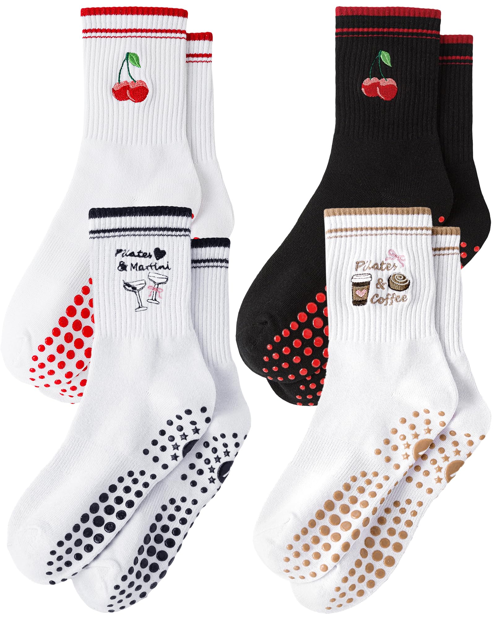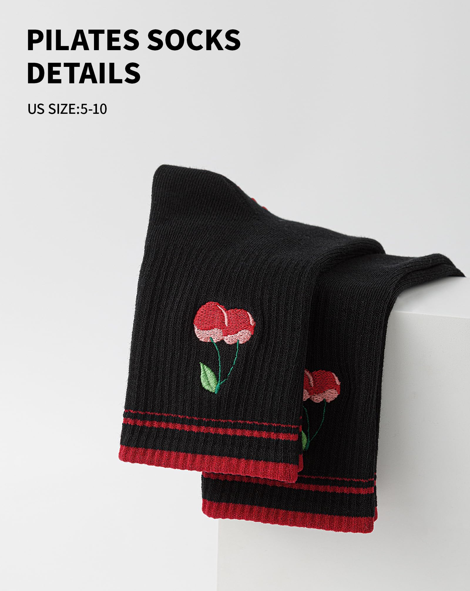 【Fashionable Cherry and Stripe Design】 This Pilates sock is adorned with a unique cherry element, featuring lifelike red cherry patterns that add a pop of color and symbolize sweetness and vitality. The red stripes, on the other hand, create a visual effect that elongates the leg line, making your legs appear more slender. The overall design ensures you feel fashionable even while exercising.