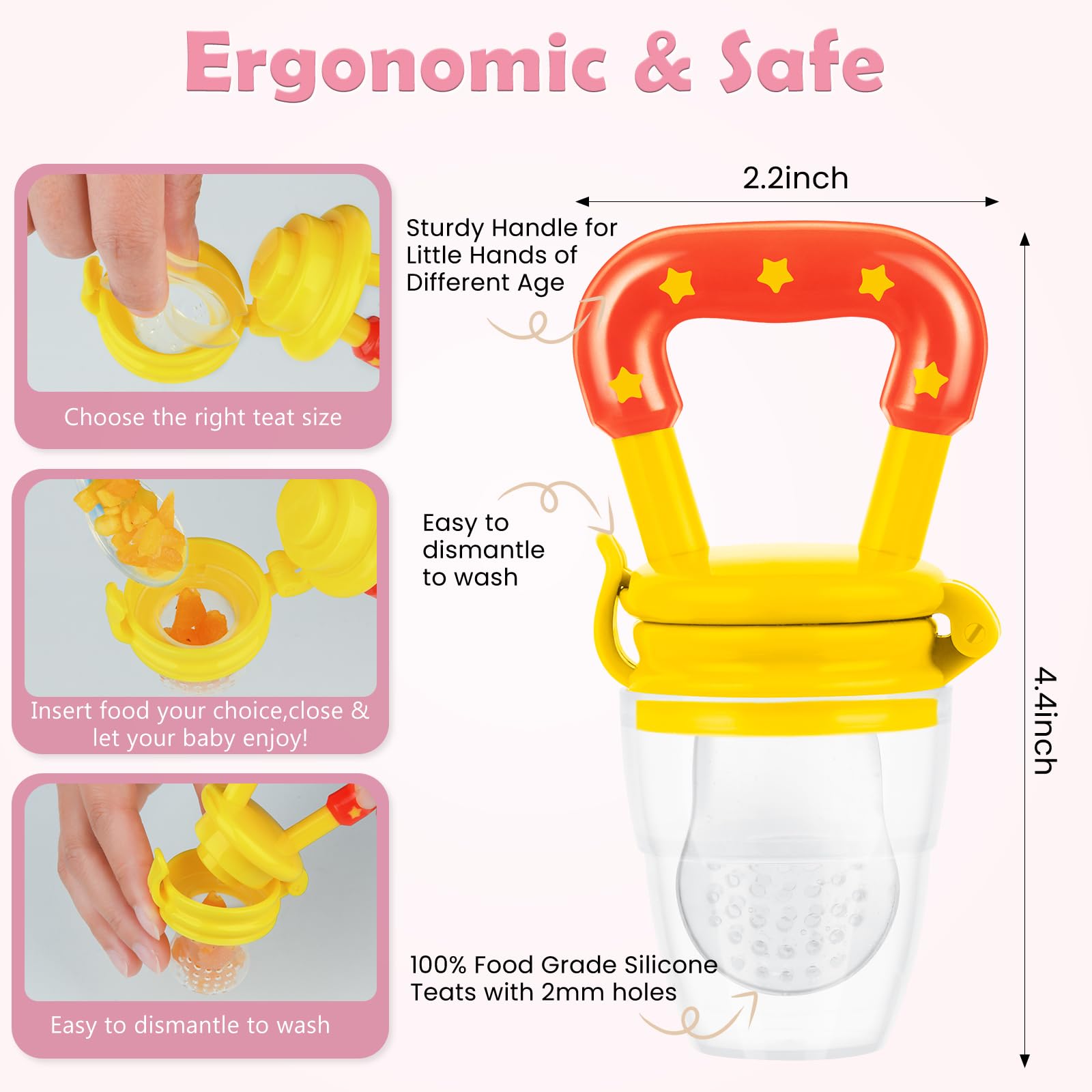 【Easy to Clean】: WAJIAYON baby food/fruit feeder all parts are able to be taken apart for washing, every corner can be washed. Silicone infant feeder, steam/microwave/boil safe.