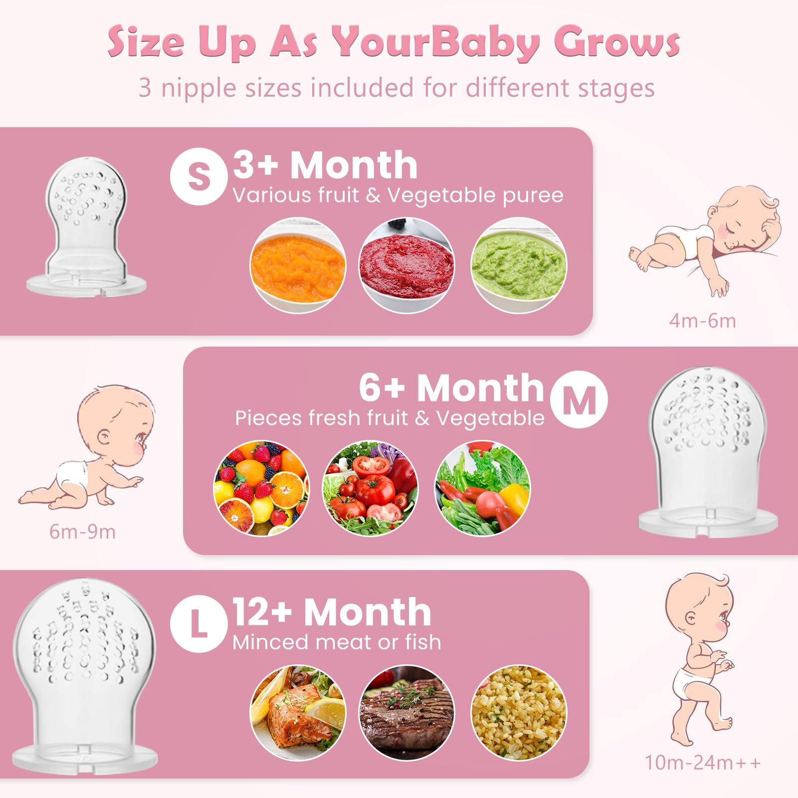 【ALL SIZES INCLUDED-Accompany with Your Baby Growth】:small, medium and large three sizes sacs are included in the fruit feeder package to fit different month age baby, S for 4-6 months, M for 6-10 months, L for 10 months+, you can choose the suitable size for your baby at different months.