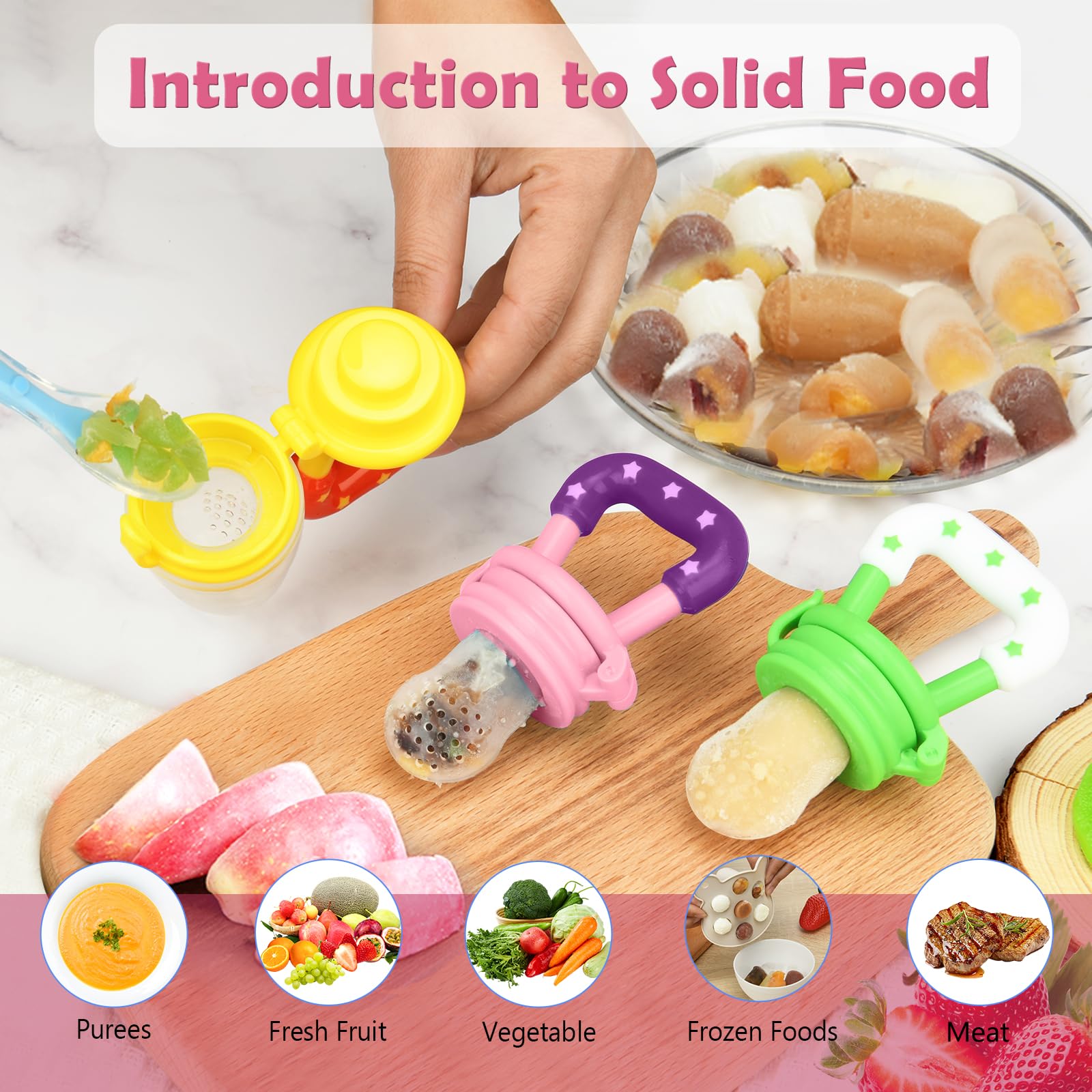 【 MULTI-FUNCTIONAL-Safely Introduce Solids】: Baby food feeder pacifier-a perfect way to introduce solid to baby, soft silicone food pouch with 2mm small holes only allow small, digestible pieces to pass through to ensure safe feeding. Just put frozen fruits,vegetables, meat fish or frozen pieces, frozen breastmilk, your baby will enjoy tasting, sucking and chewing on.
