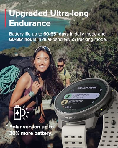 EXTREME BATTERY LIFE: Up to 500 hours of continuous exercise tracking in tour mode & up to 60 hours in the most accurate tracking mode. Boosted a further 30% by solar charging on sunny days (Titanium model only)