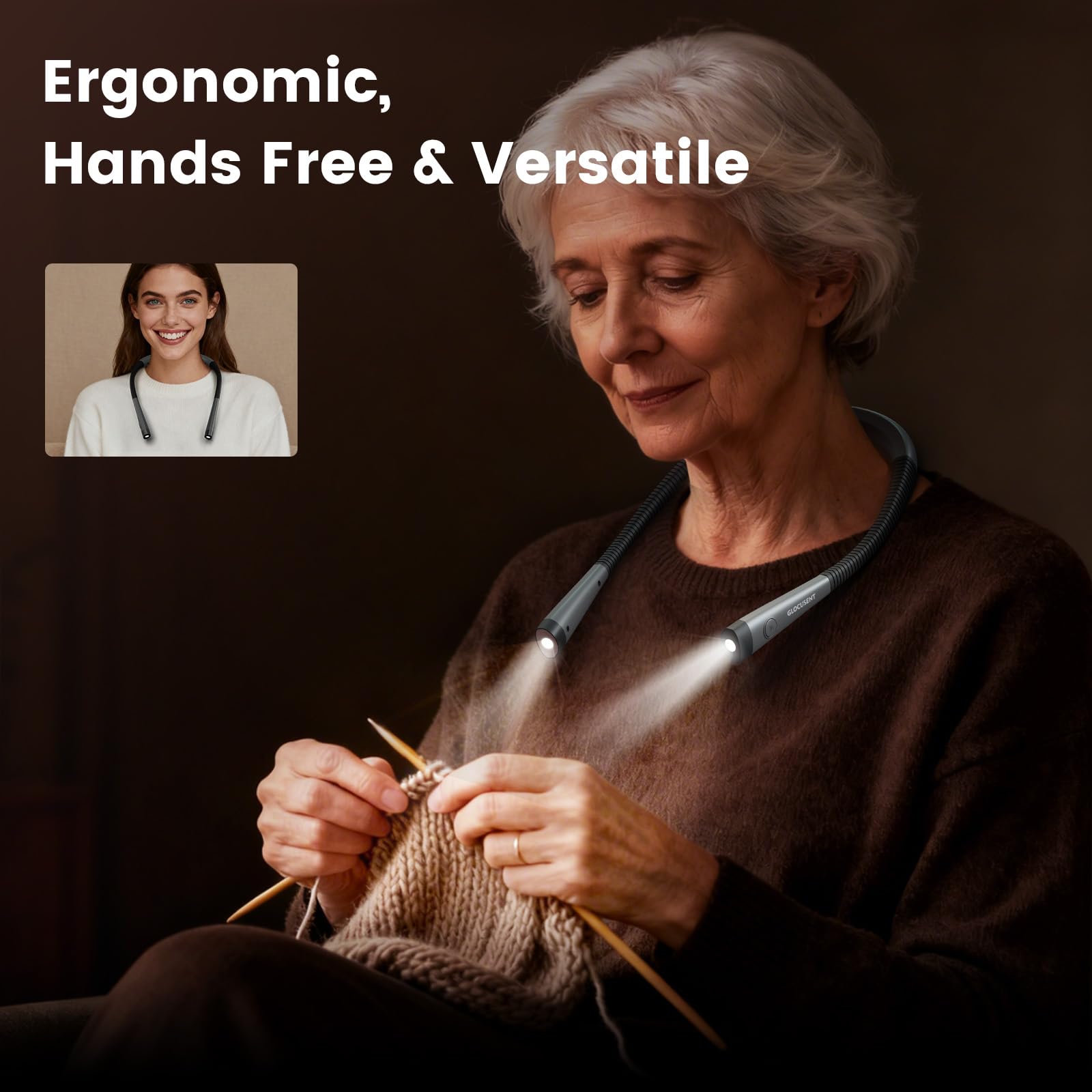 [Partner Friendly & Versatile] Unlike other book lights for reading at night, the Glocusent neck book light has a special narrow beam angle (90°) design. It is bright enough to illuminate the area you focus on while being dim enough not to disturb your sleeping partner. Additionally, the hands-free feature allows you to engage in various delicate activities such as knitting, walking, repairing, and more. Make it a perfect versatile needlepoint light.