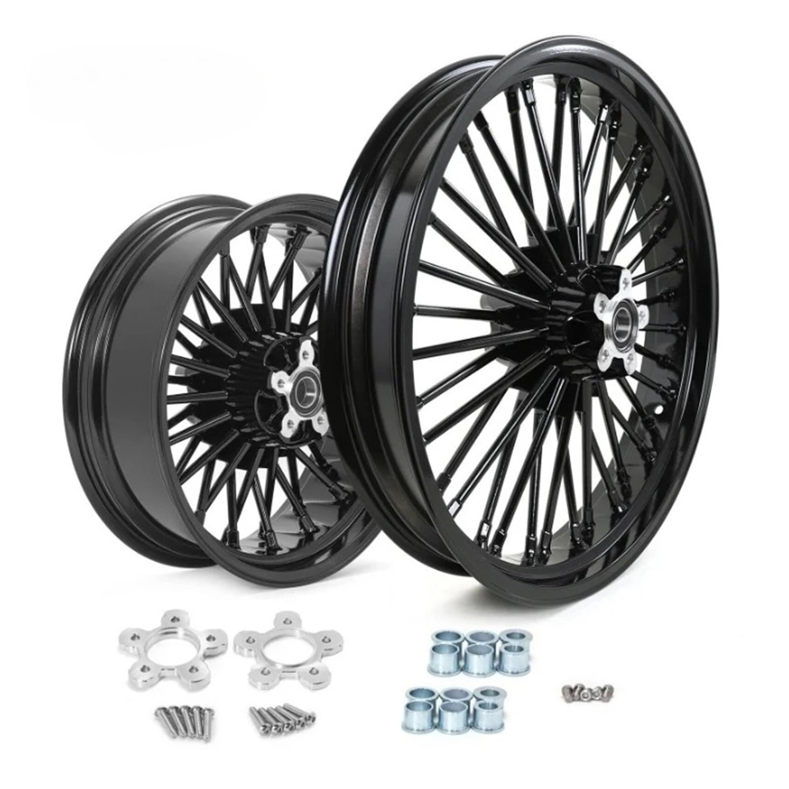 Universal fit for Harley Touring Bagger Bike 1984-2008, and most of Dyna & Softail Series Choppers Bobbers and Custom bikes but ABS and most Sportster Models will not fit Wheel Size Front Cast Wheel 21x35 with 36 Fat King Spokes Rear Cast Wheel 18x55 18x35 16x55 16x3.5 with 36 Fat King Spokes Bearing Size: fits 25mm, 3/4" and 1" bearing due to wheel bearing reducers for free We provide wheel bearing reducers and rotor pulley spacers for free Specification: Material: Made of Aluminum A356, much lighter than other steel wheels Design: Fat Spoke, Light Weight and Tubeless Design Color: Gloss Black, make your bike look cooler than others Surface Finished: Powder Coated Other Size available: 21x3.5, 21x2.15, 18x3.5, 16x3.5, 18x5.5 Package included: 1 PC Fat Spoke Front Wheel with Reducers and Bolts 1 PC Fat Spoke Rear Wheel with Reducers 2 x 10mm Rotor Pulley Spacer with 10 Bolts Tech Note: -Due to free Reducers and Rotor Pulley Spacers, this wheel can well fit for Harley Touring Bagger Models 1984-2008 -You may need wheel axle spacers to adjust the wheel, we have 19mm/25mm/26mm in stock, if you need, contact us -Rotors with ID 56mm can fit for our wheels, 84-99 Models with ID 50mm will require 2000+ style rotors Model Name : 3621 3622 3623 3624 Origin : Mainland China Item Height : 57.5 Item Length : 57.5 Item Type : Rims Item Weight : 16kg Item Width : 57.5