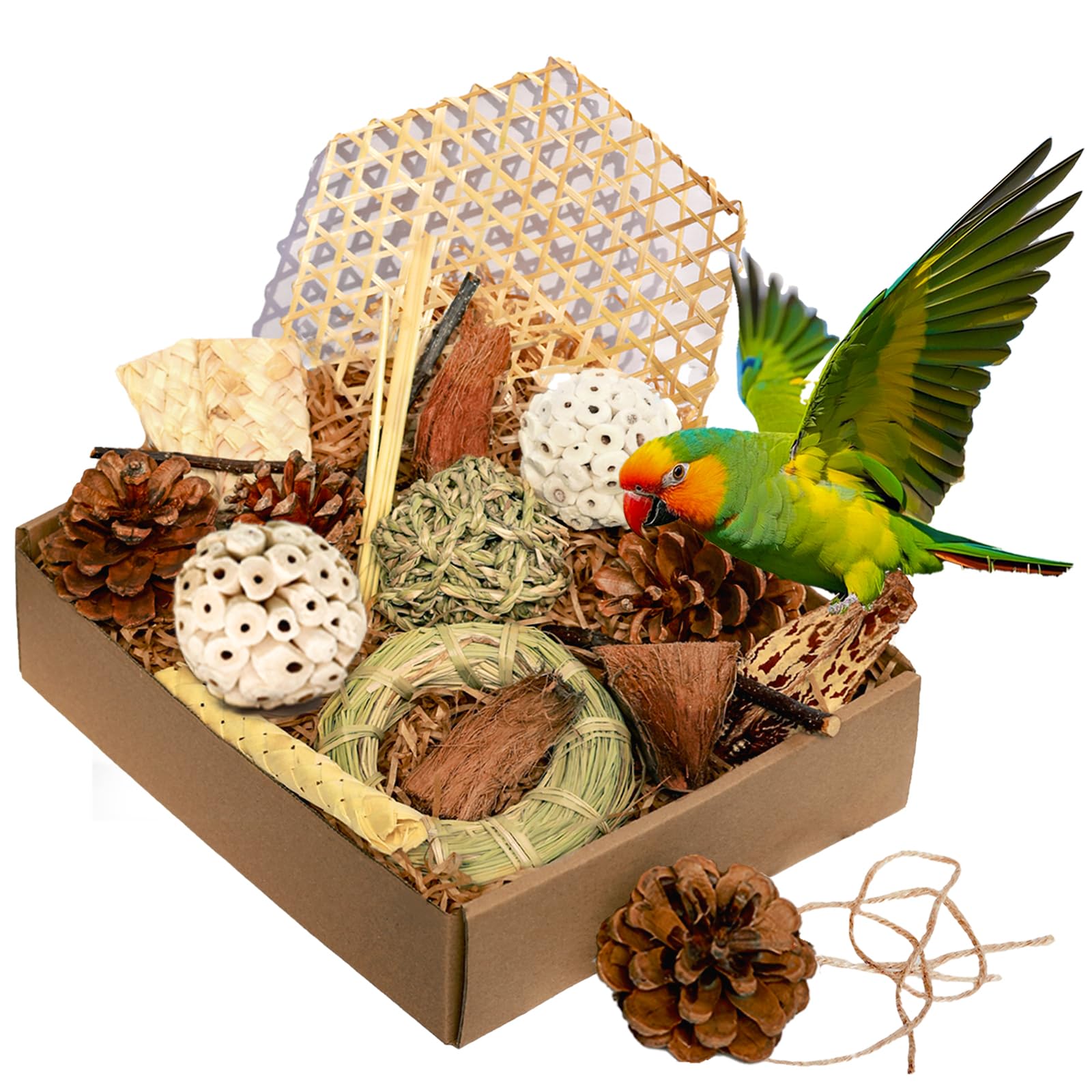 Boosts Natural Foraging Skills: Whether the apple wood, coconut, seagrass, cornor,wicker ball or the pine cone—has a range of sizes, shapes, and texture,encourages your bird's natural instincts by providing a variety of textures and materials to explore, chew, and shred, perfect for mental stimulation and physical activity.