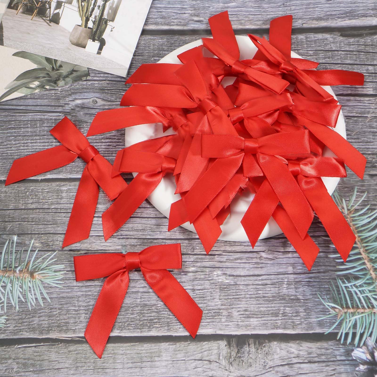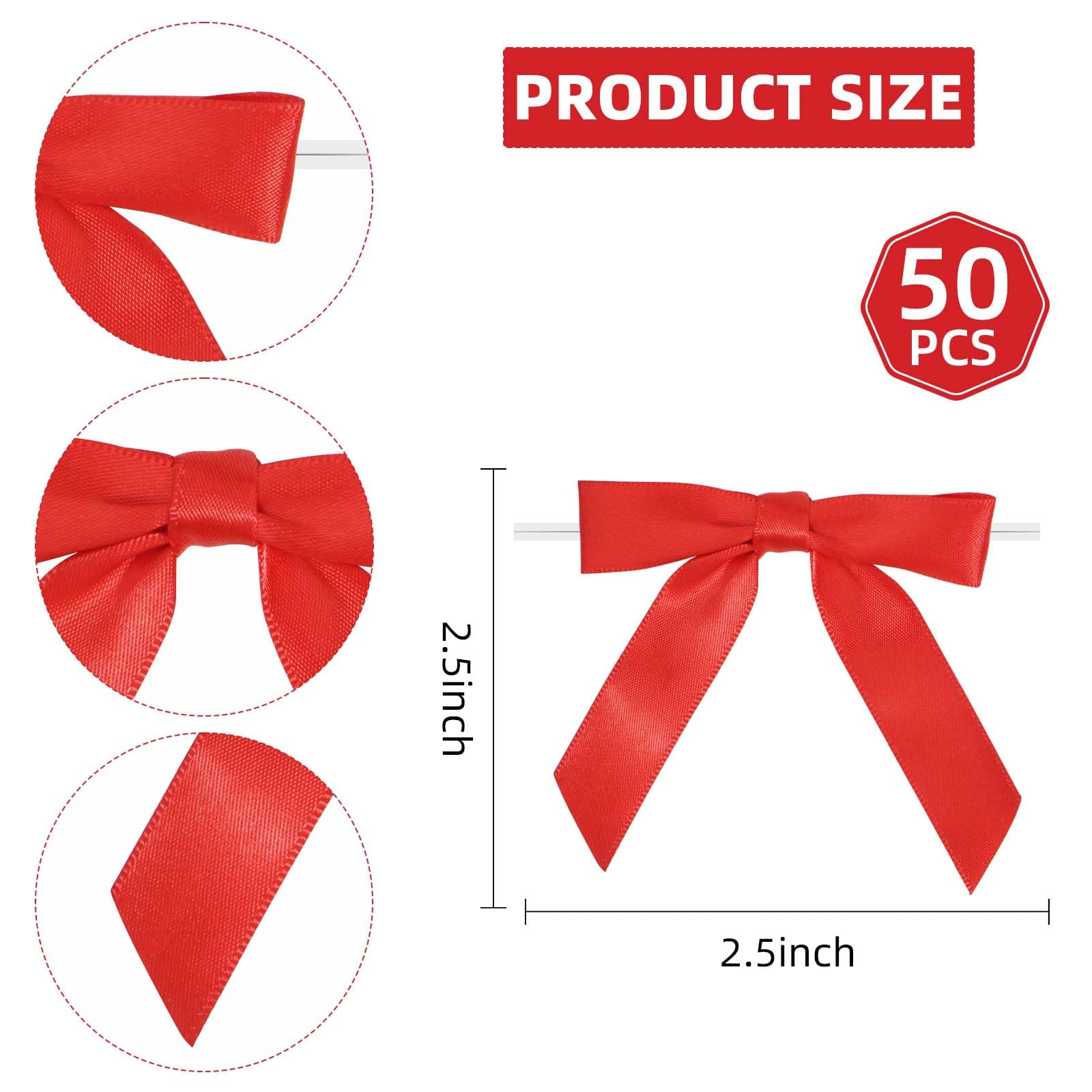 【 Package Content 】 You will receive 50 pieces red satin bows with twist ties. Saving time from having to make the bows yourself.
