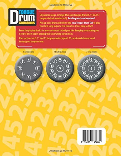 Lena Eckhoff Tongue Drum Songbook 50 popular songs for Tongue Drum Popular songs, arranged for easy tongue drum (8, 11 and 13 tongue diatonic models in C). Reading music not required! Pick up your drum and follow the easy Tongue drum TAB to play your first song in just a few minutes–it’s as easy as that! From the playing basics to more advanced techniques like damping: everything you need to know about playing this fascinating instrument. Plus sections on 8, 11 and 13 tongue models layout, TD care & maintenance and tuning your tongue drum.Songs 1. All the good times are past and gone 2. Amazing grace 3. Banks of Sacramento 4. Beautiful brown eyes 5. Brahms’ Lullaby 6. Buffalo gals 7. Camptown races 8. Colorado trail 9. Cotton-eyed Joe 10. Cumberland Gap 11. Down by the riverside 12. Finnegan’s wake 13. Foggy mountain top 14. Give me that old time religion 15. Goin’ across the mountain 16. Good night, ladies 17. Home! Sweet home! 18. House of the Rising Sun 19. Jolly good fellow 20. Kum ba yah 21. London Bridge is falling down 22. Long journey home 23. Mary had a little lamb 24. Michael, row the boat ashore 25. Midnight on the stormy deep 26. Morning has broken 27. My Bonnie lies over the ocean 28. My home’s across the smoky mountains 29. Oh! Susanna 30. Old folks at home 31. Old Mac Donald had a farm 32. On top of Old Smokey 33. Over the river and through the woods 34. Poor Paddy works on the railway 35. Pop! Goes the weasel 36. Roll in my sweet baby’s arms 37. Row, row, row your boat 38. Scarborough Fair 39. Shenandoah 40. Swing low, sweet chariot 41. The first Noel 42. The last rose of summer 43. The wild rover 44. Tom Dooley 45. Twinkle, twinkle, little star 46. Up on the housetop 47. Way down the old plank road 48. What shall we do with the drunken sailor 49. When the saints go marchin’ in 50. Will the circle be unbroken