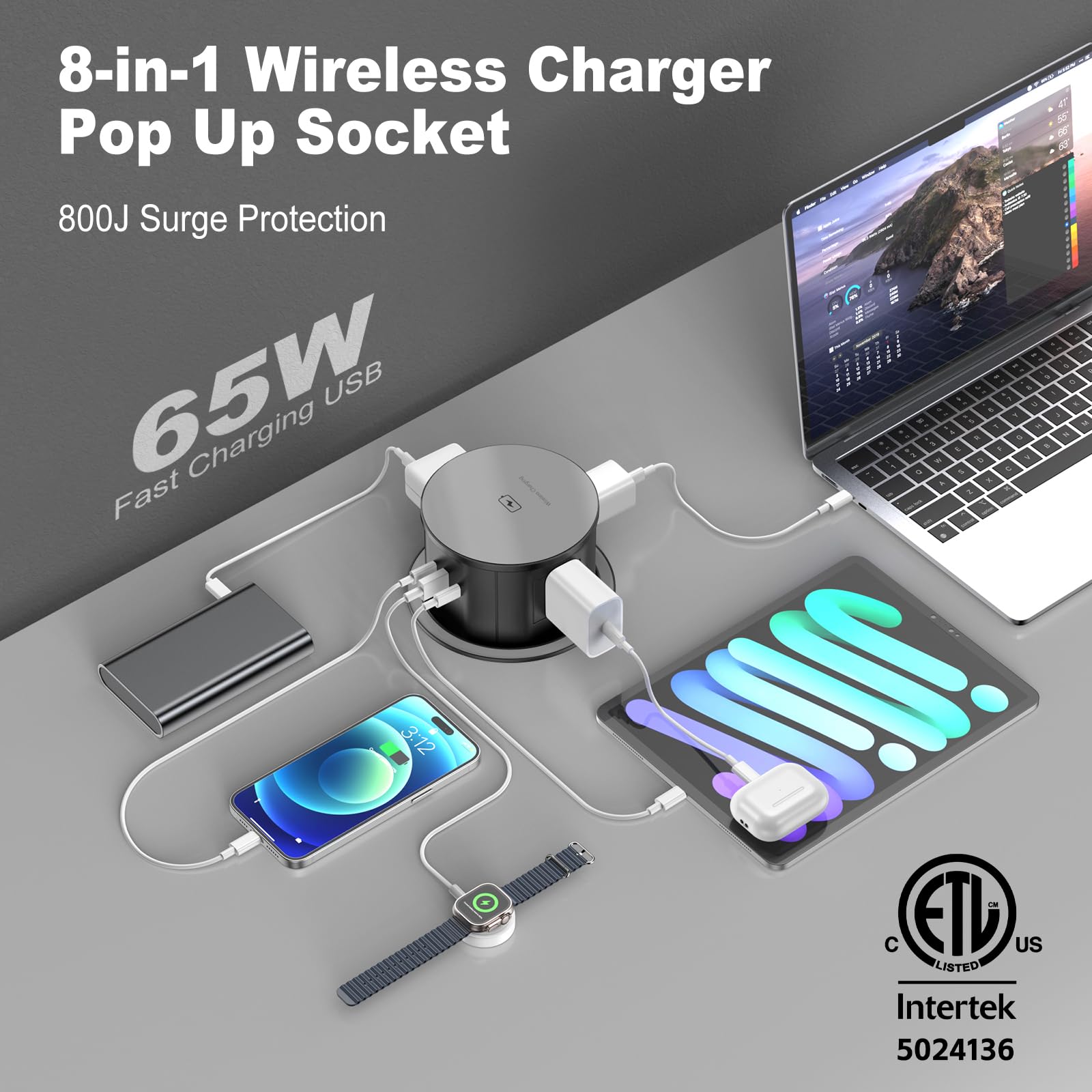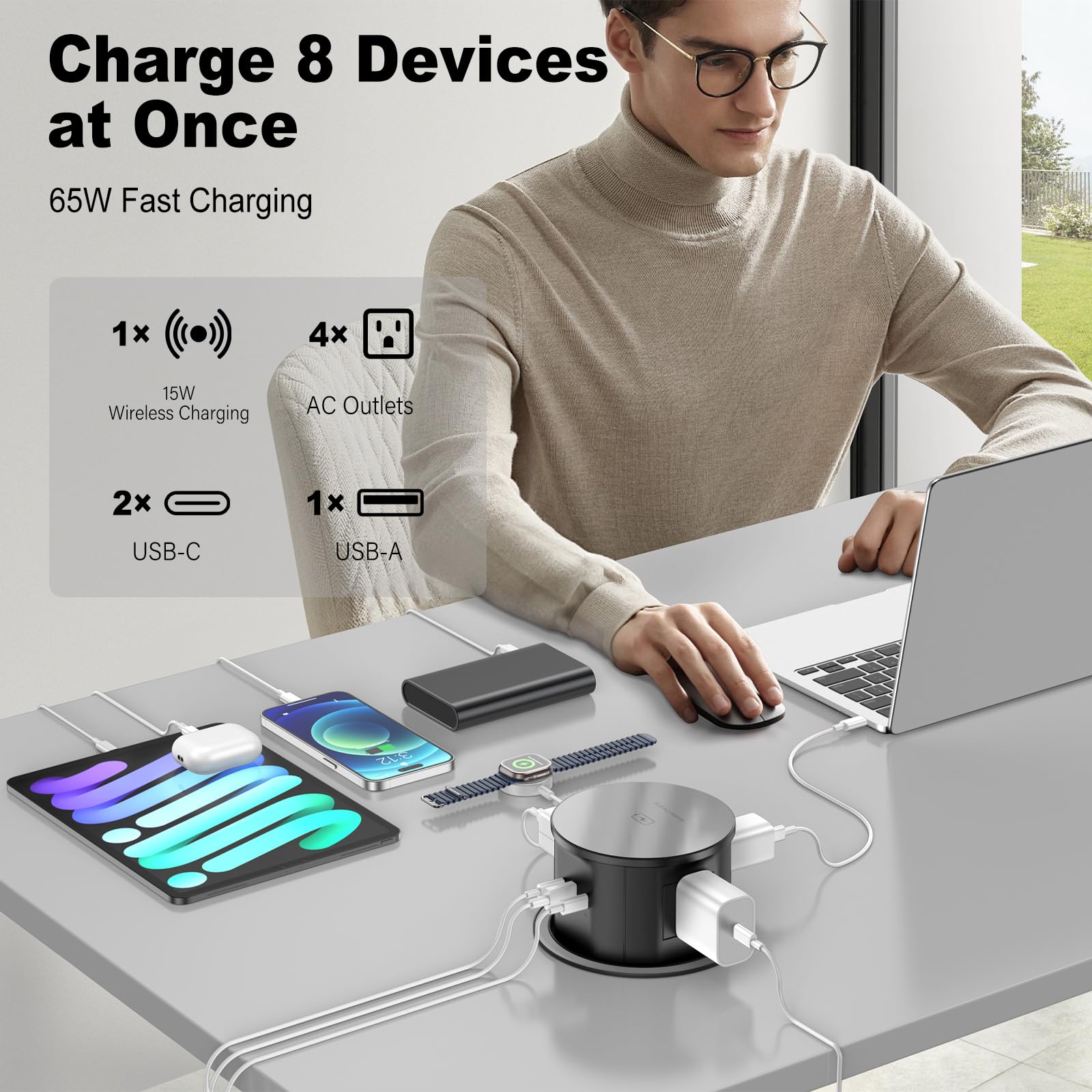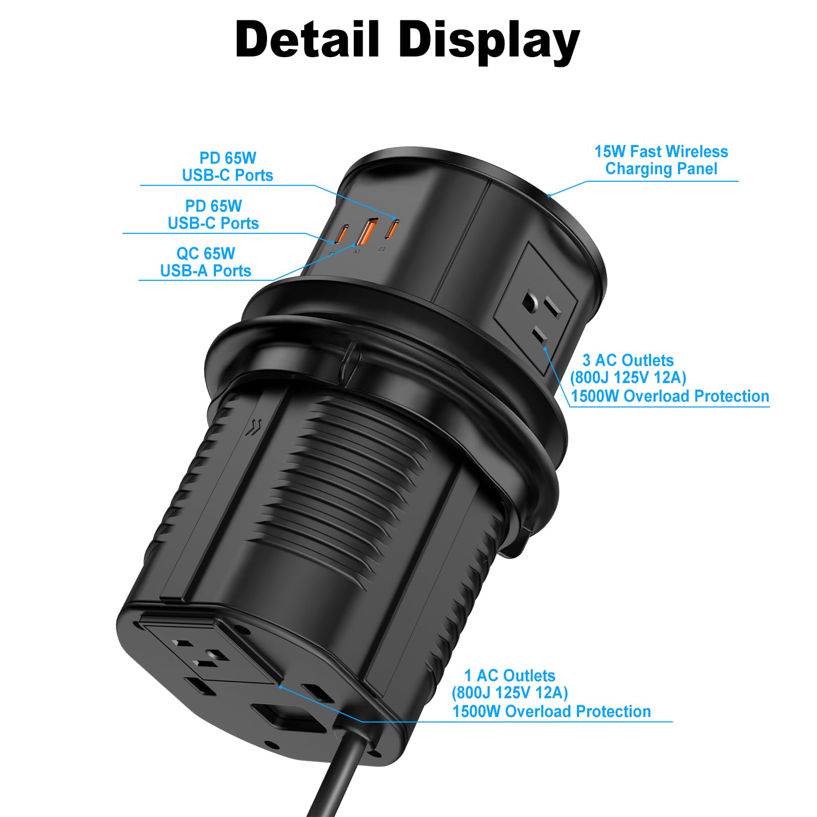 【Countertop Pop Up Outlet 】4 AC Outlets (12A/125V/1500W/800J), 2 PD 65W USB-C Ports & 1 QC 65W USB-C Ports, Multiple outlet and usb port better meet your need for devices.