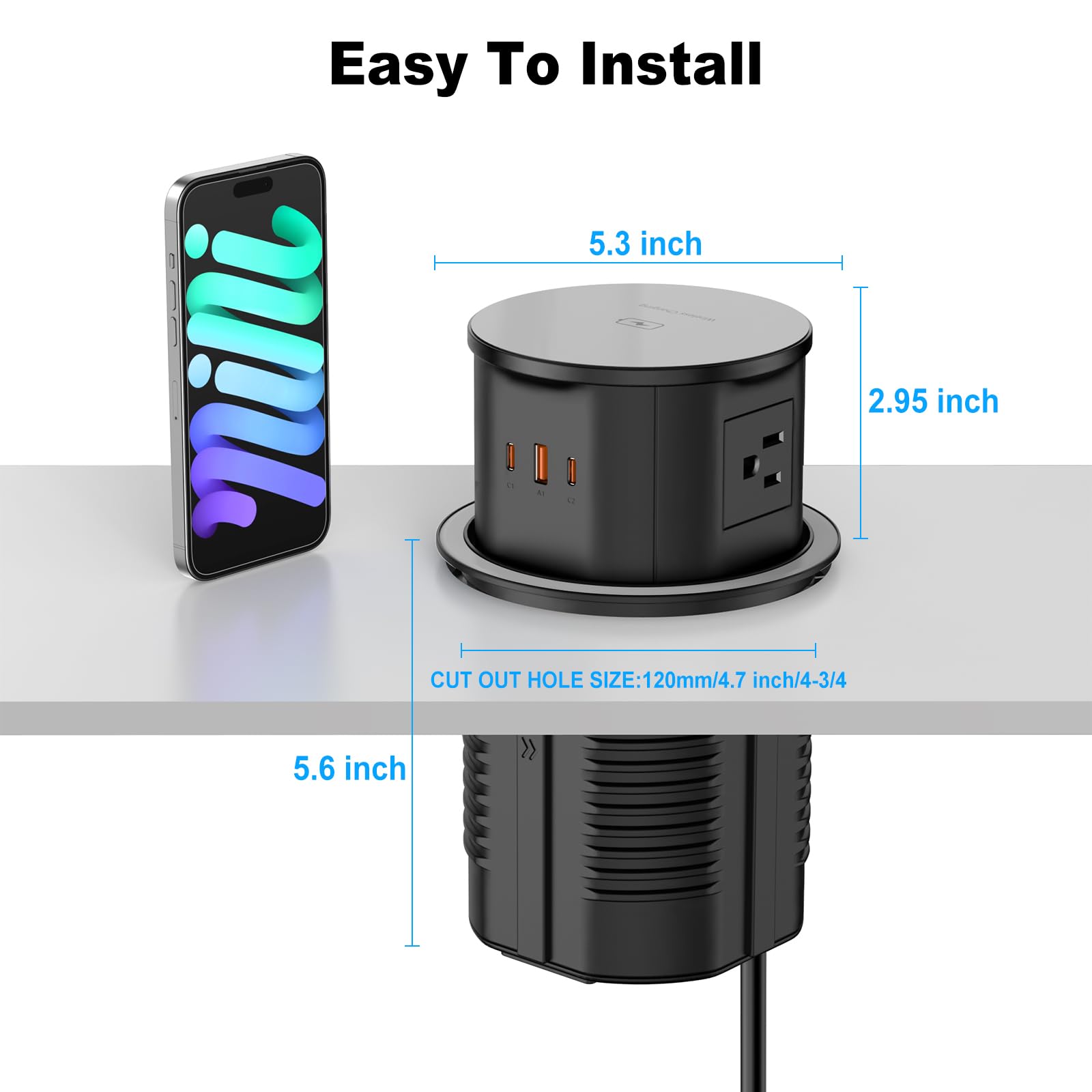 【Retractable & Hidden】Pop up outlet fits 4.75inch(120mm) hole size, Fully automatic retractable desktop design, Just press, Power outlet will automatic raise up.