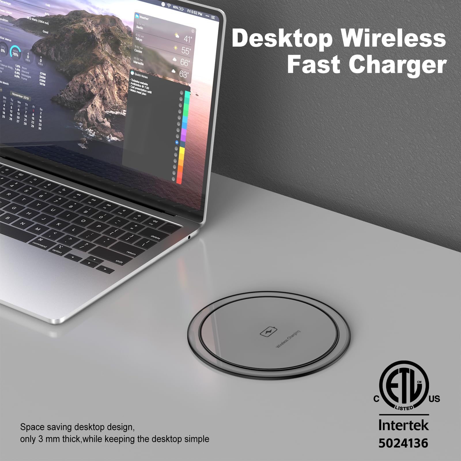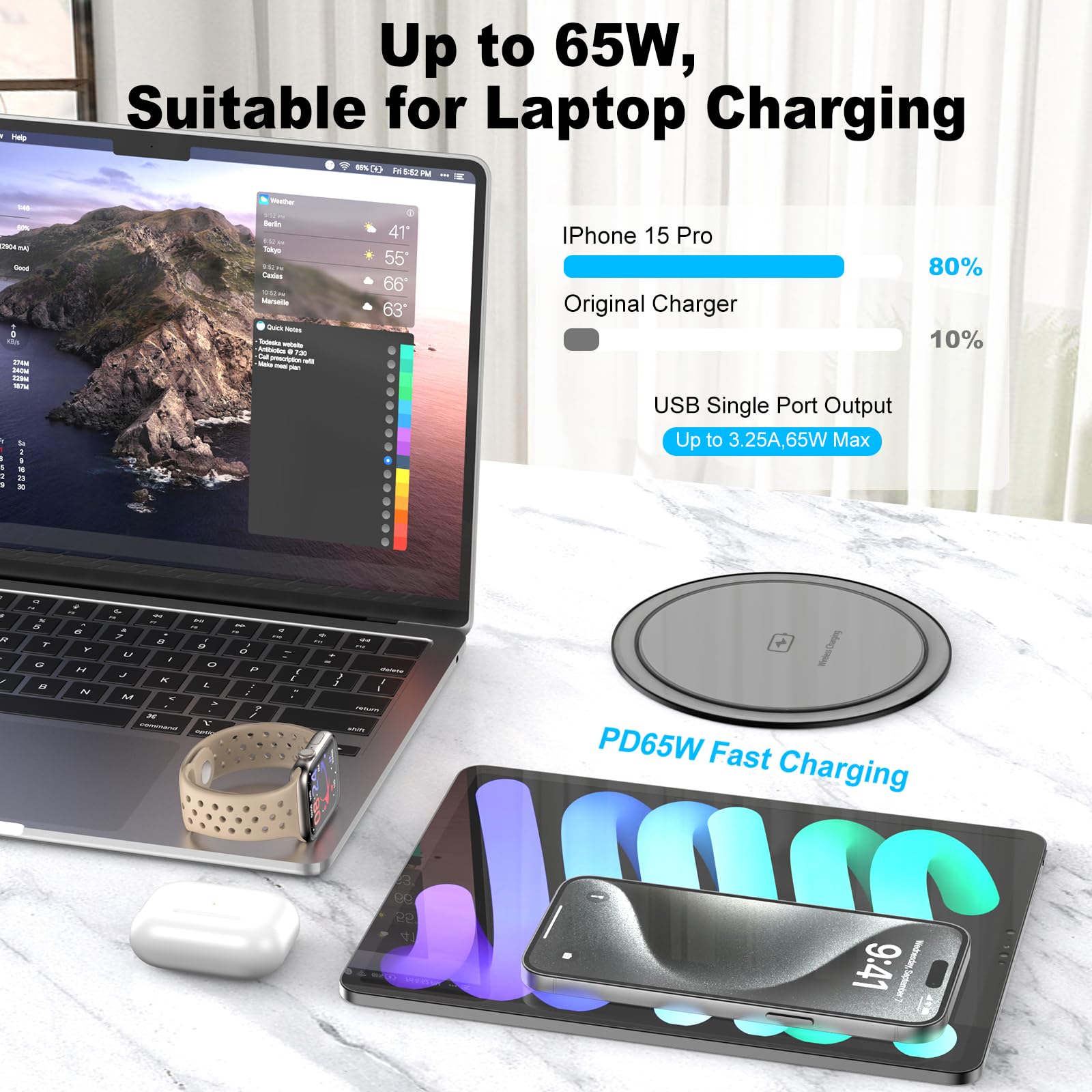 【15W Wireless Charging Station】Wireless charger on top, 15W max fast wireless charging pad, compatible with all devices which apply with Qi standard.