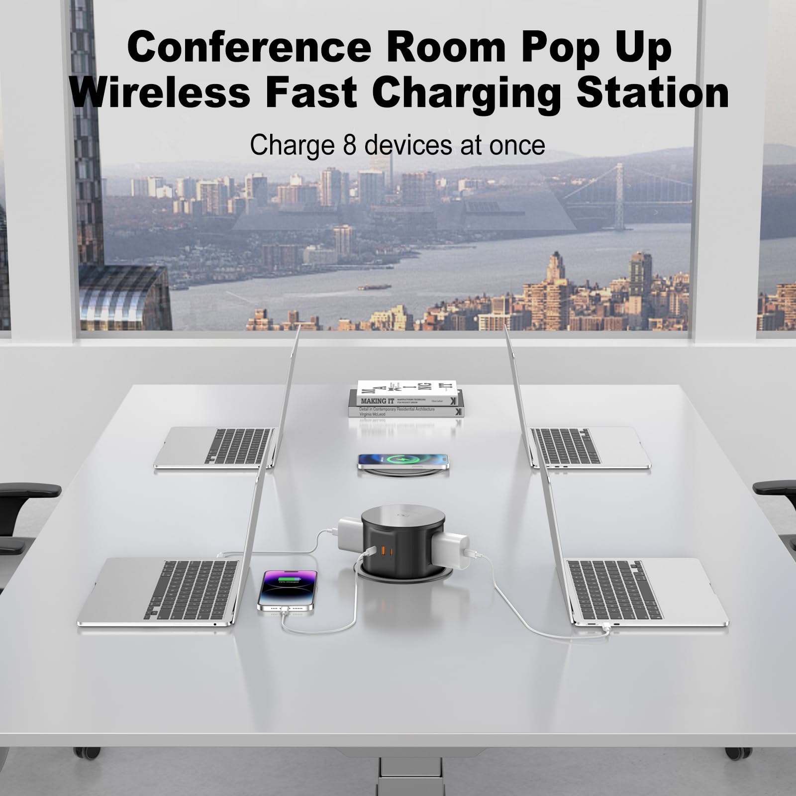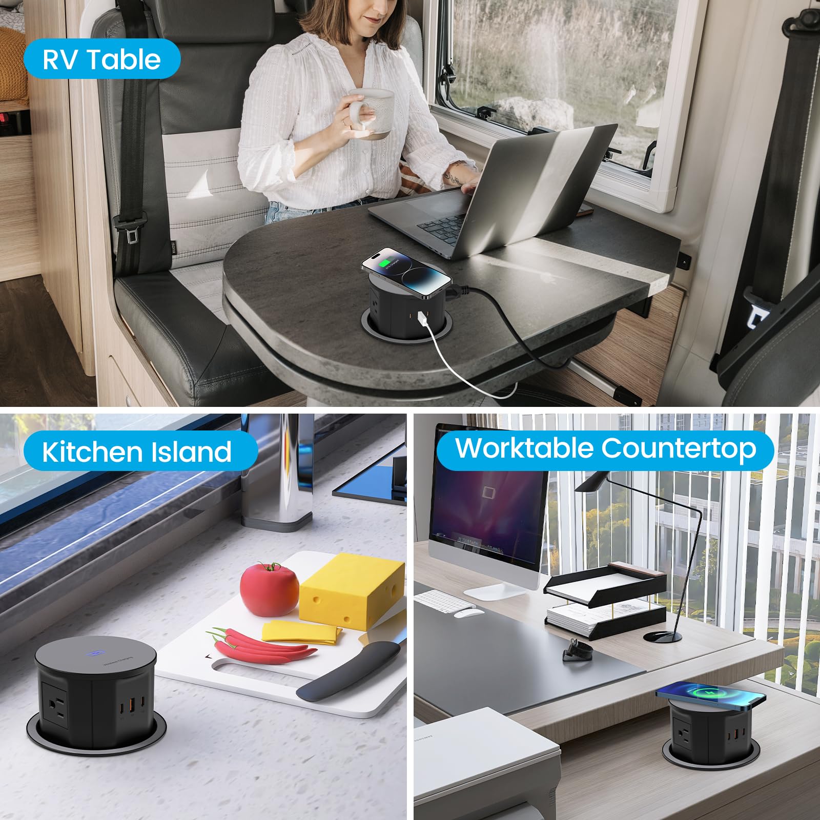 【Automatic Pop Up Countertop Outlet】Say goodbye to bulky adapters and tangled cords. This unique Recessed grommet power outlet Perfect for charging multiple devices at home, in the office, or at school.