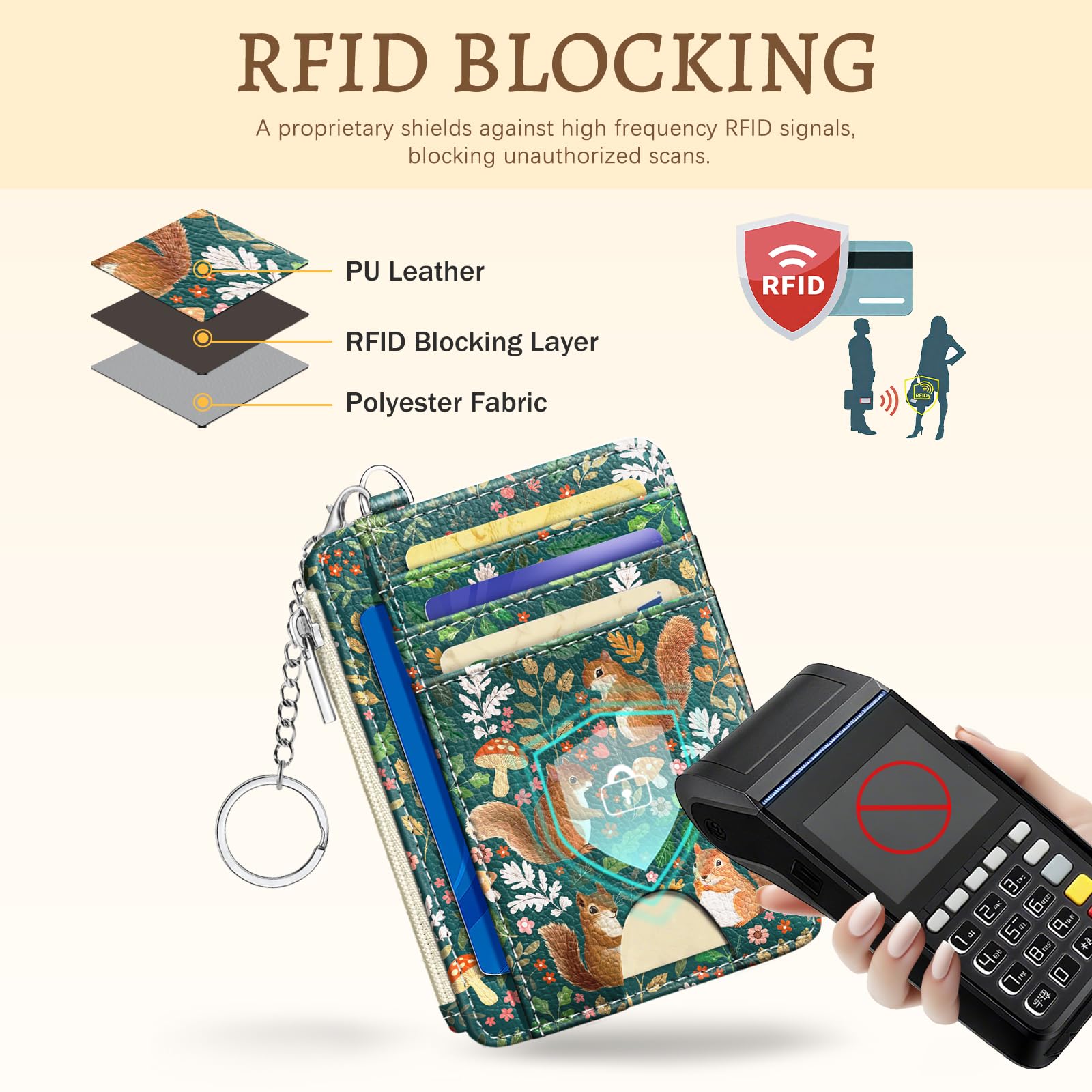 RFID Blocking: This slim wallet for women blocks electronic theft with advanced RFID blocking technology, keeping your cards and information secure. Made from PU leather, this keychain wallet features a smooth-gliding zipper and reinforced stitching for enhanced durability